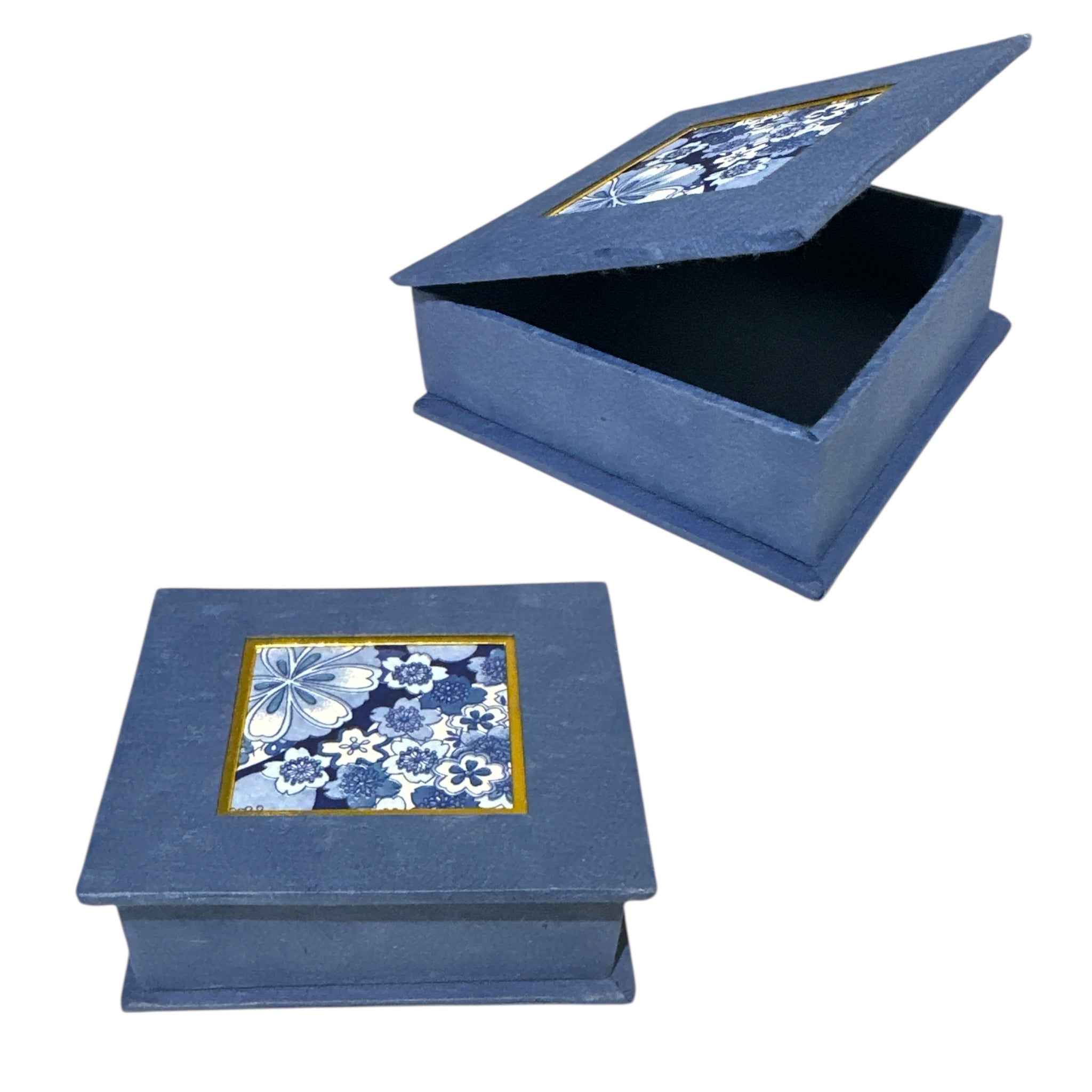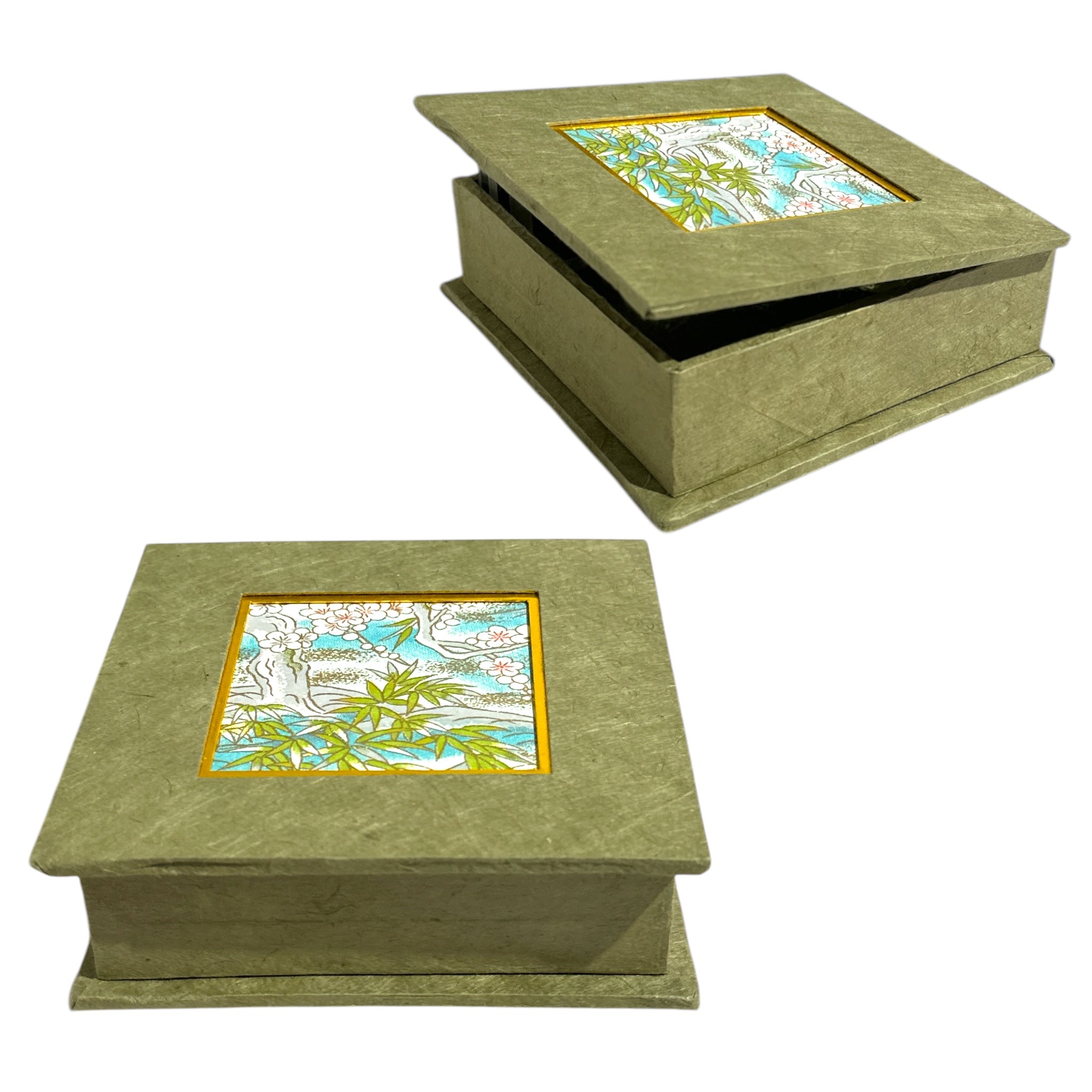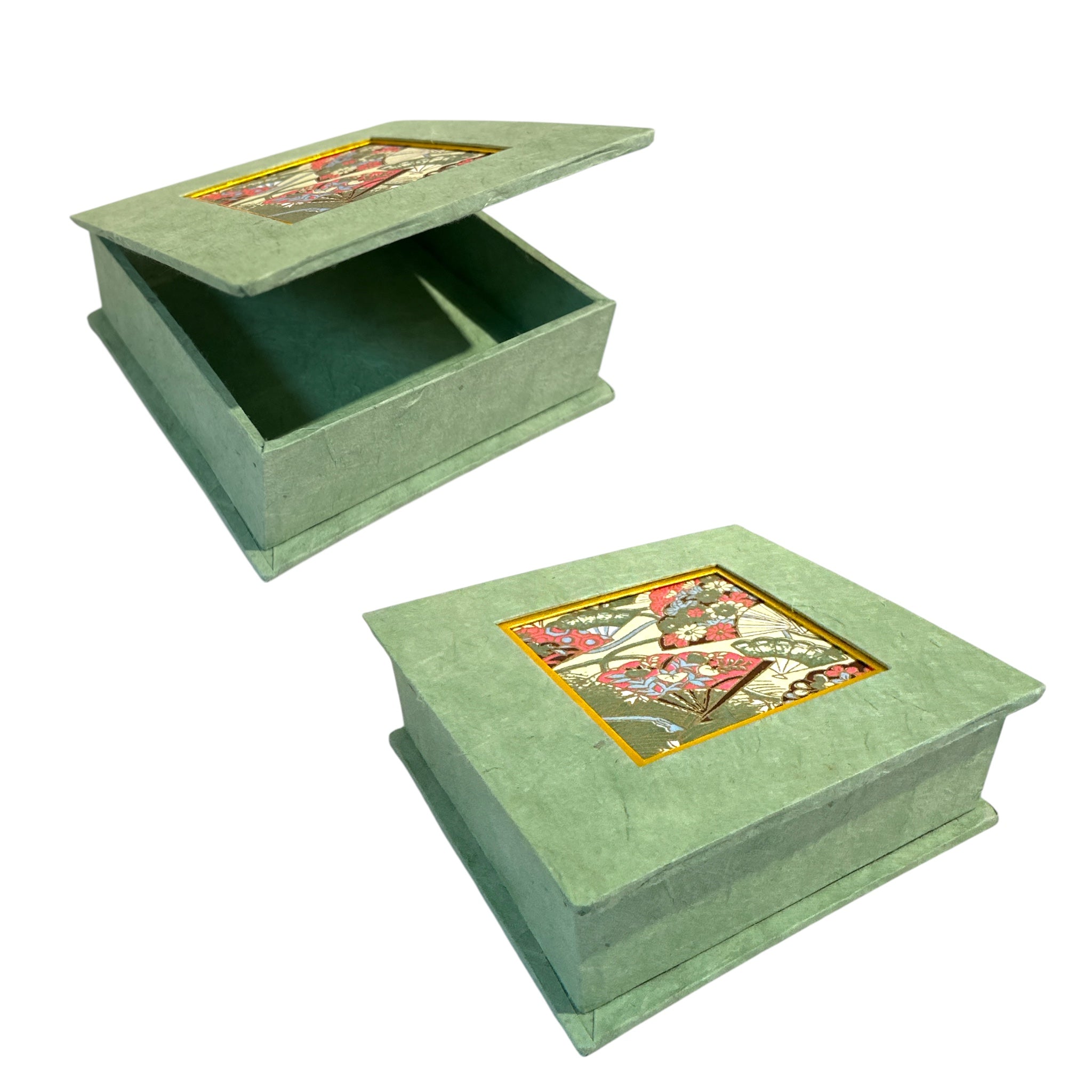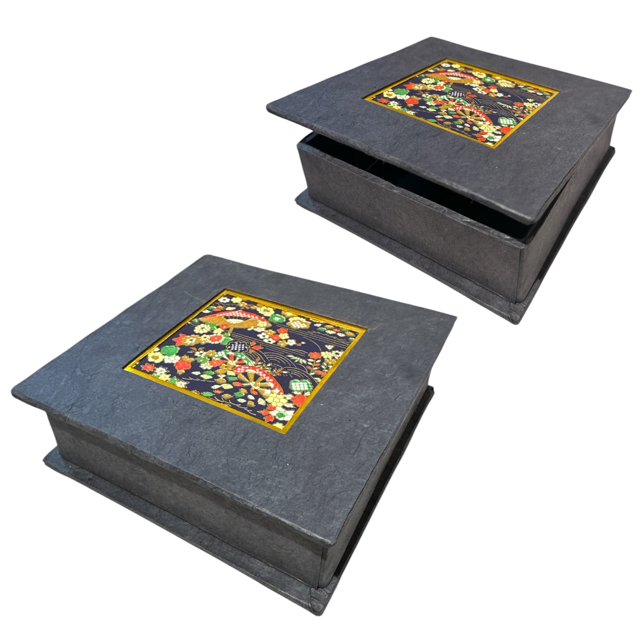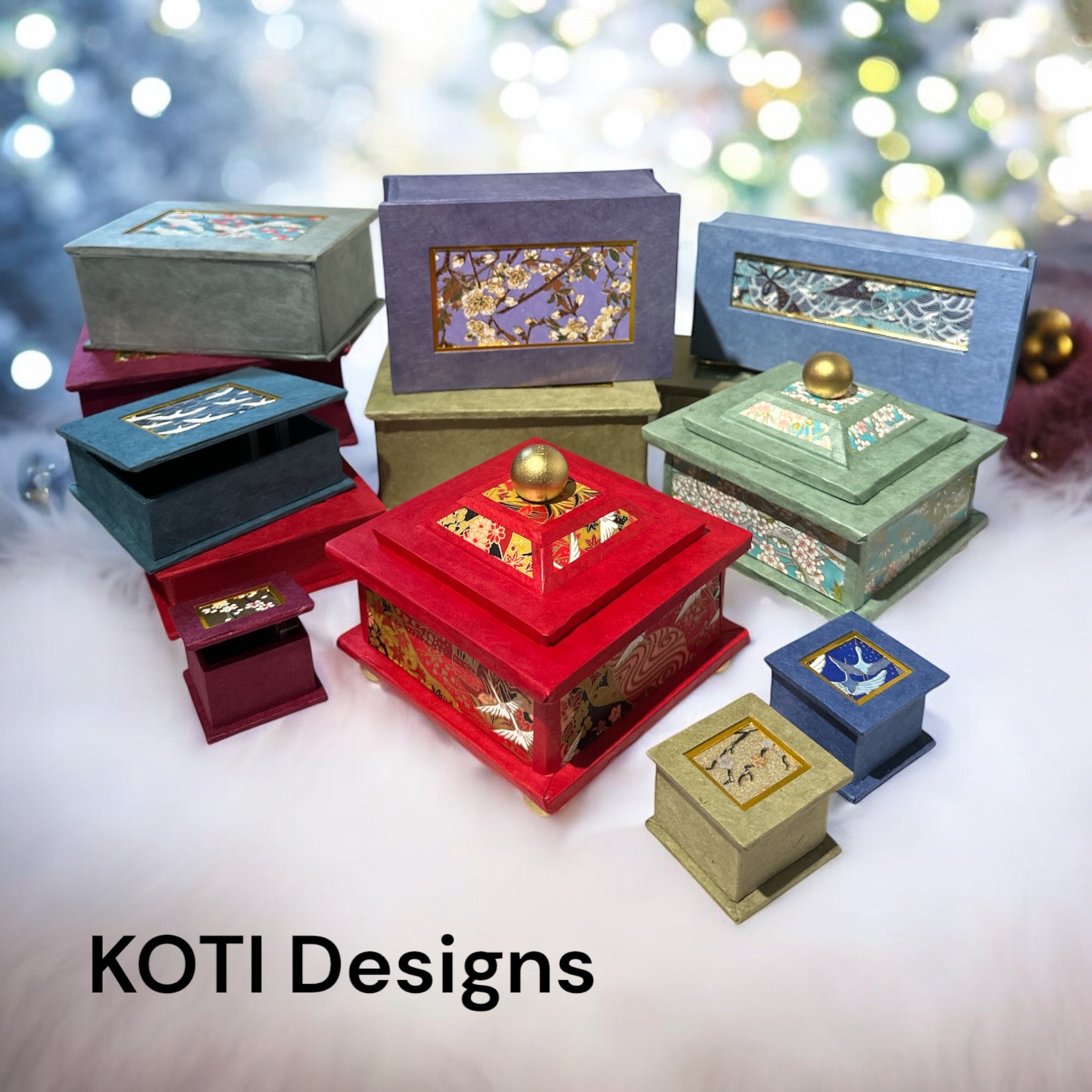 Assortment of boxes made of Nepalese lokta paper with windows of Japanese chiyogami and katazome