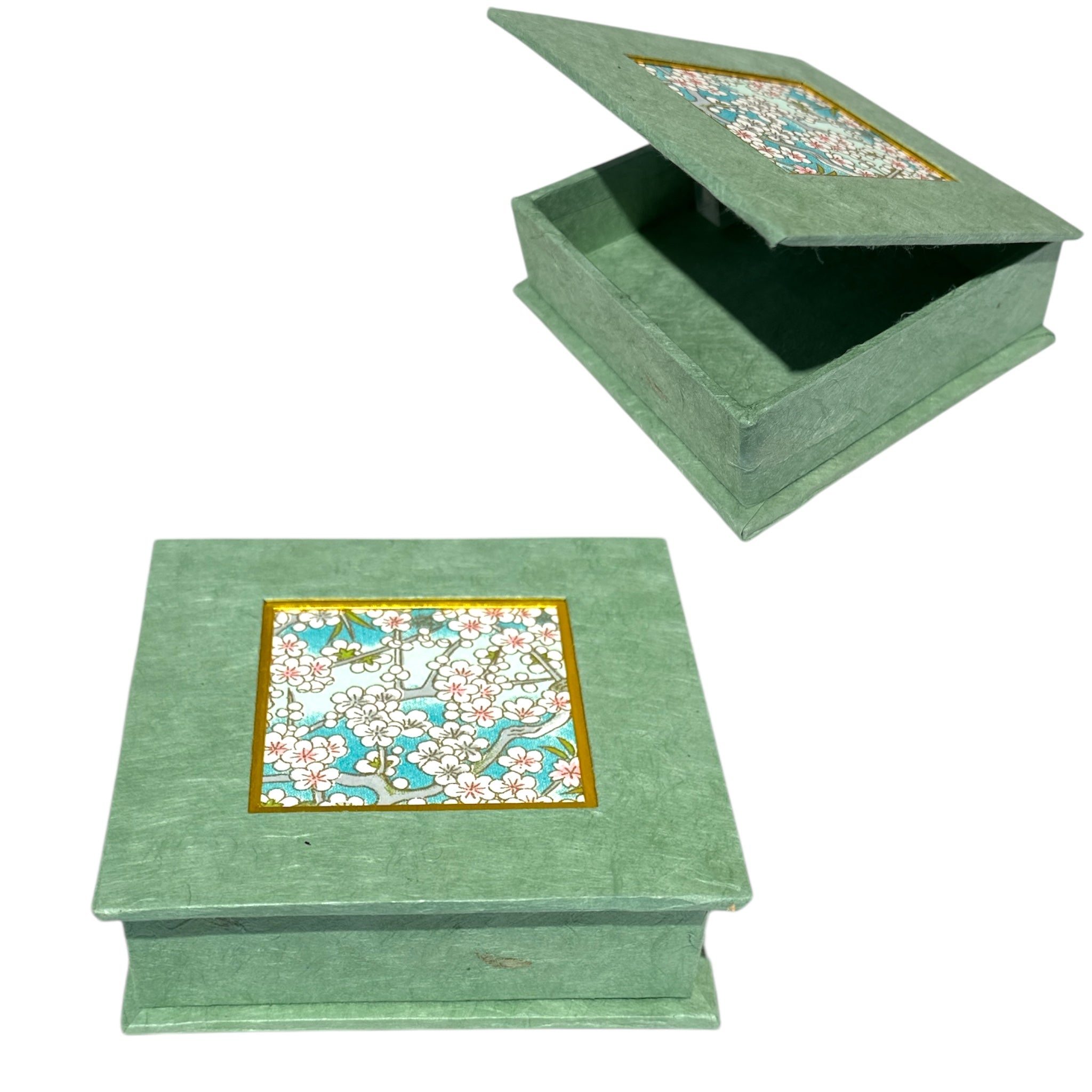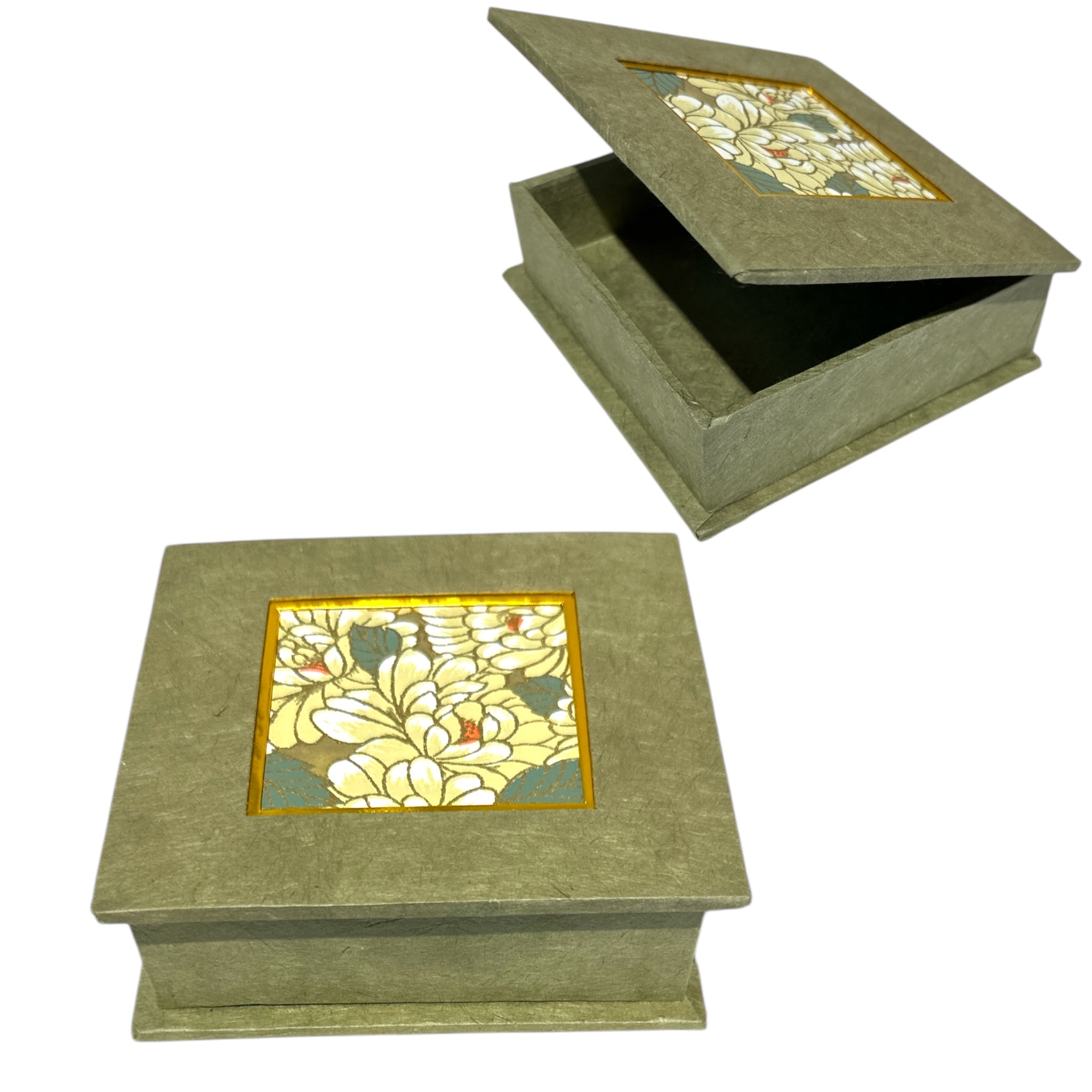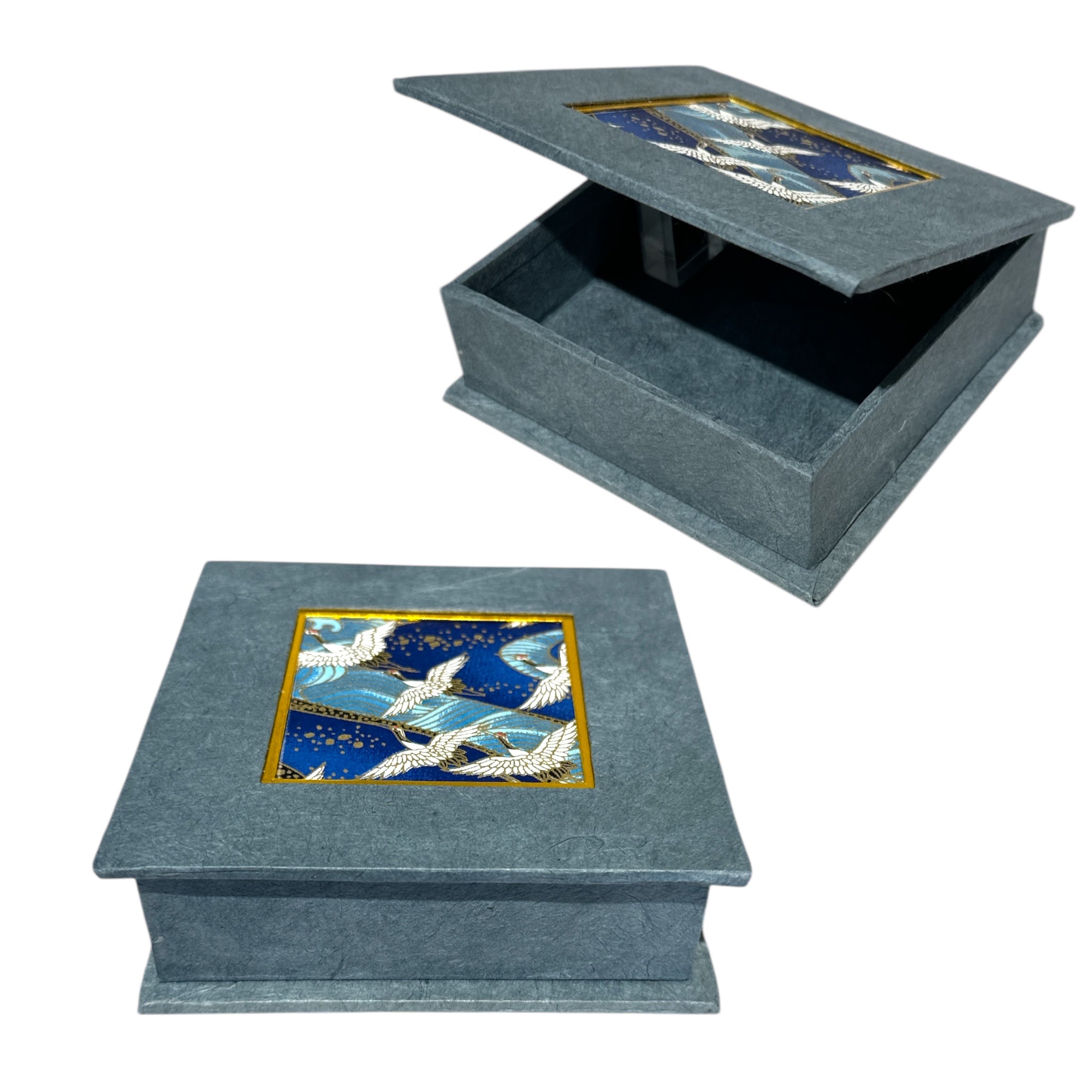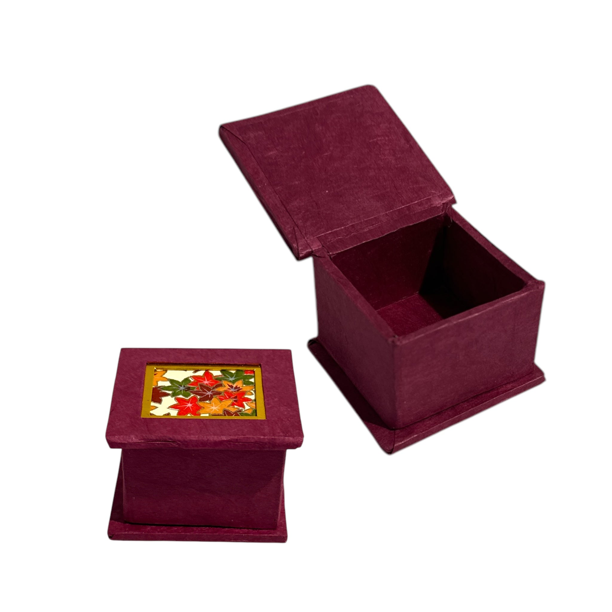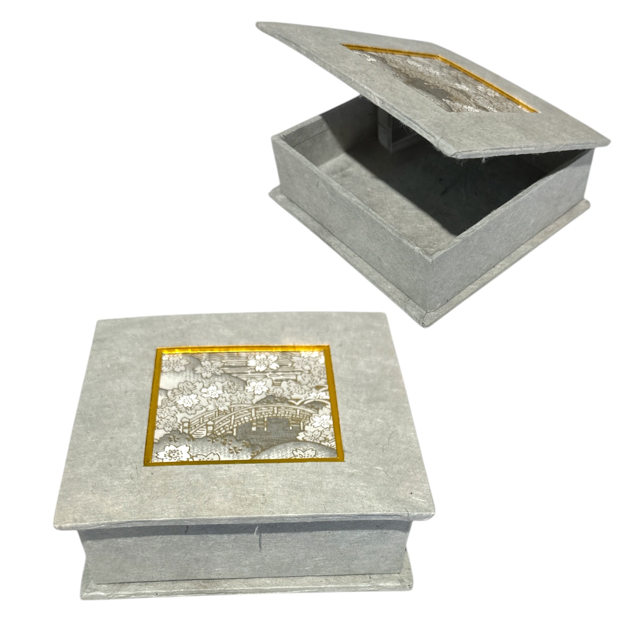 Assortment of boxes made of Nepalese lokta paper with windows of Japanese chiyogami and katazome