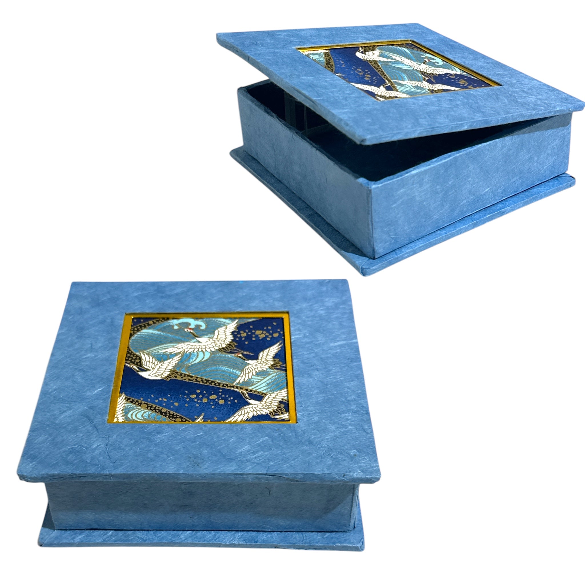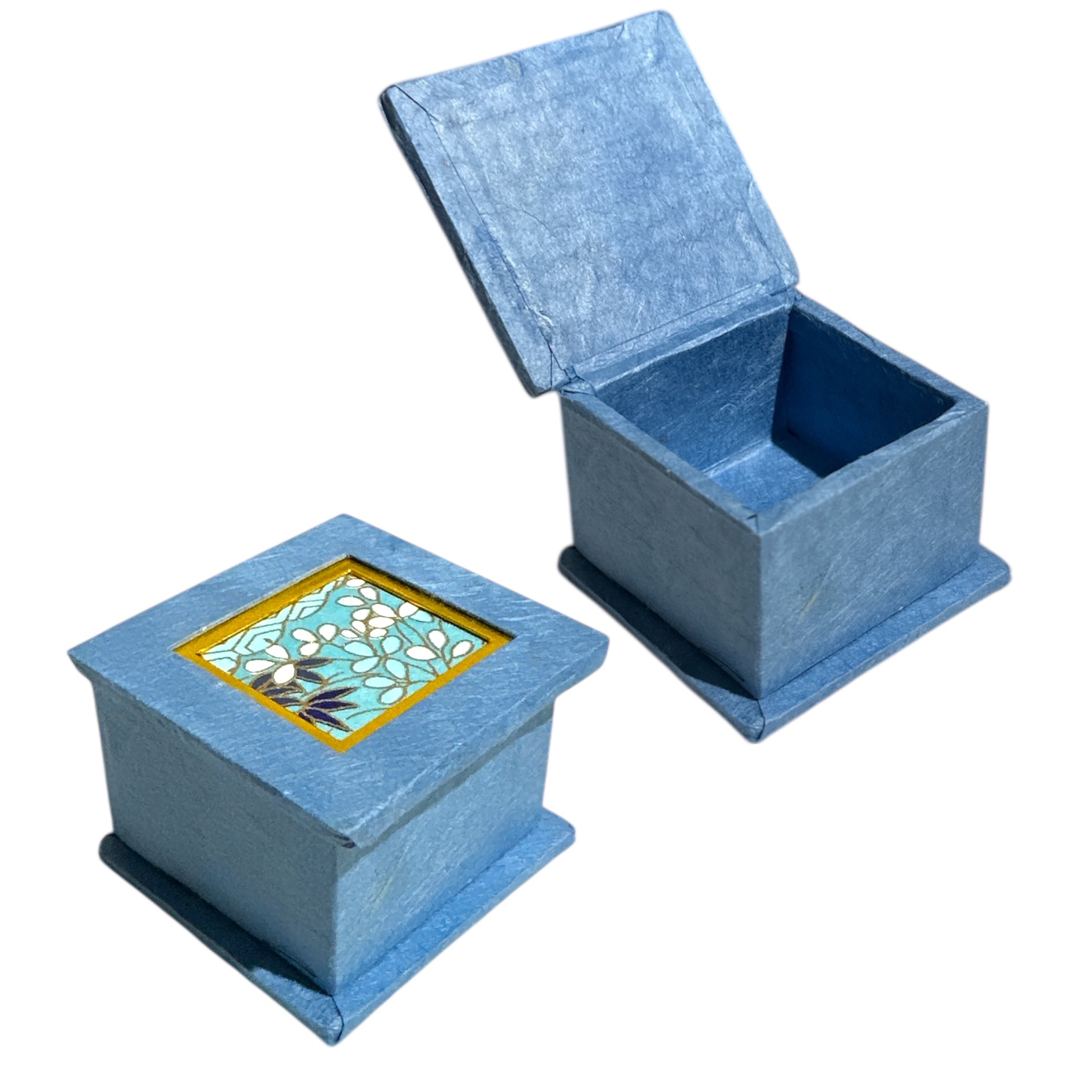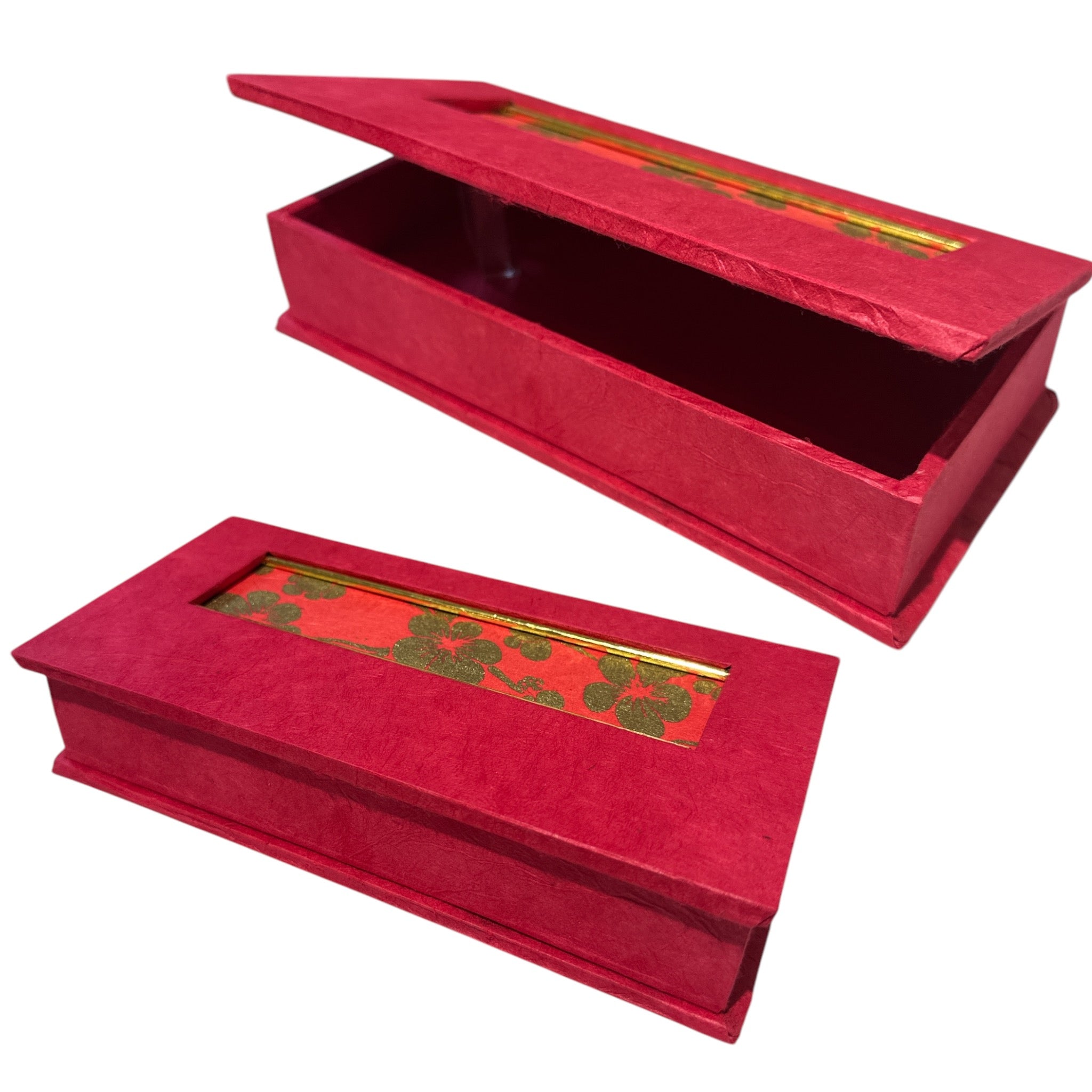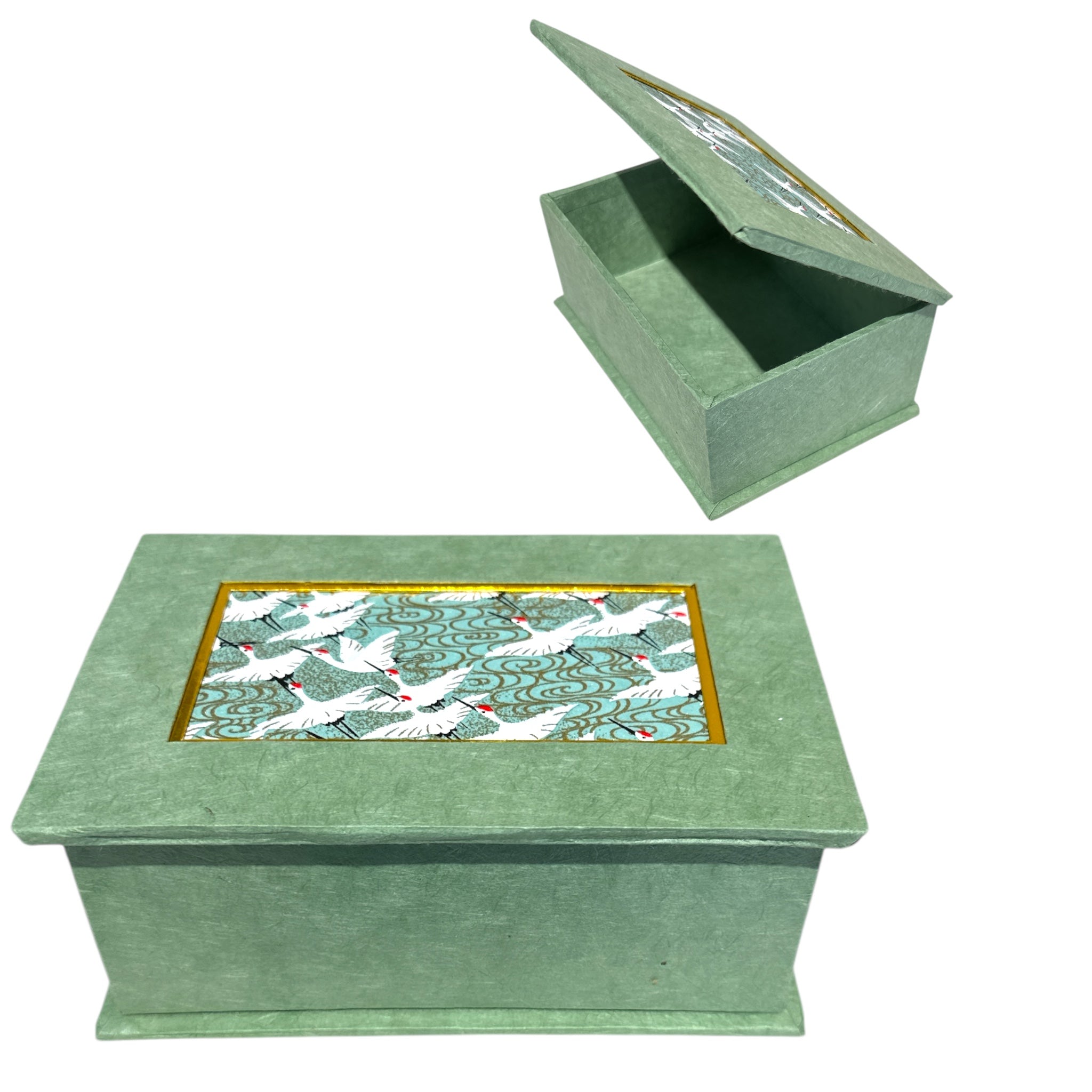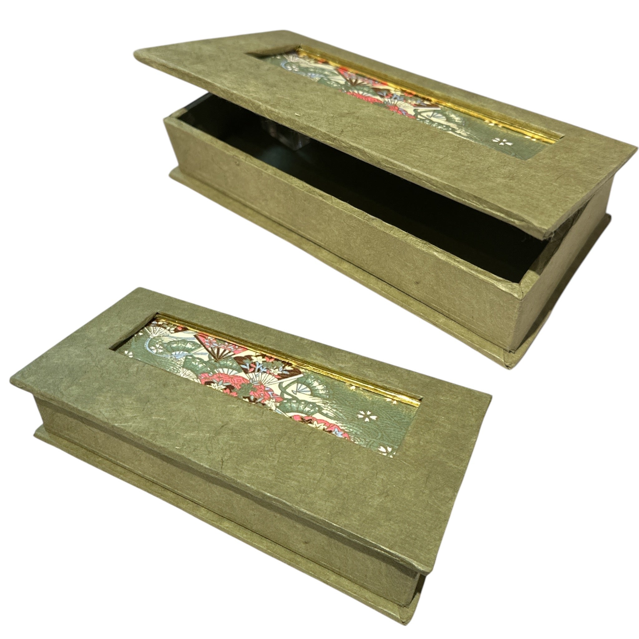 Assortment of boxes made of Nepalese lokta paper with windows of Japanese chiyogami and katazome