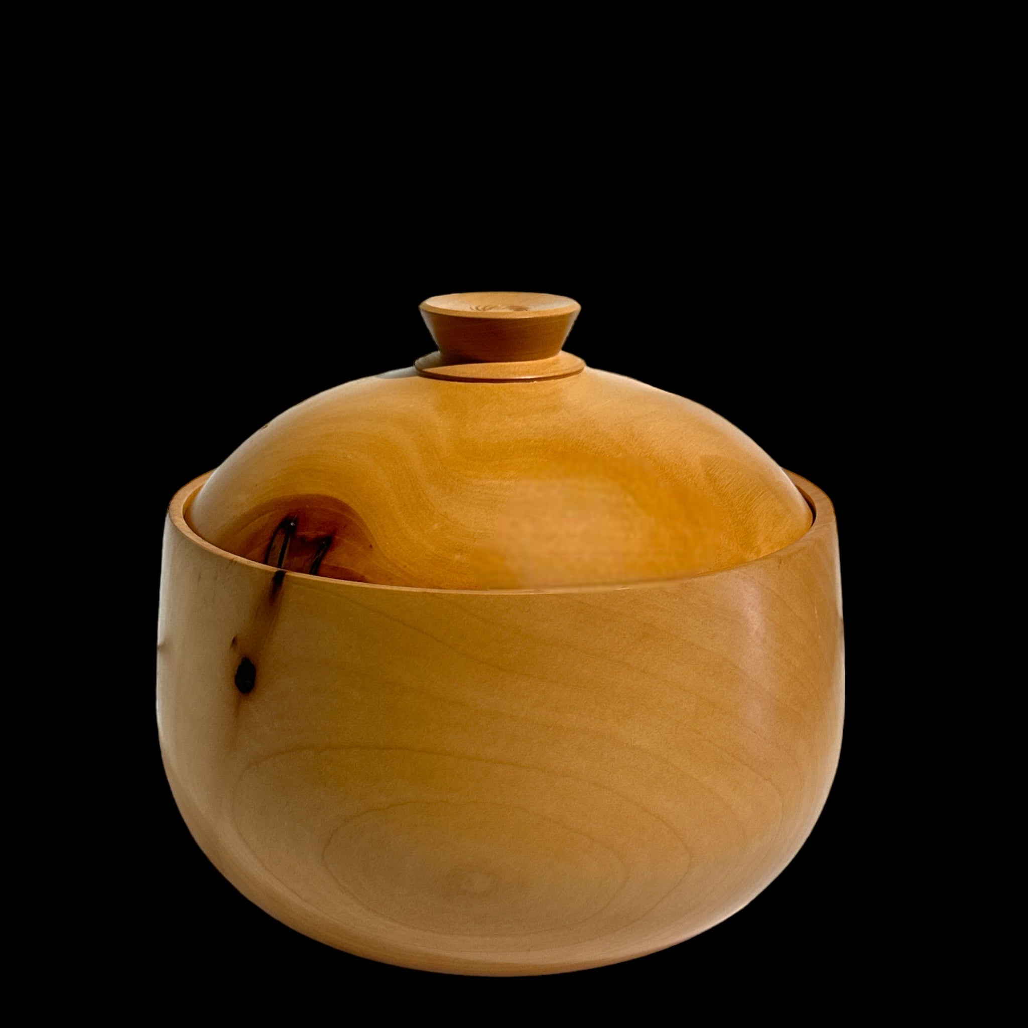 He works with all natural wood from the island such as oak, maple, locust,Arbutus, cherry,etc. Someone has a downed tree or wants their apple tree removed, Harvey is there to pick it up and turn it on his lathe. Before he can turn it he has to run it through a bandsaw and carve out something to work with. Then the wood goes into a drying room for up to one year.
