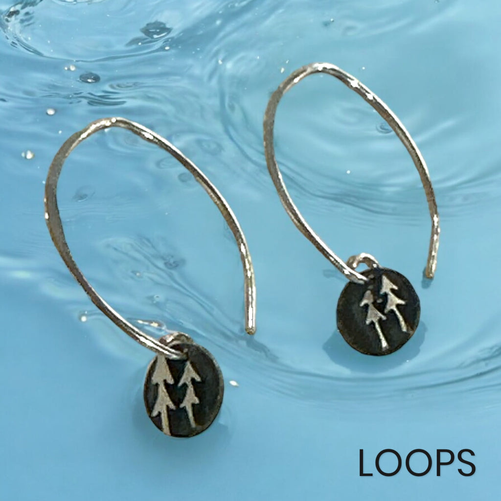 The silver discs on these hanging earrings has been oxidized with a mountain, tree or wave raised west coast design that mimics the view you would have looking out the porthole of a ship while at sea.