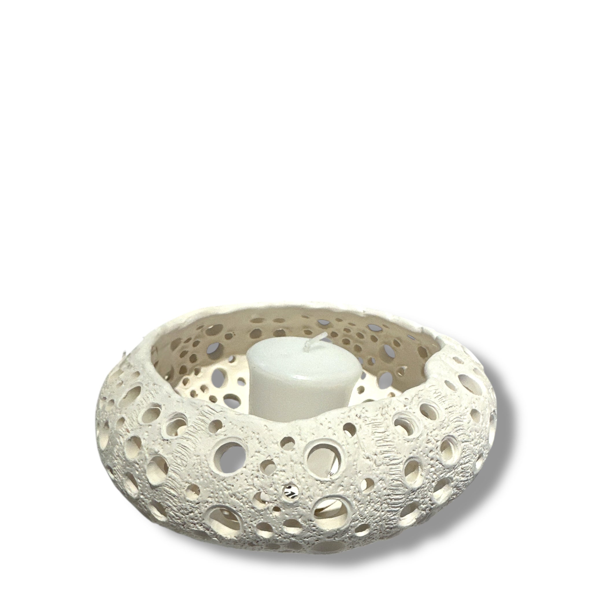 The holes are pushed through the pure white porcelain to resemble the spines on the outside. The effect of the glow of light from the candle or the soft led light creates a soothing and comforting atmosphere. Each bowl is hand made to look like a sea urchin. Penny added life like ceramic barnacles on the bottom of each bowl.