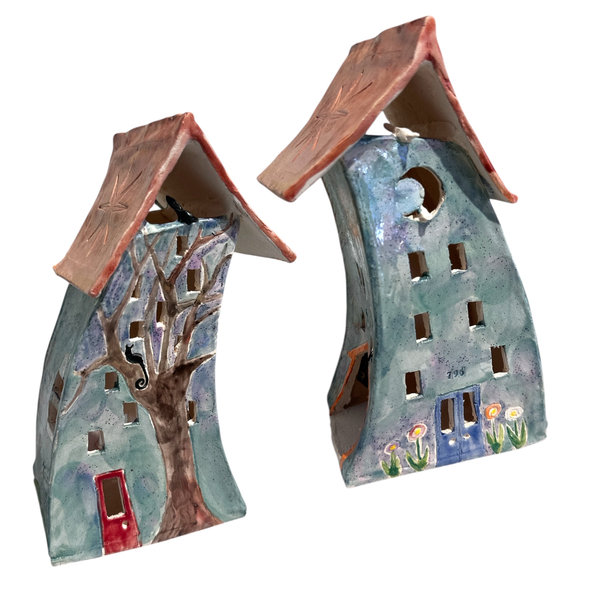 Tracy's attention to colour, style, size, and little details, like birds, house numbers, windows, doors, flowers and such, add so much character and delight to each individual house lantern. It might be tilted, or have a curled roof, or have a blossom tree painted on one side that makes it unique. Each has a positive vibe that will make you smile.