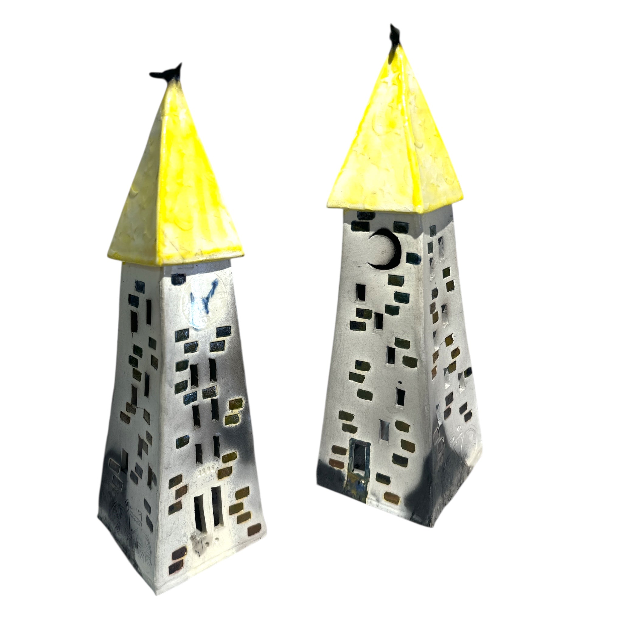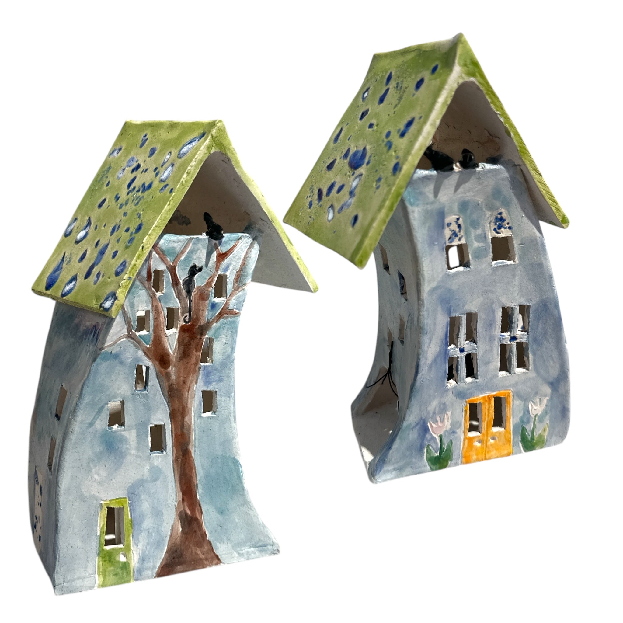 After working as an animator and teaching animation for many years, she has taken a side turn, creating her ceramic house lanterns with warmth and whimsy.