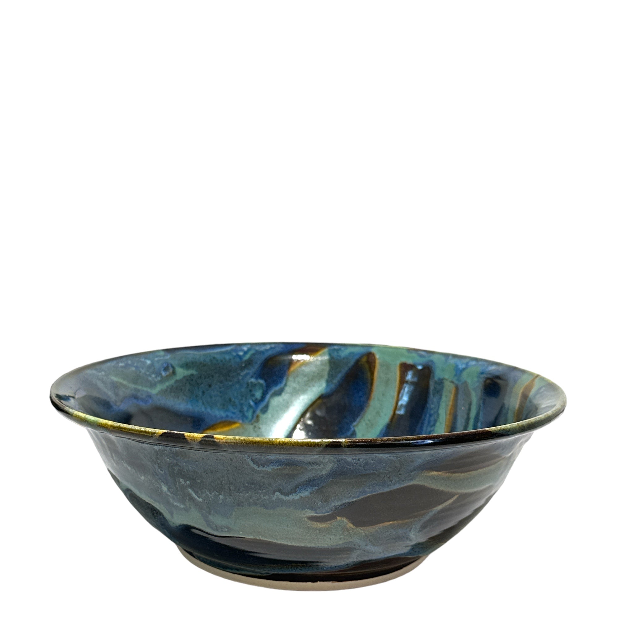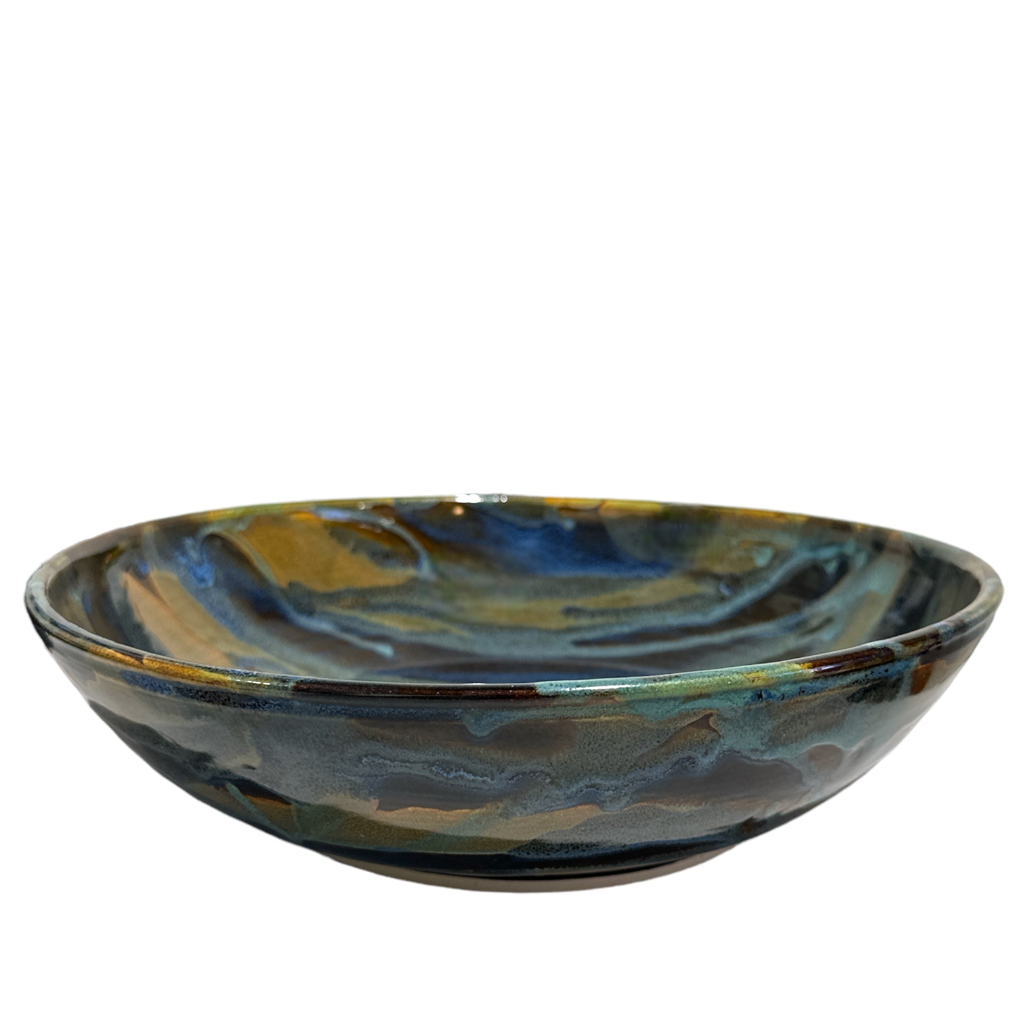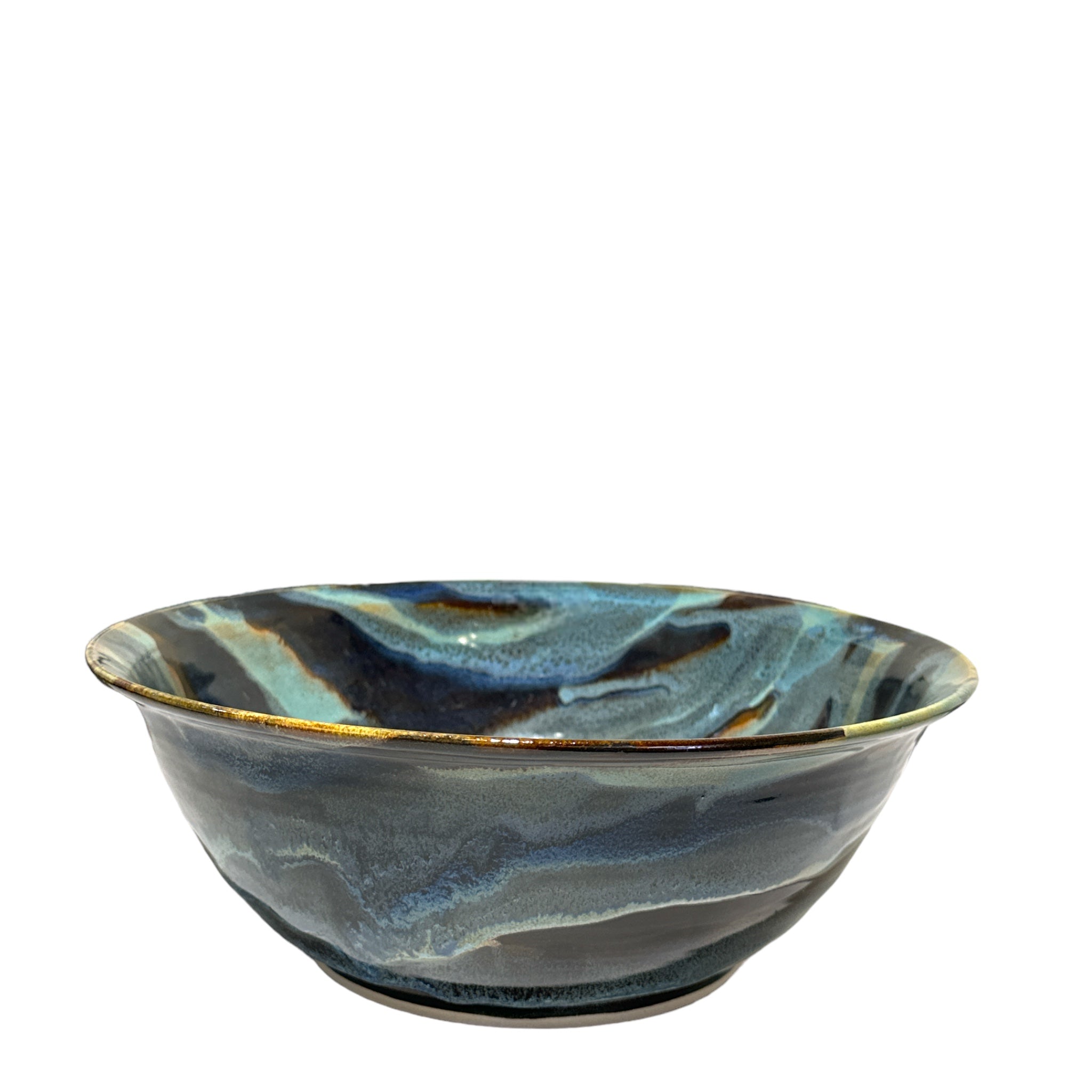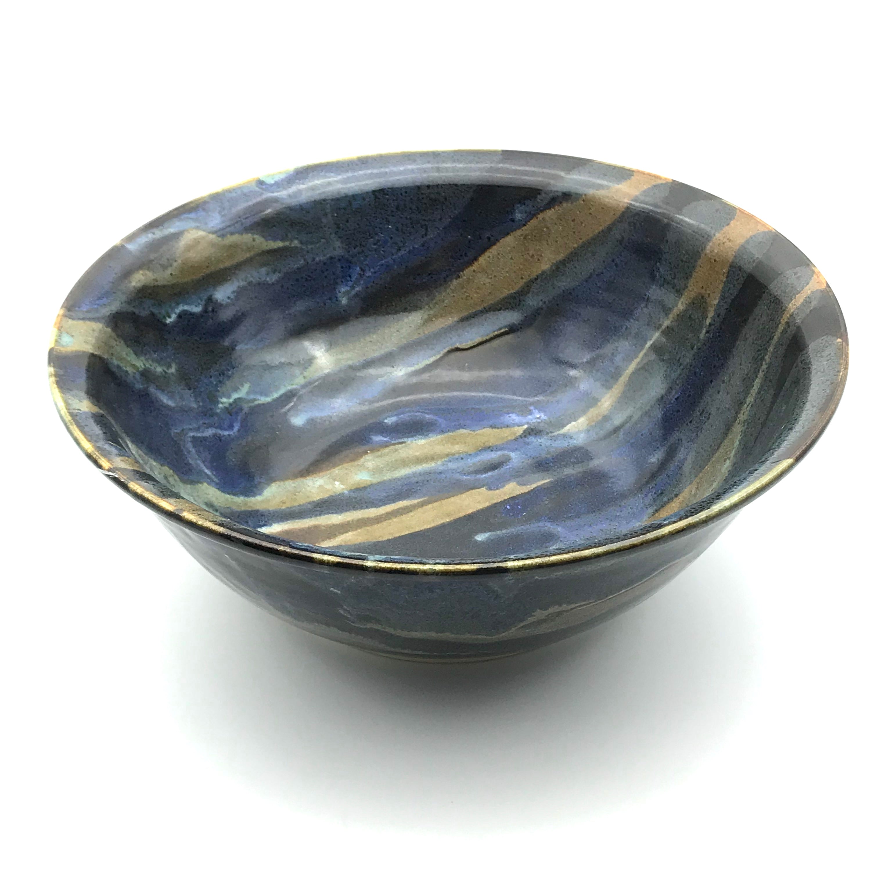 The Tofino glaze and design by Matthew Freed. A gorgeous swirl of deep blues complimented with seafoam and pale gold highlights.