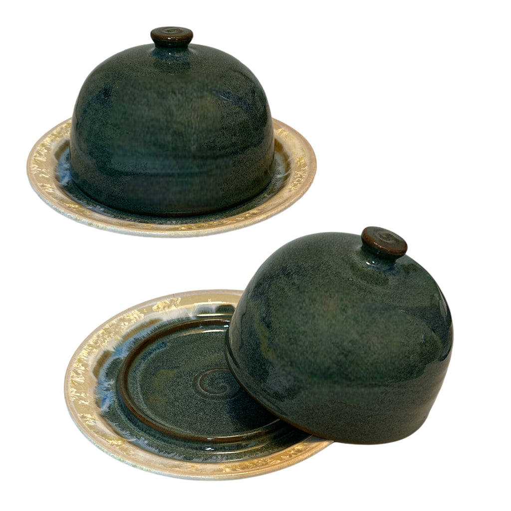 Butter dishes with blue & white glaze or with blue & rust glaze.