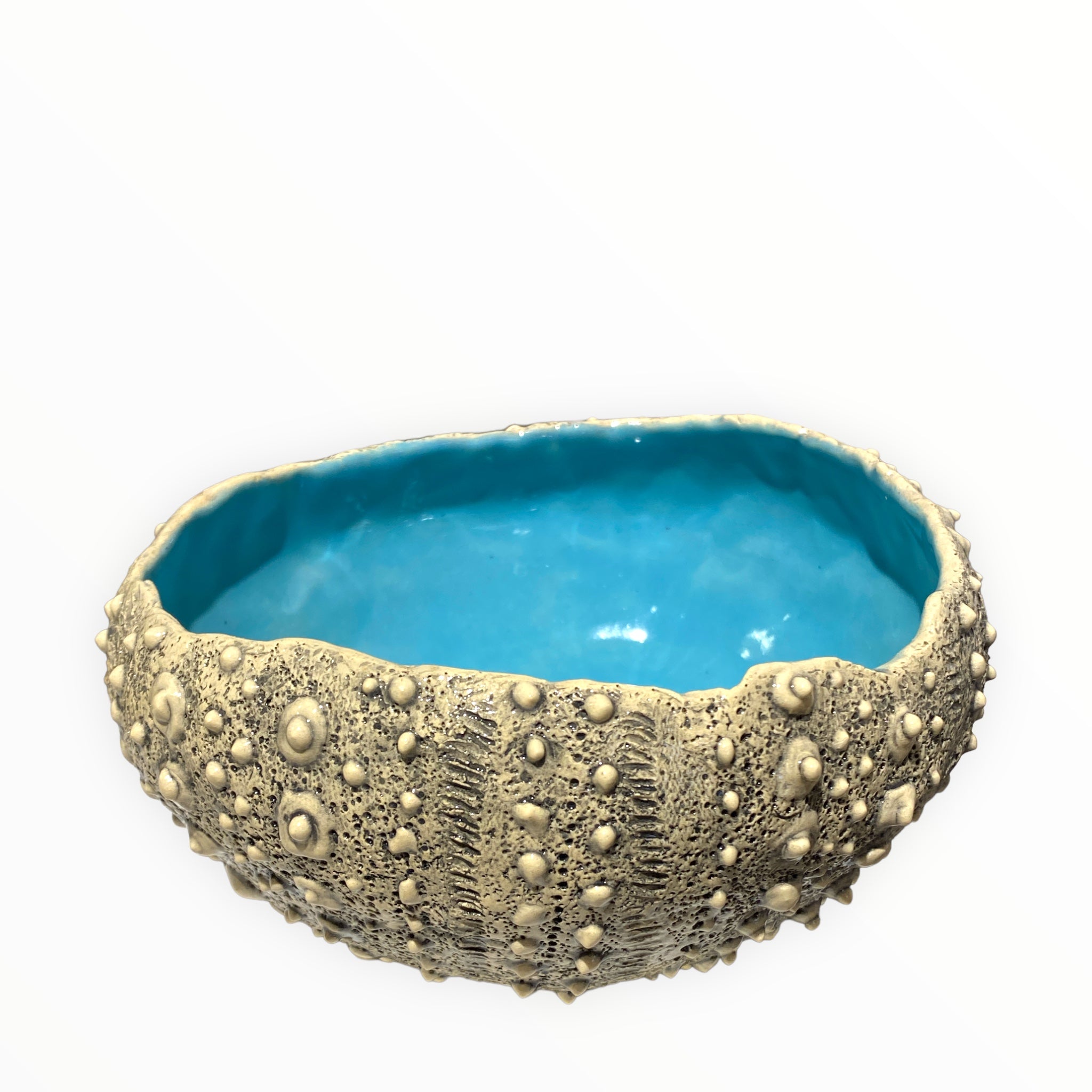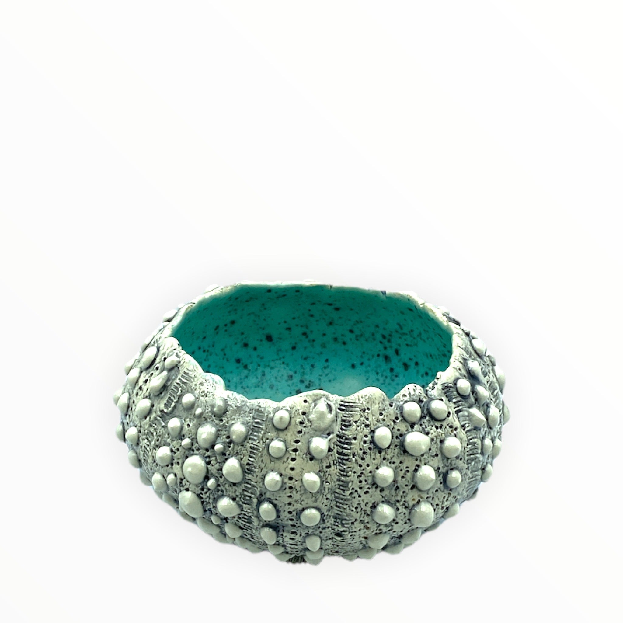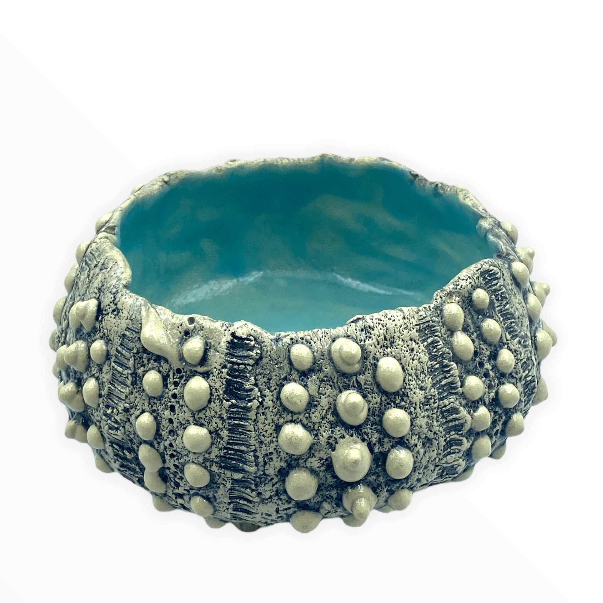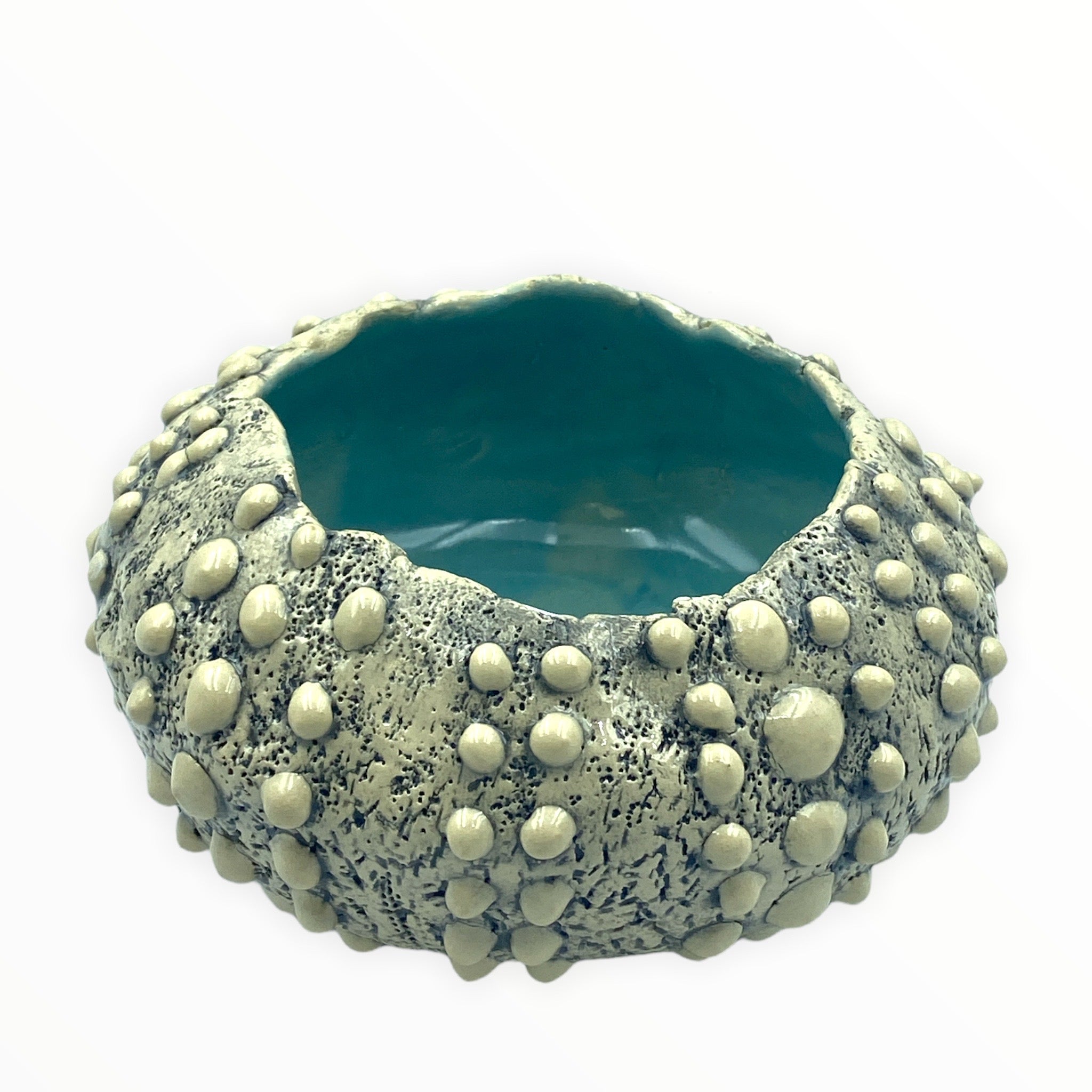 Note- these pieces are tactile, the spine dots are raised from the bowl, similar to a natural sea urchin after the spines are removed. The barnacles may be uneven and caution is recommended when placing on a soft surface. The bowls are dishwasher safe and food safe glazes.each item is one of a kind, colour, size, and overall look may vary slightly.