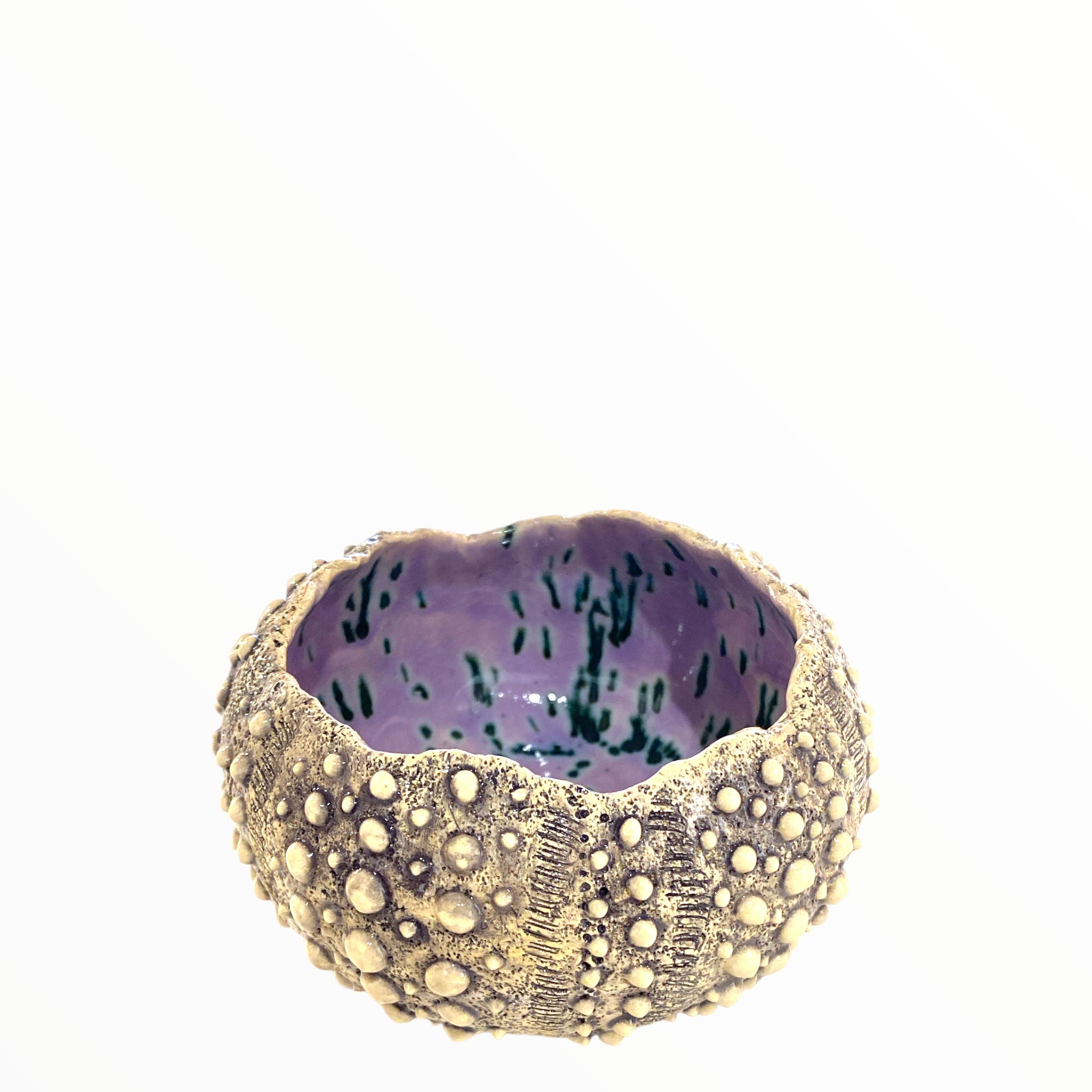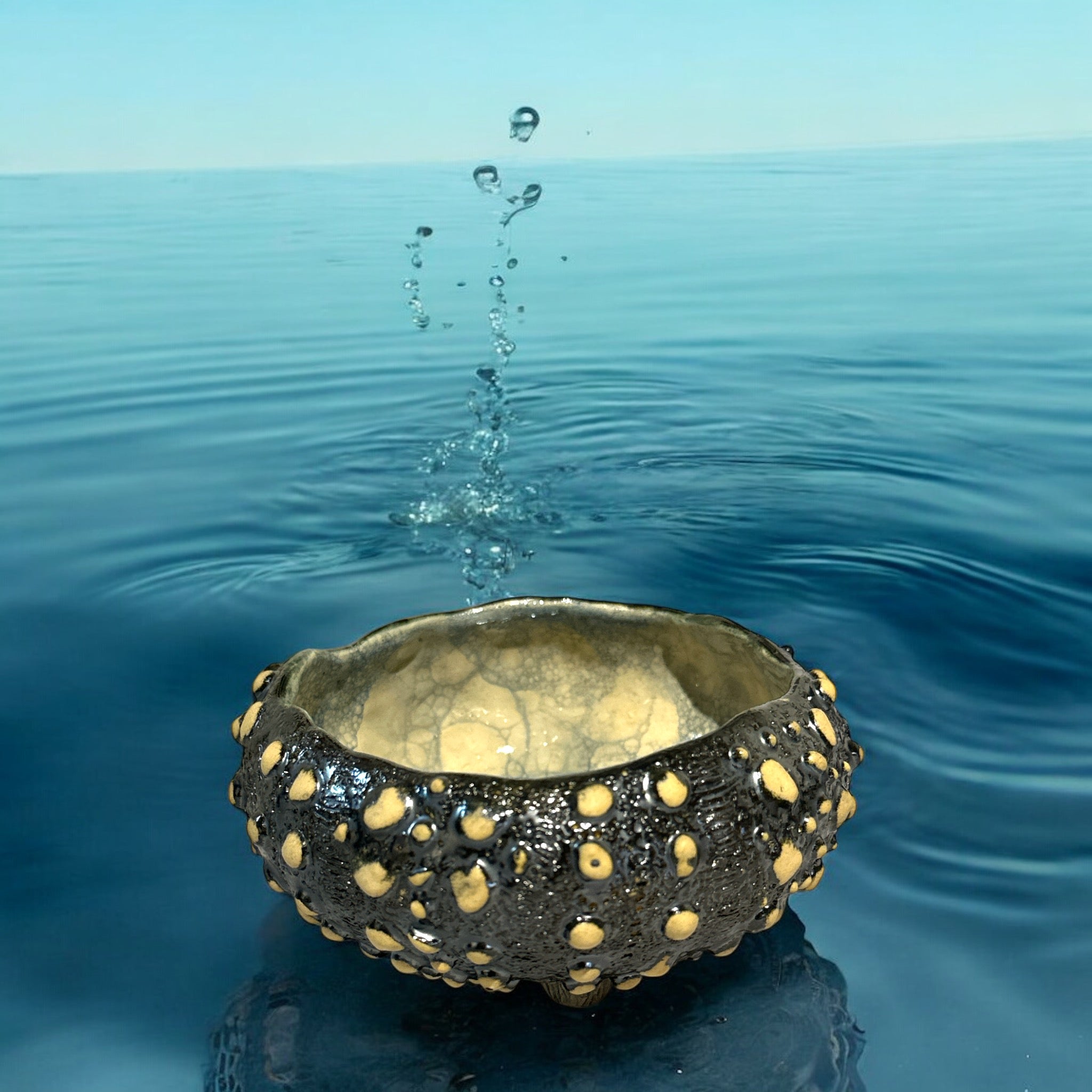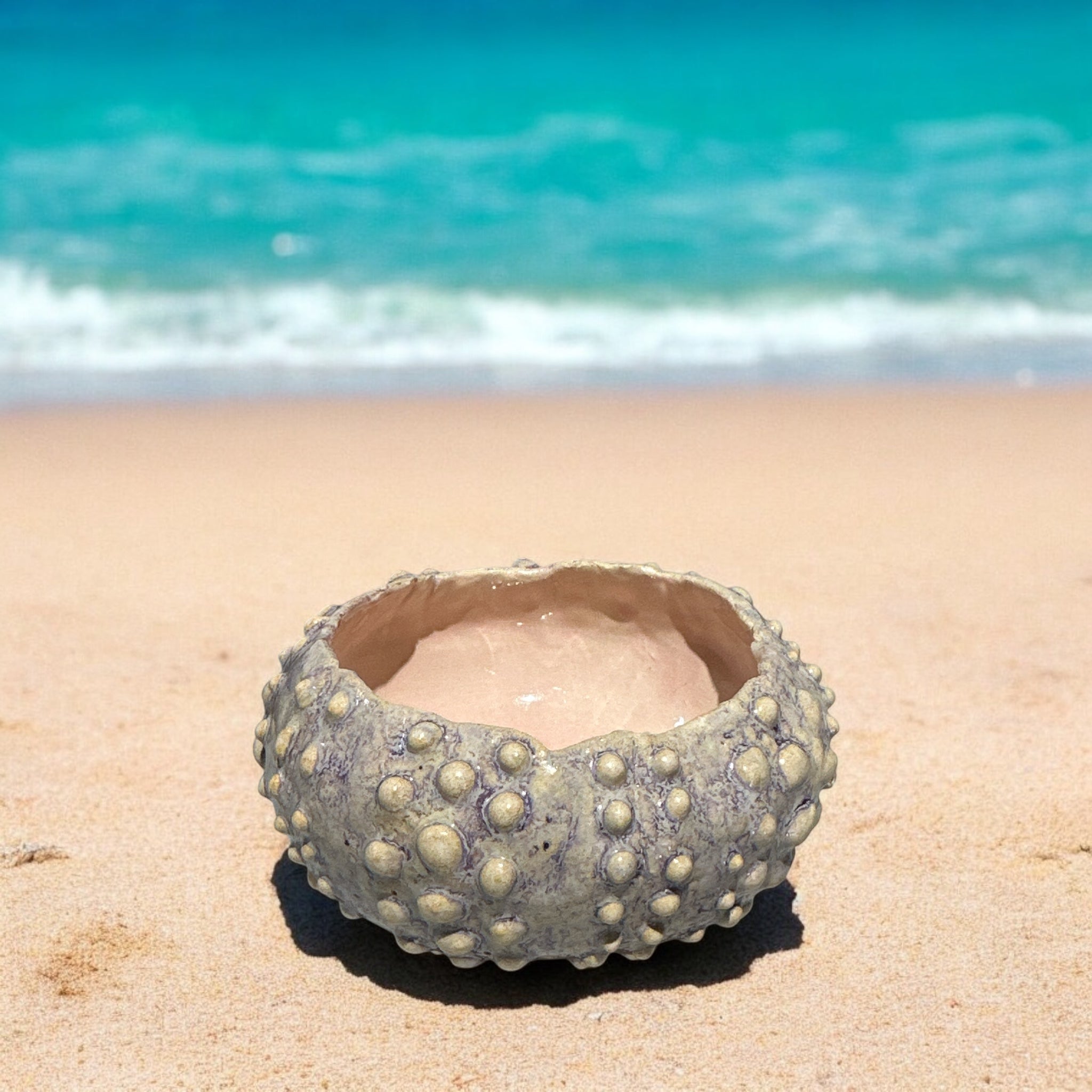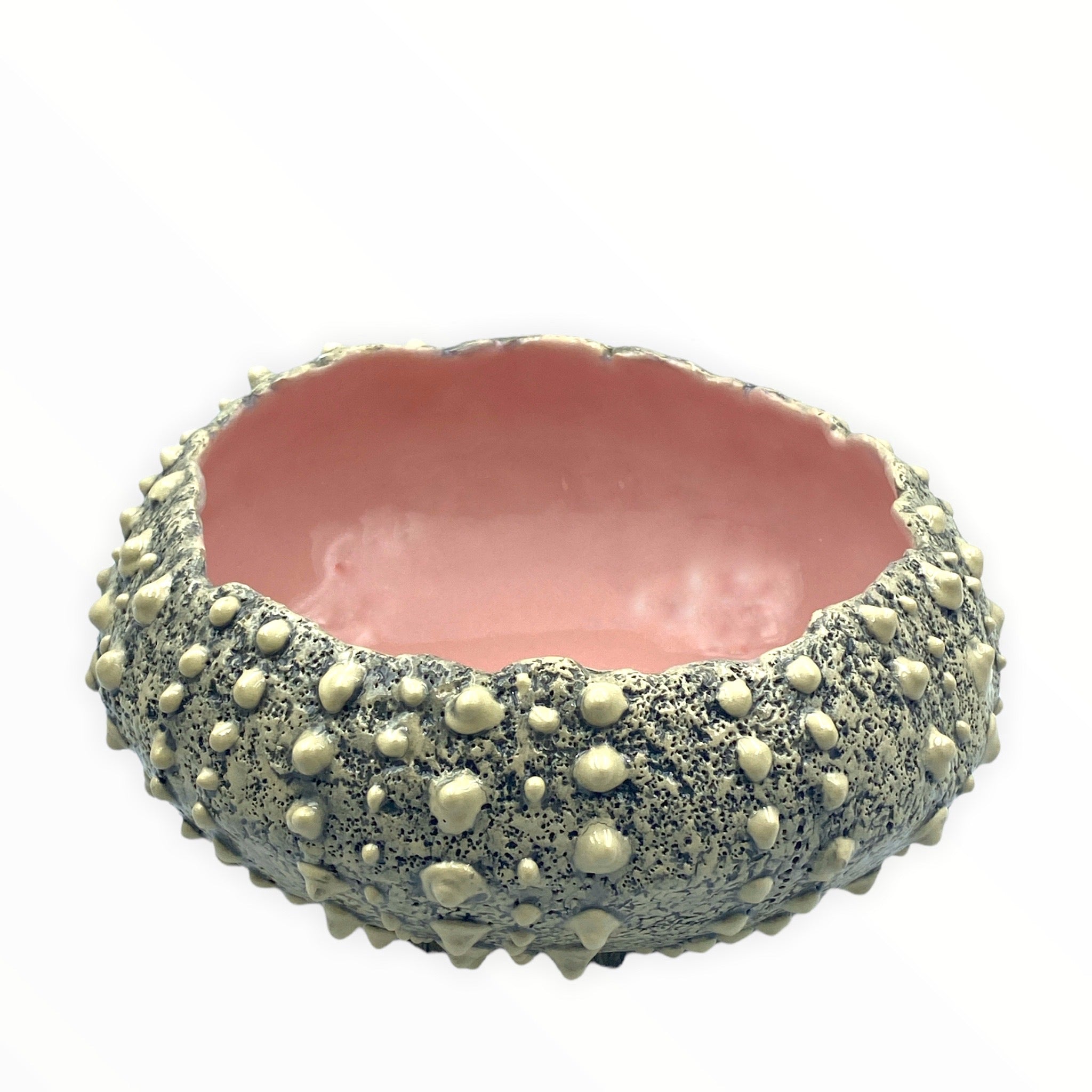 Note- these pieces are tactile, the spine dots are raised from the bowl, similar to a natural sea urchin after the spines are removed. The barnacles may be uneven and caution is recommended when placing on a soft surface. The bowls are dishwasher safe and food safe glazes.each item is one of a kind, colour, size, and overall look may vary slightly.
