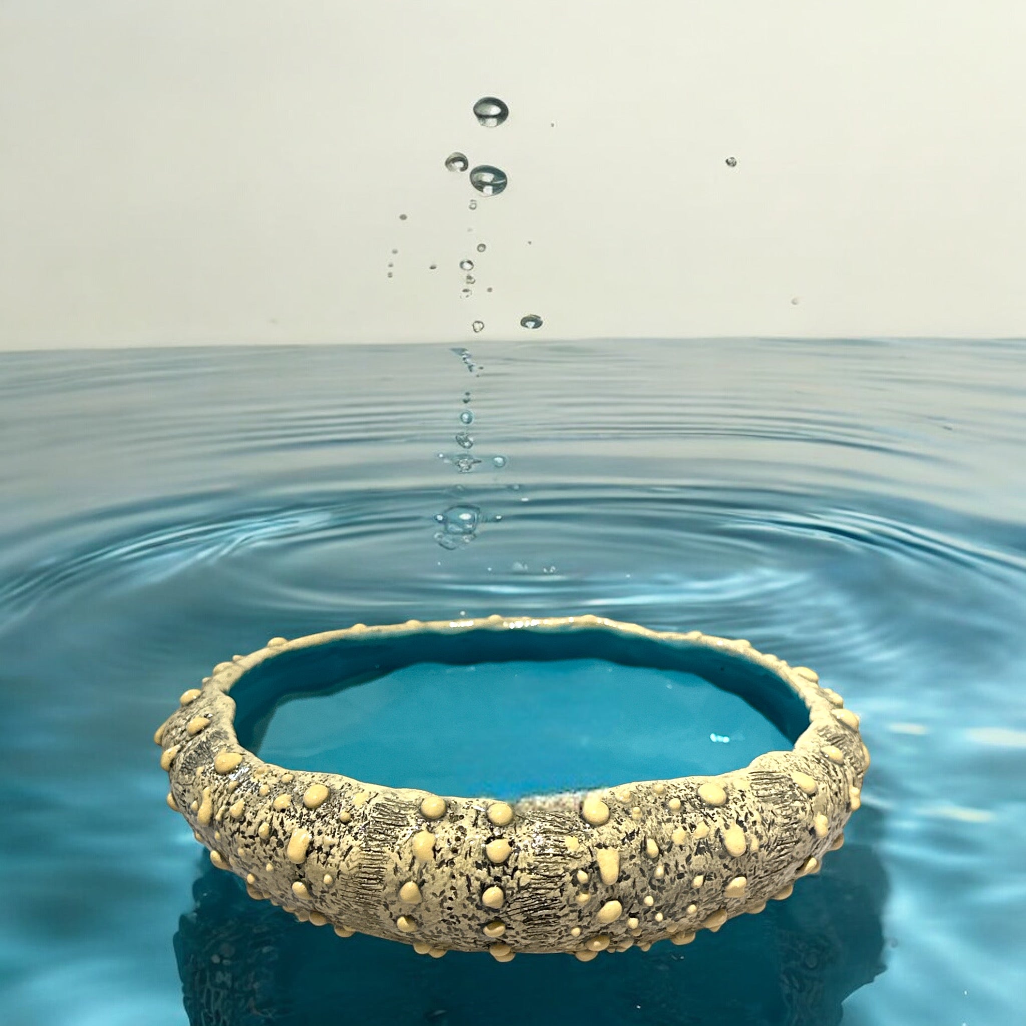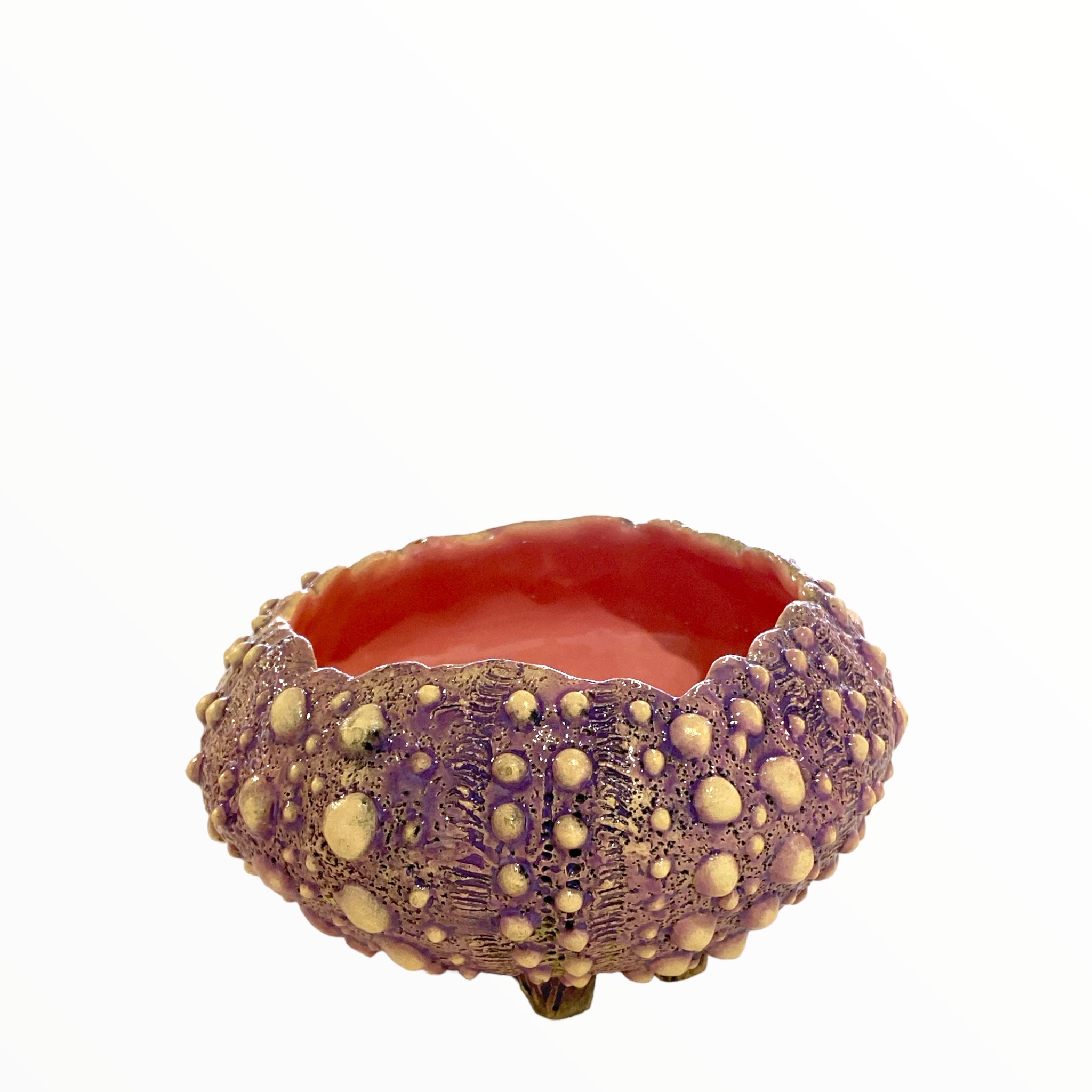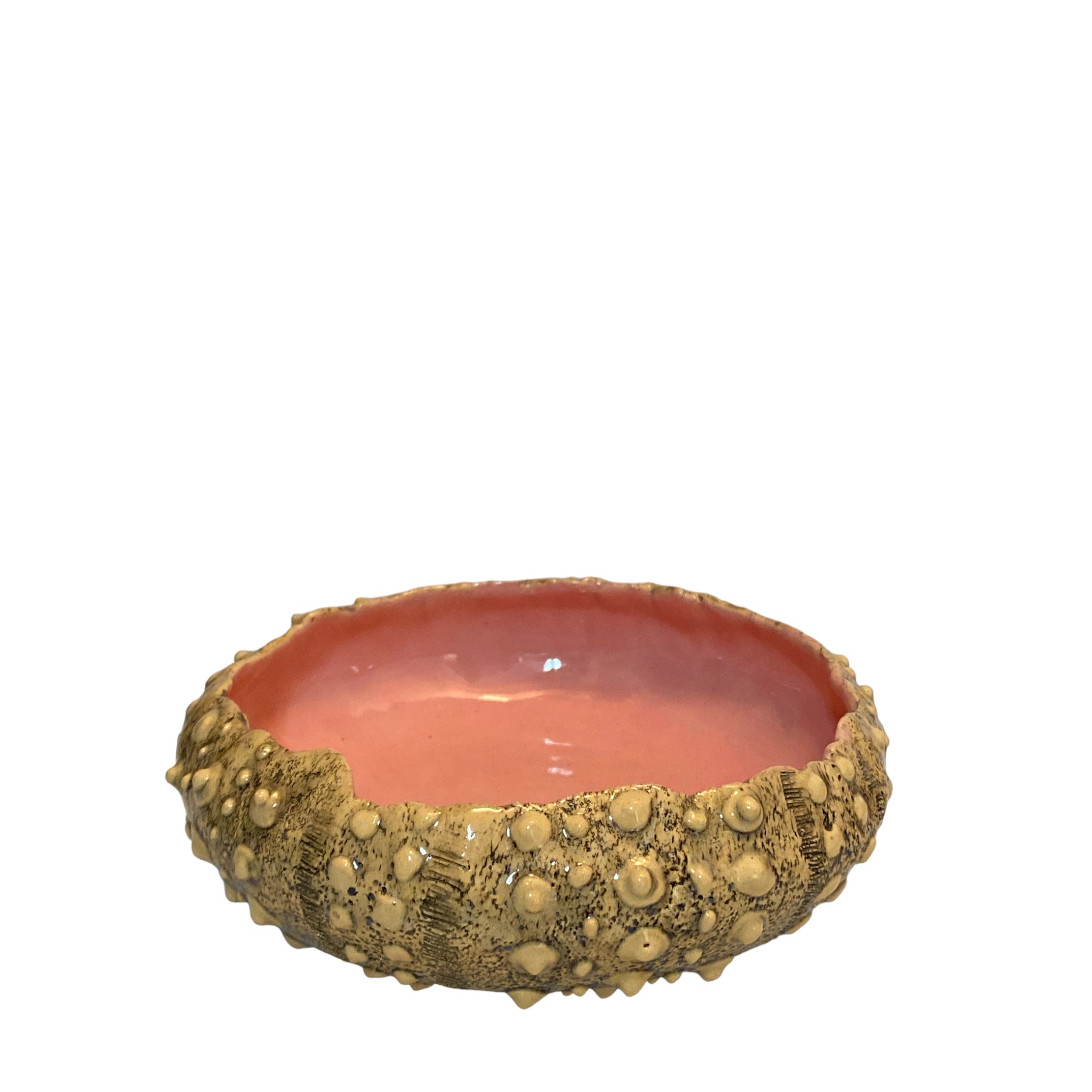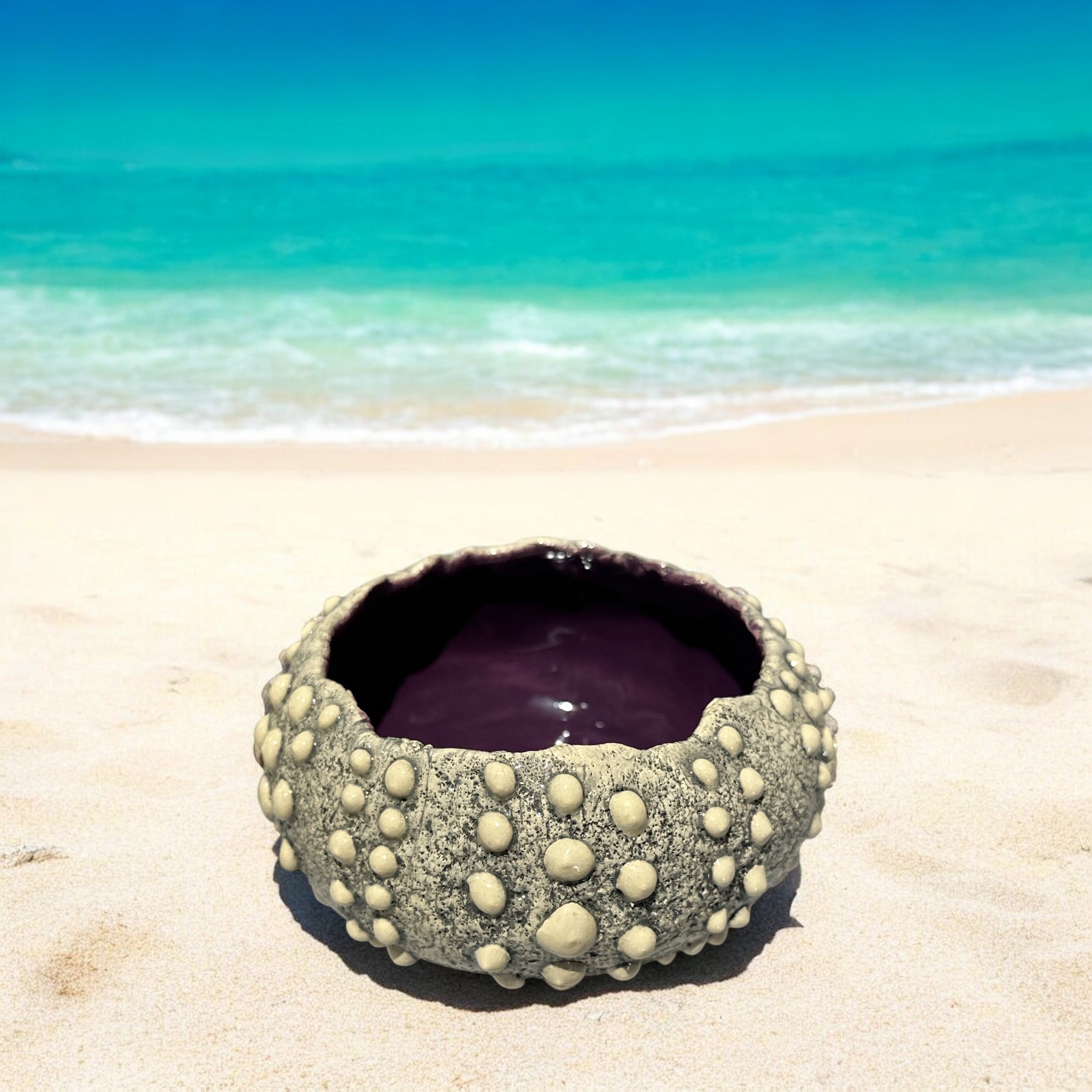 Note- these pieces are tactile, the spine dots are raised from the bowl, similar to a natural sea urchin after the spines are removed. The barnacles may be uneven and caution is recommended when placing on a soft surface. The bowls are dishwasher safe and food safe glazes.each item is one of a kind, colour, size, and overall look may vary slightly.