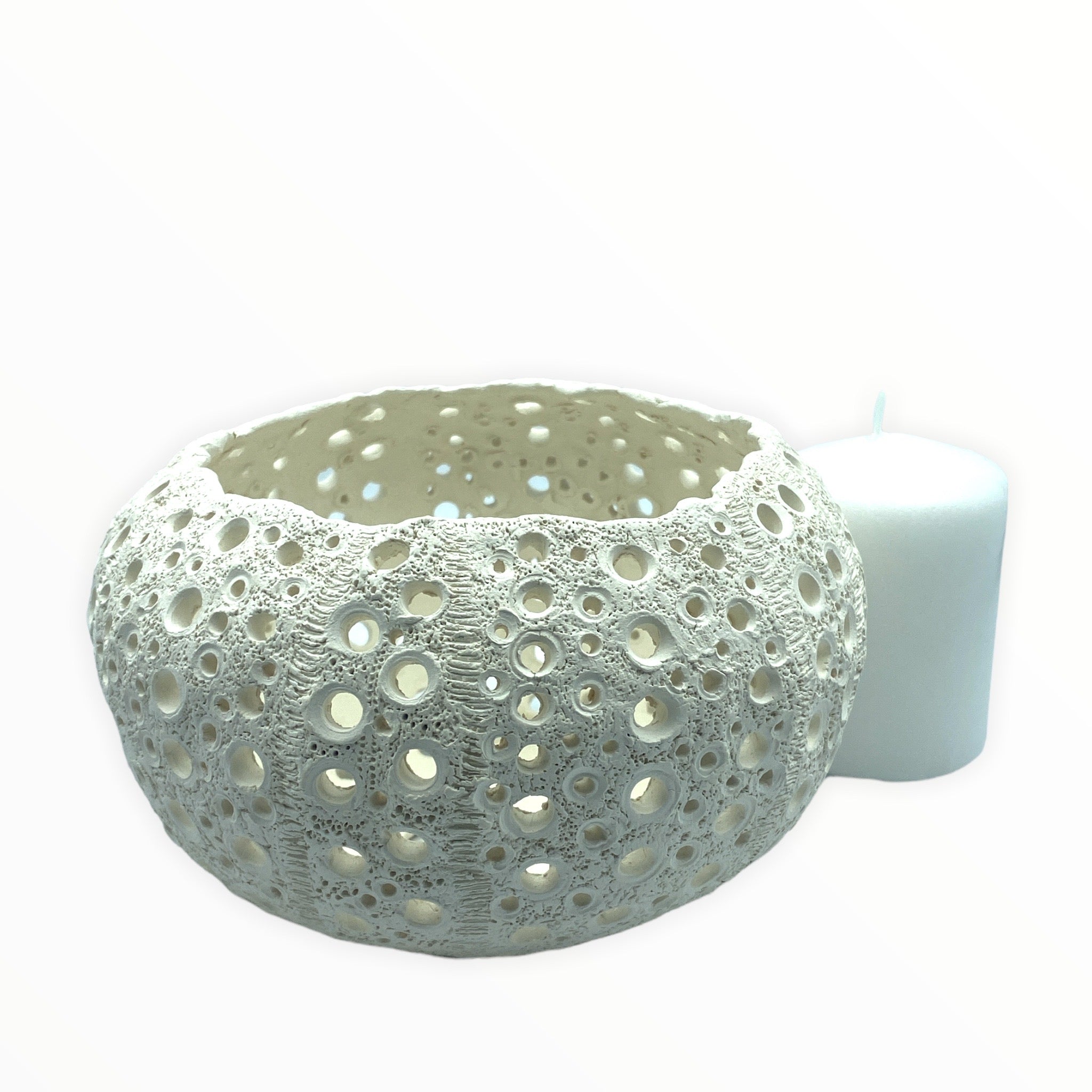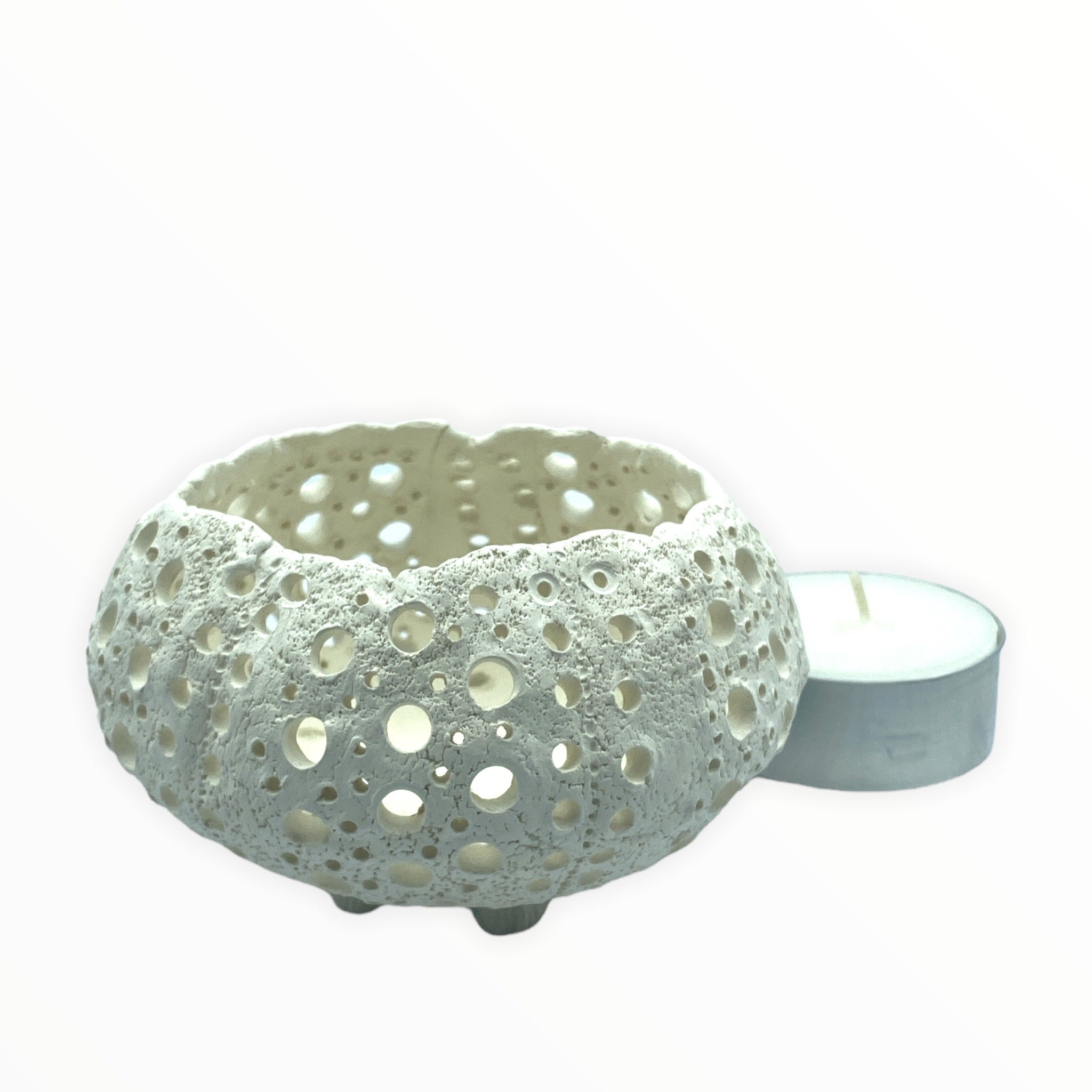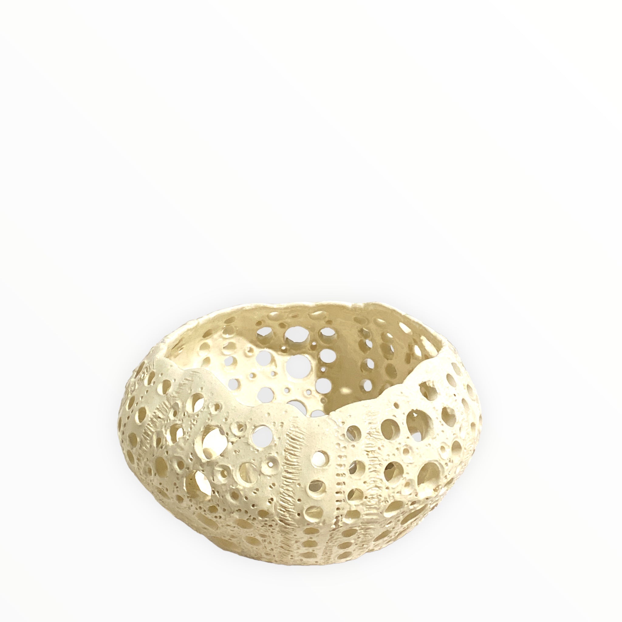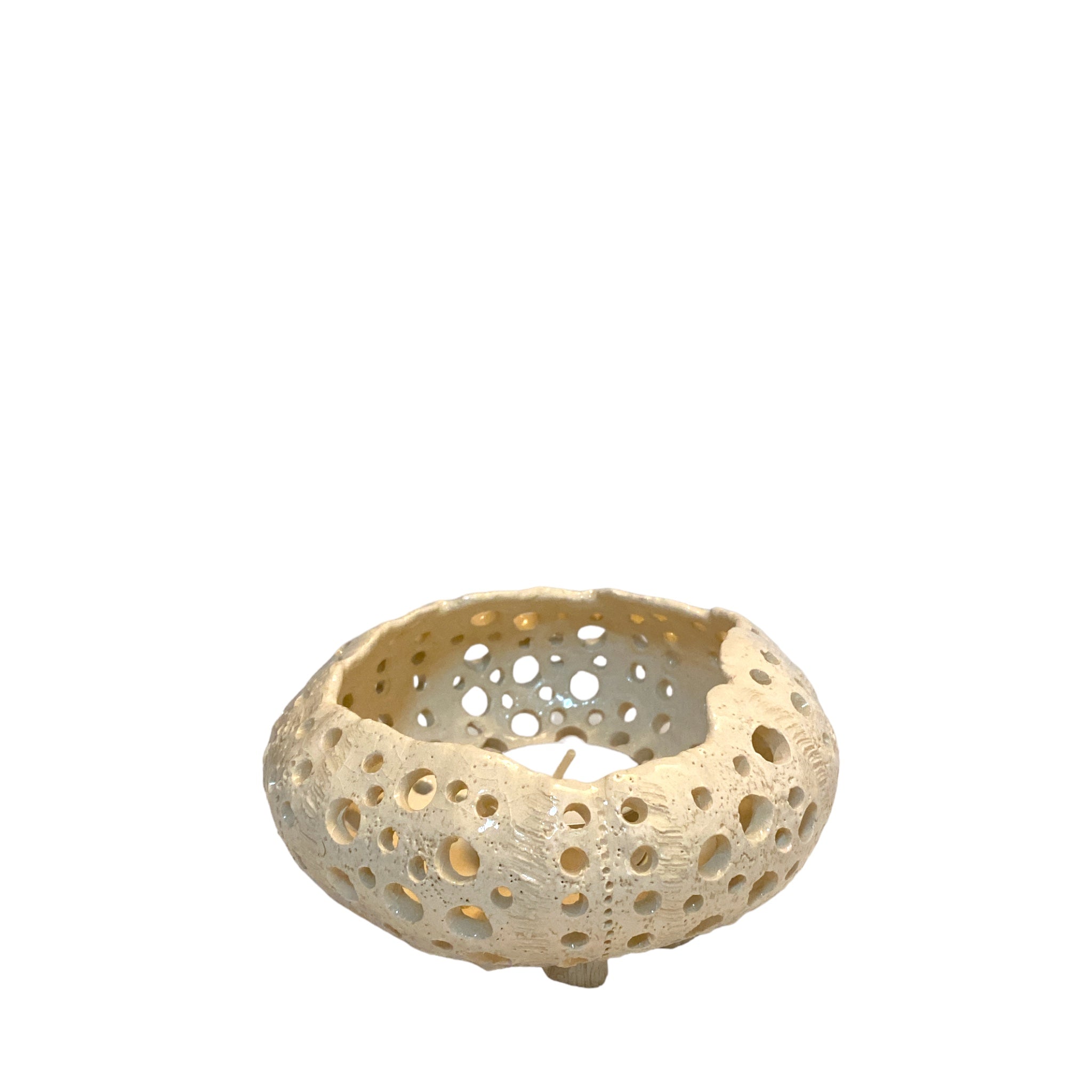 The holes are pushed through the pure white porcelain to resemble the spines on the outside. The effect of the glow of light from the candle or the soft led light creates a soothing and comforting atmosphere. Each bowl is hand made to look like a sea urchin. Penny added life like ceramic barnacles on the bottom of each bowl.