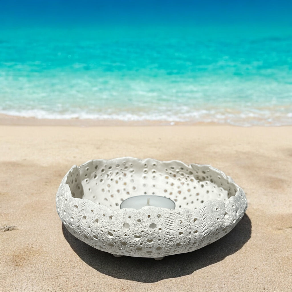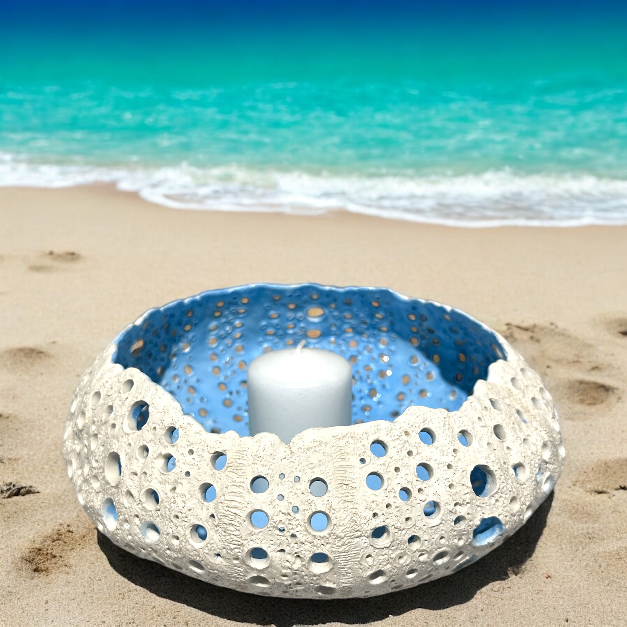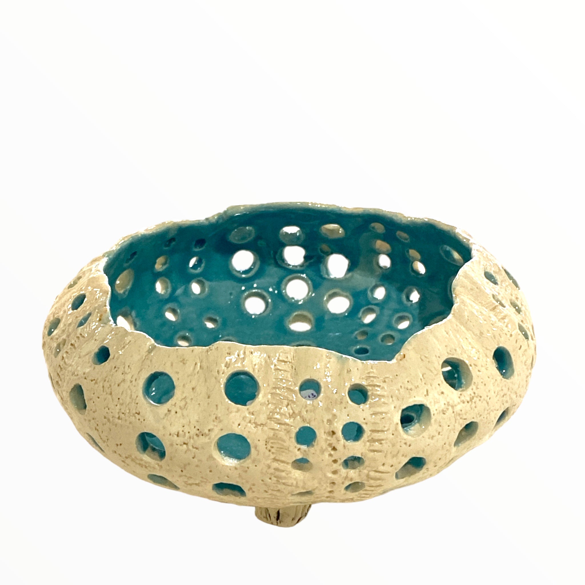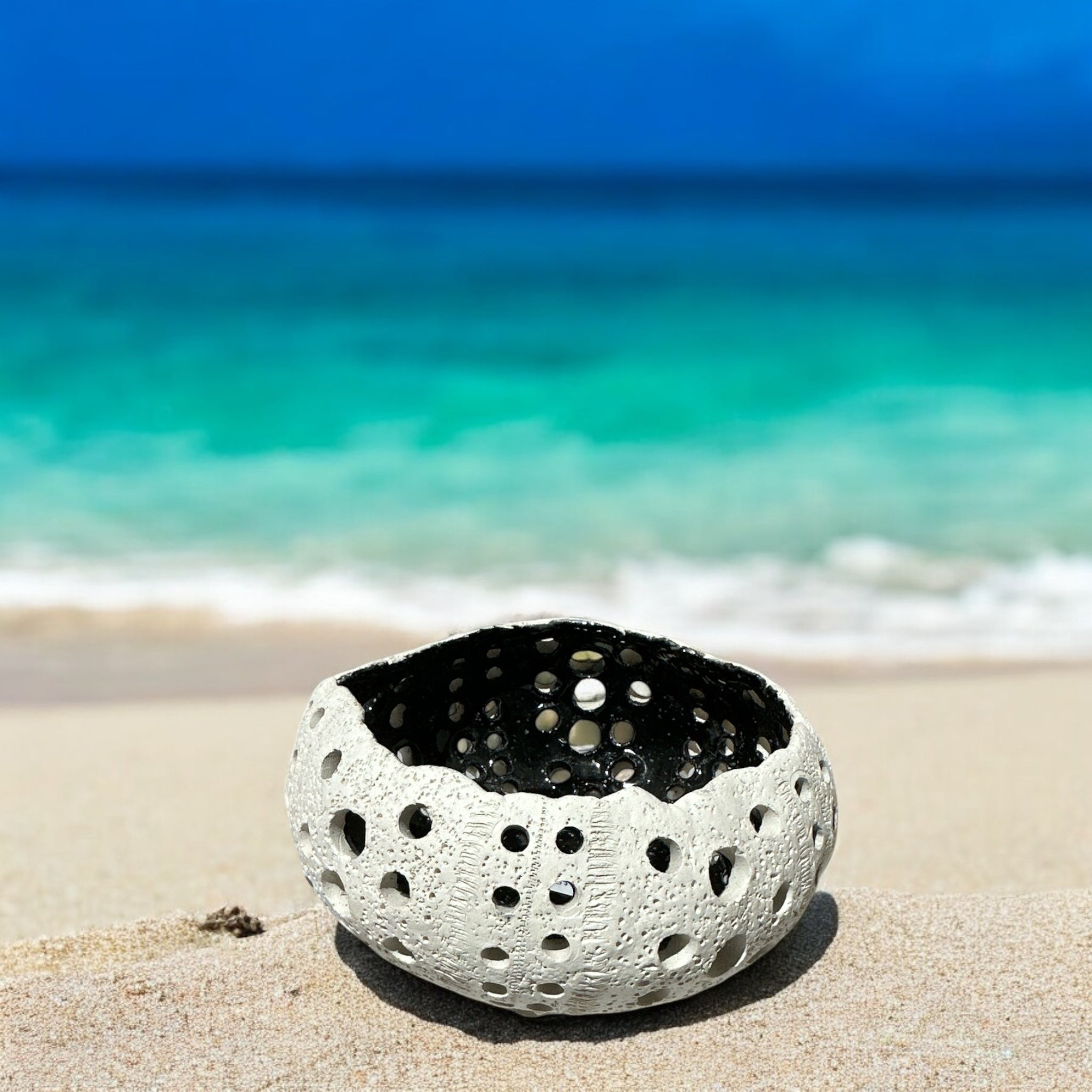The holes are pushed through the pure white porcelain to resemble the spines on the outside. The effect of the glow of light from the candle or the soft led light creates a soothing and comforting atmosphere. Each bowl is hand made to look like a sea urchin. Penny added life like ceramic barnacles on the bottom of each bowl.