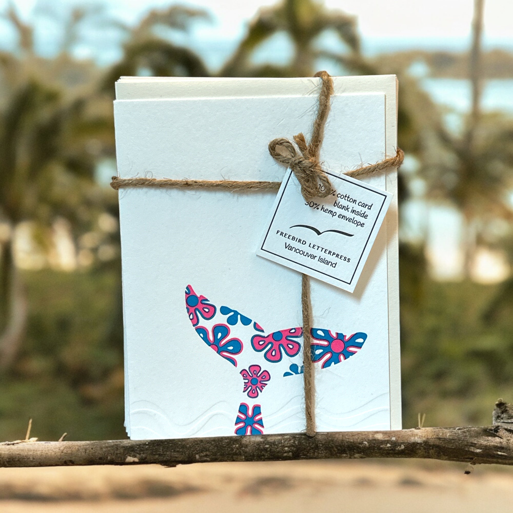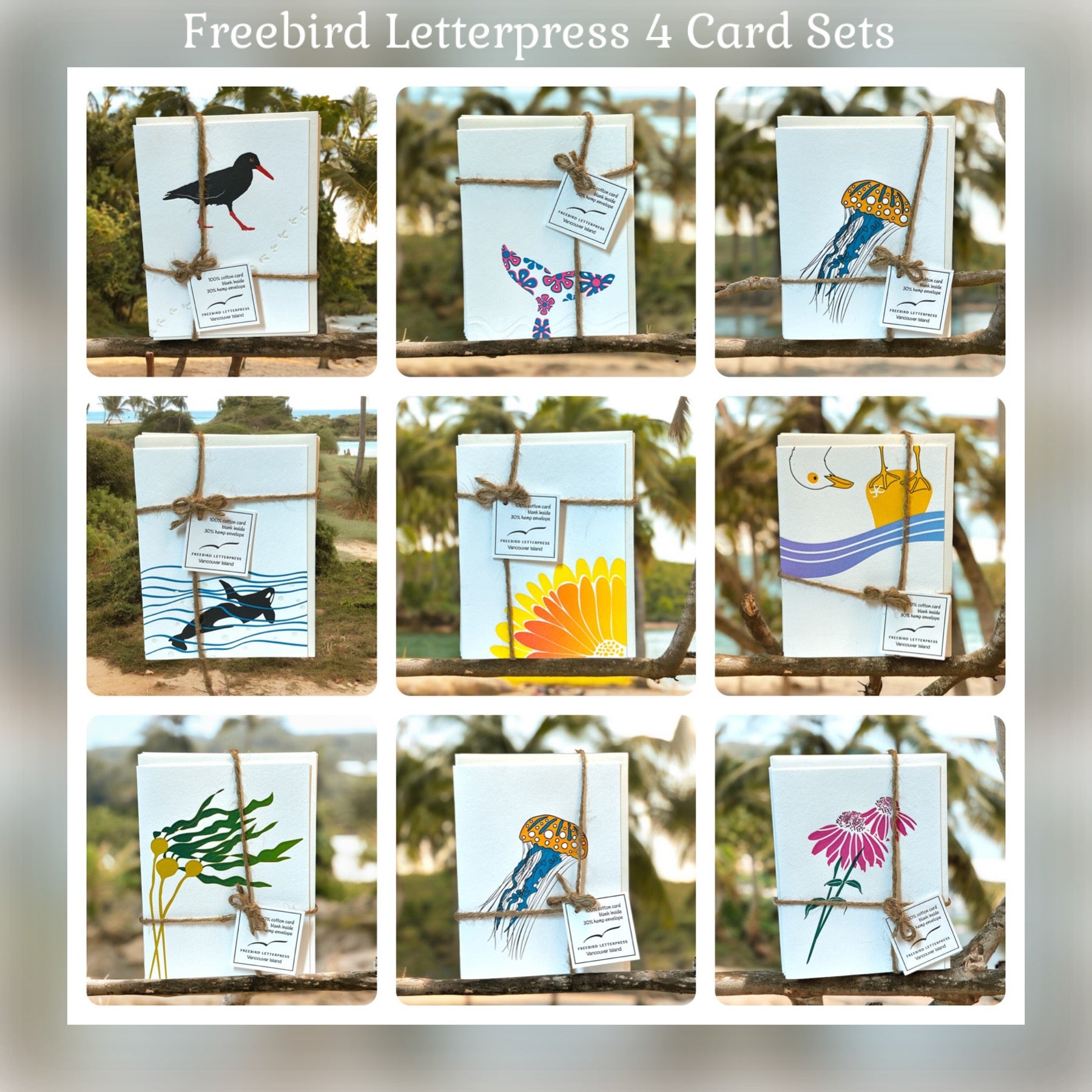 Oyster Catcher, Fern, Red Hearts with Love, Ginko Leaf/Thank You, Groovy Daisy, Orca, Goofy Seagull Floral Whale Tail each in a set of 4