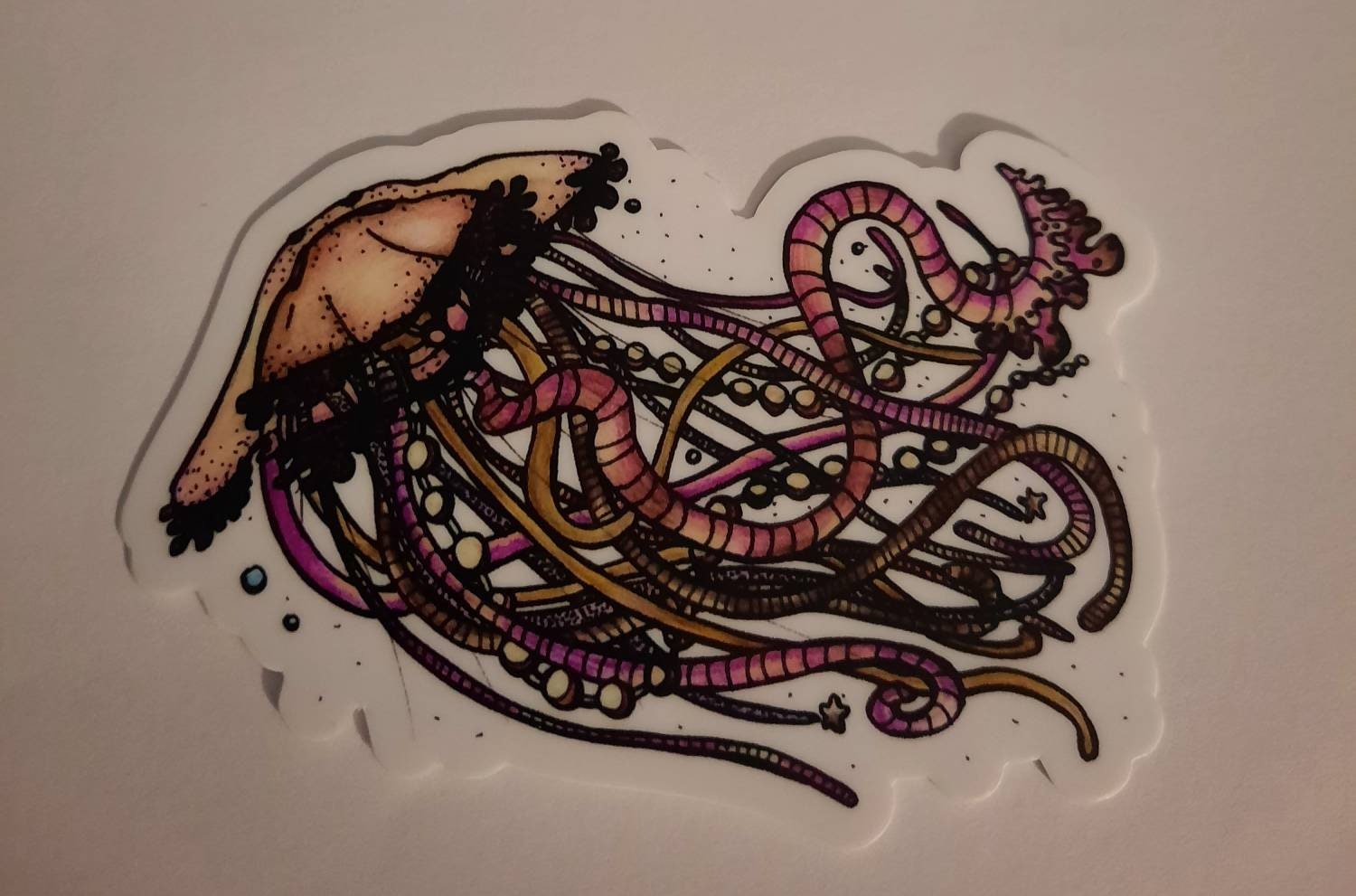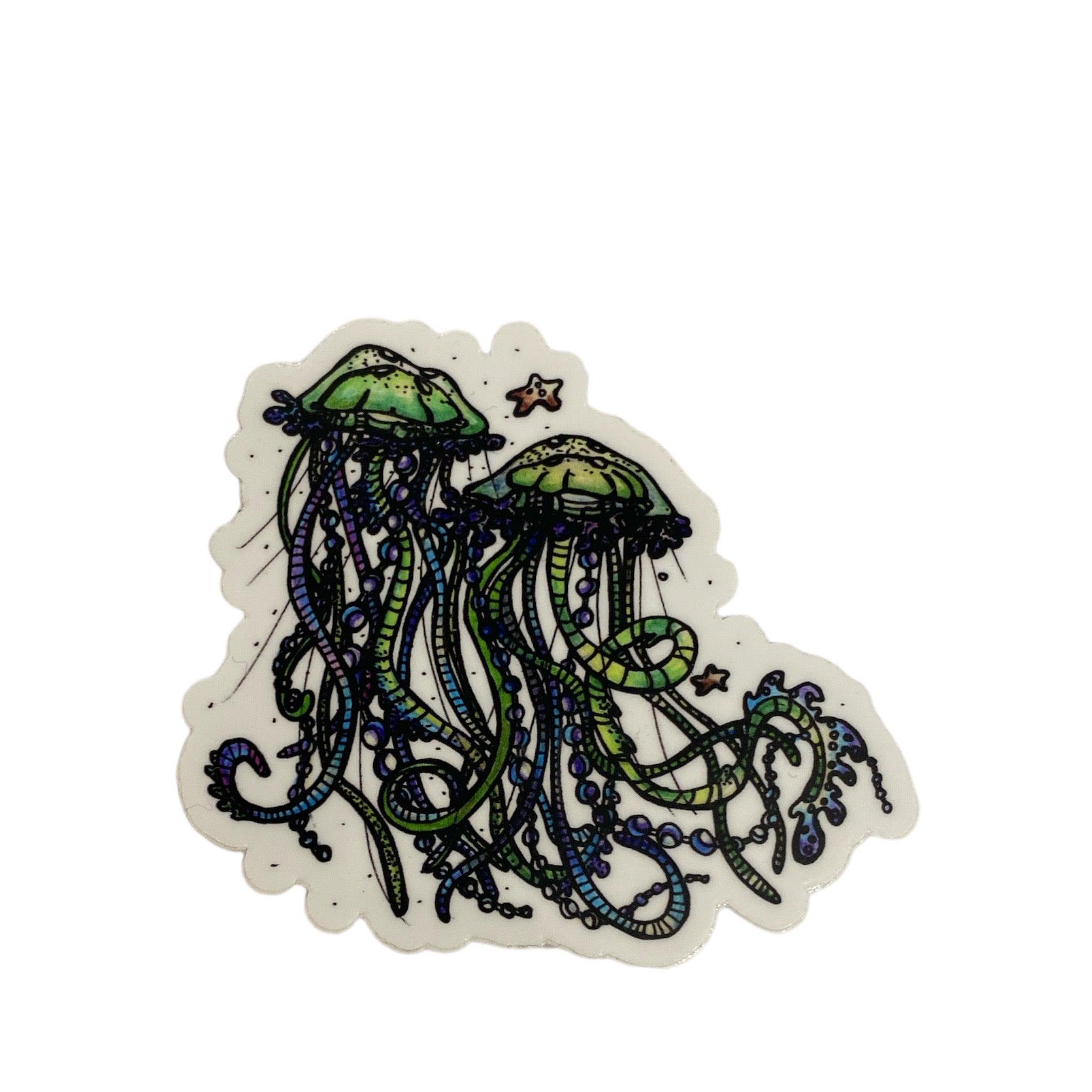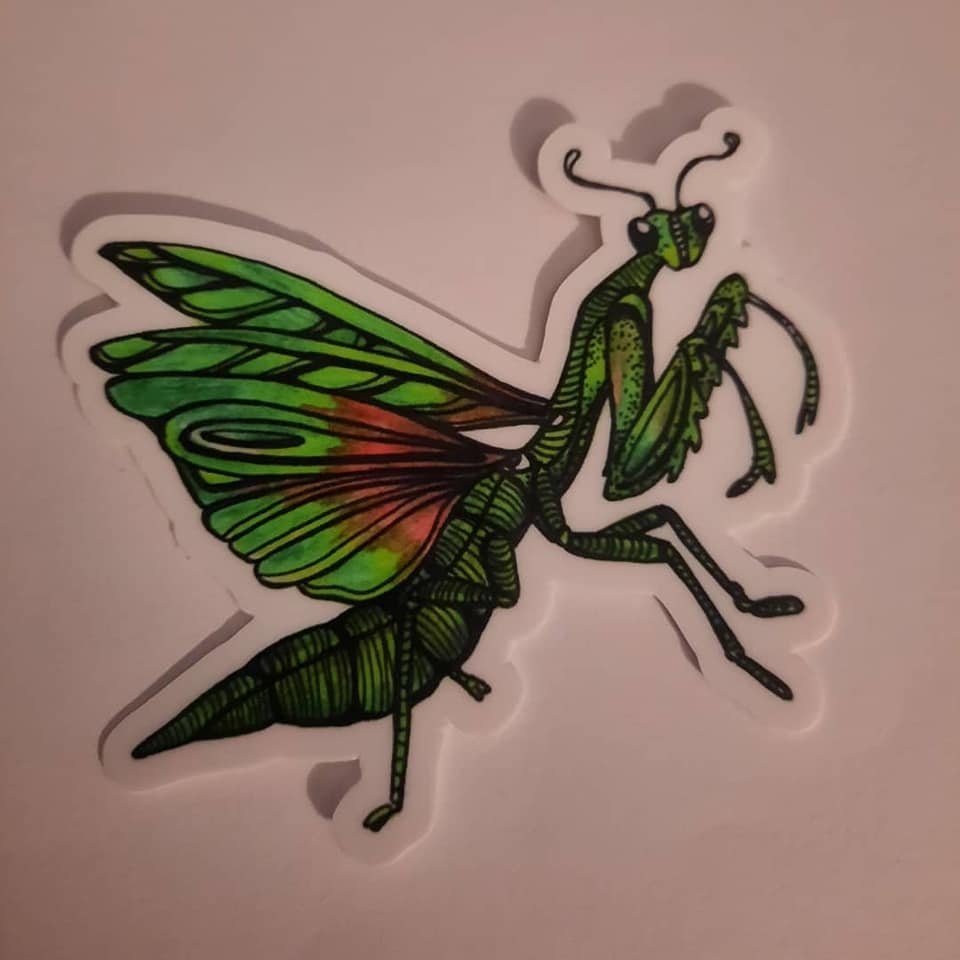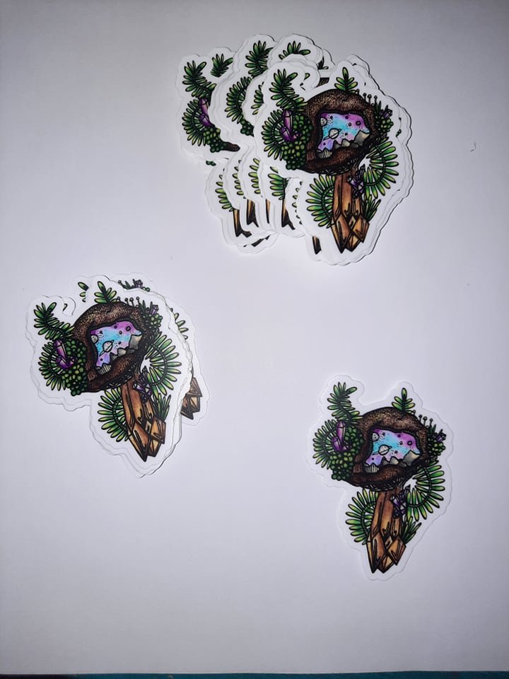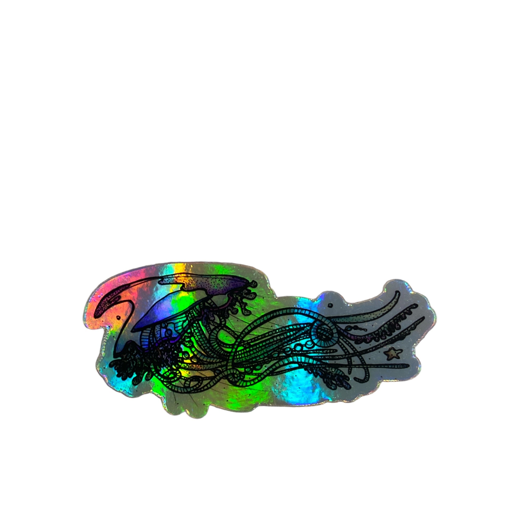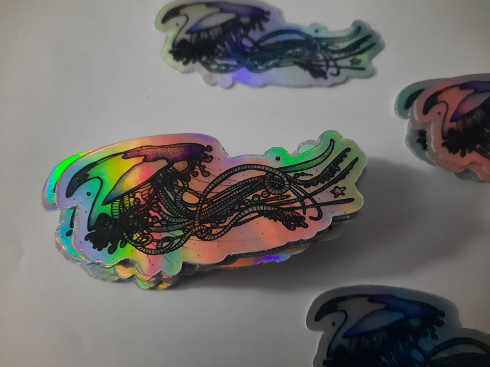 Jessie's beautiful drawing made into vinyl and holographic stickers.