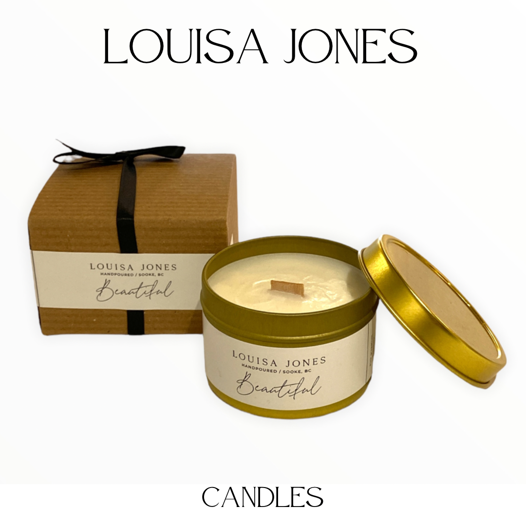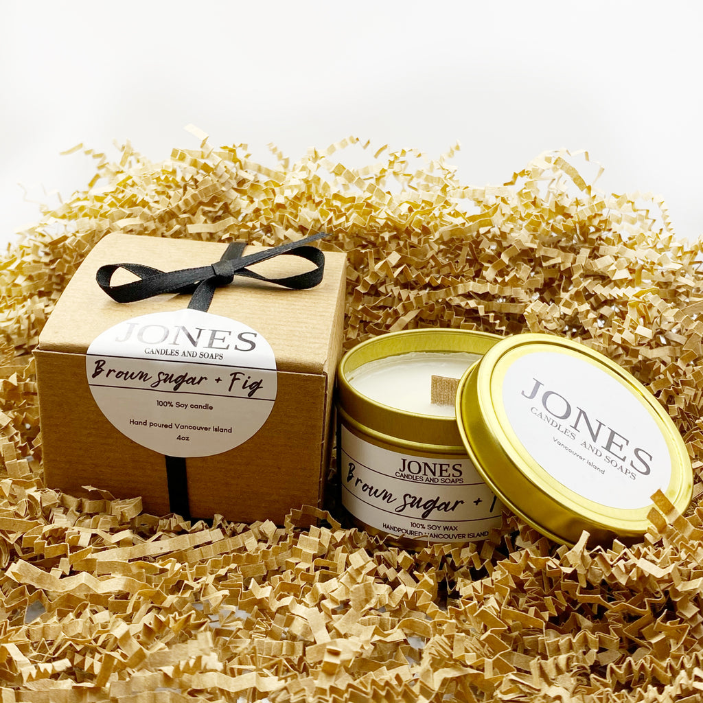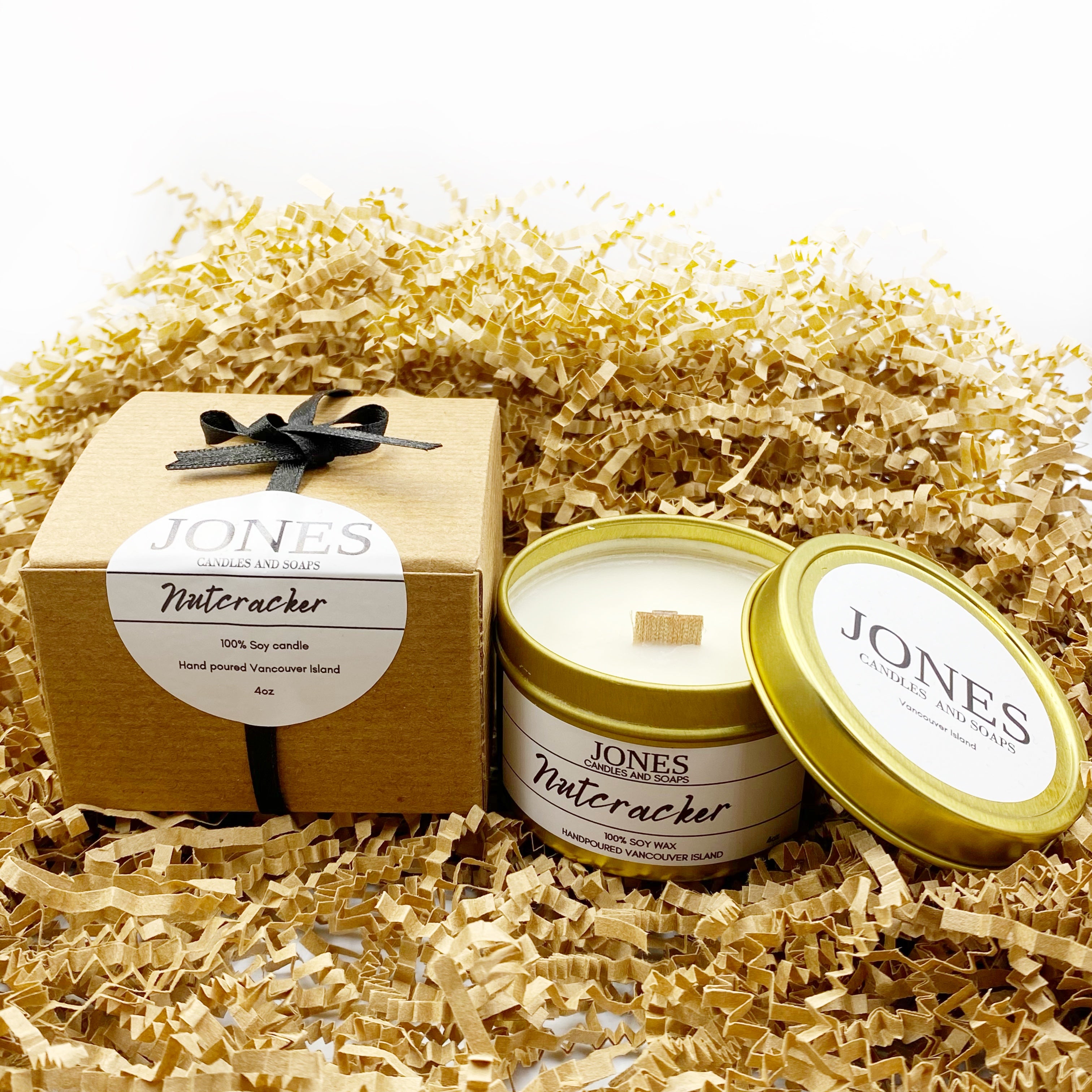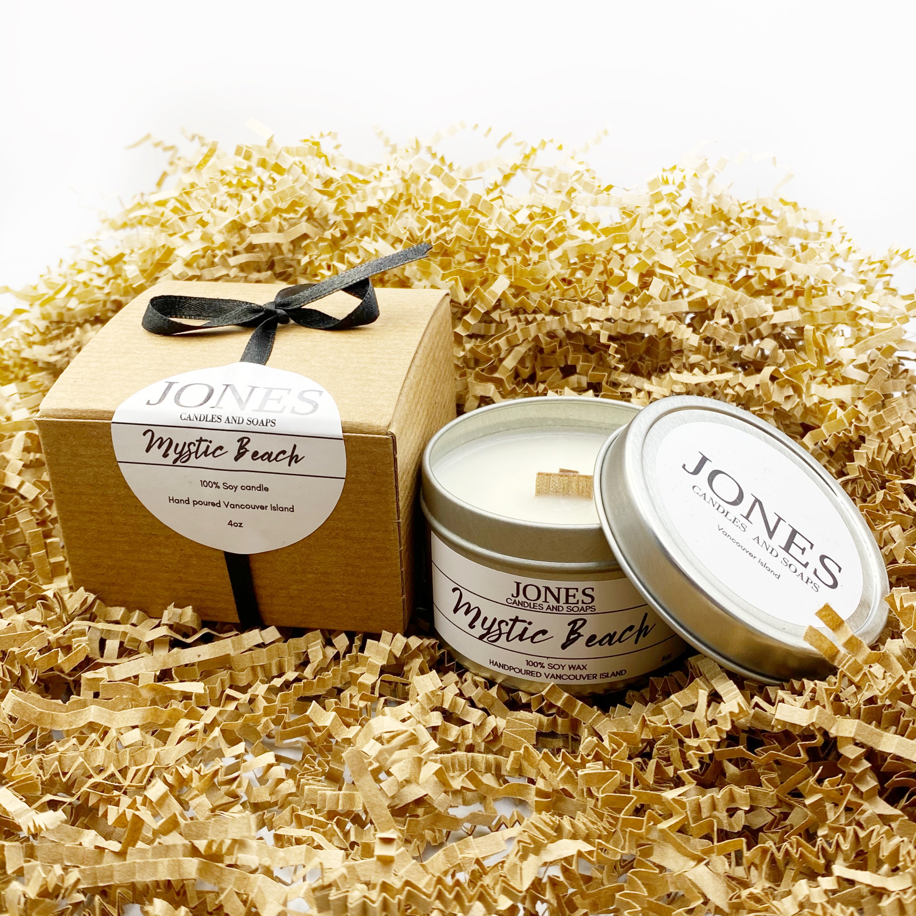 Wooden wick 100% Soy candles in luxe gold and silver tins in a gift box.