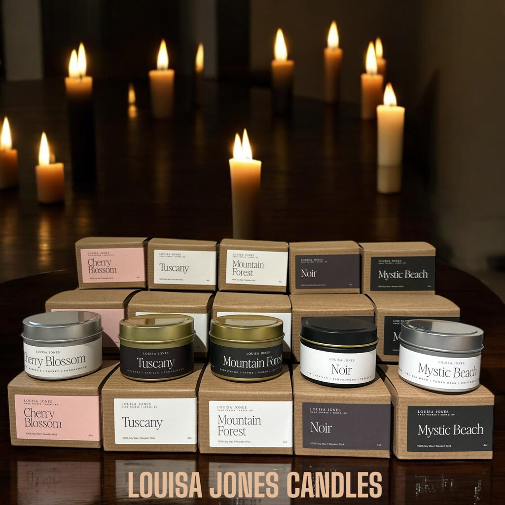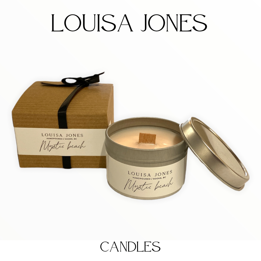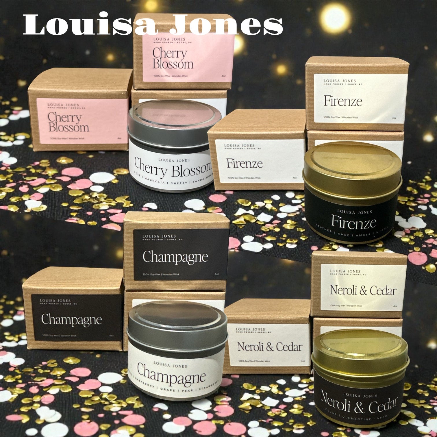 Wooden wick 100% Soy candles in luxe gold and silver tins in a gift box.