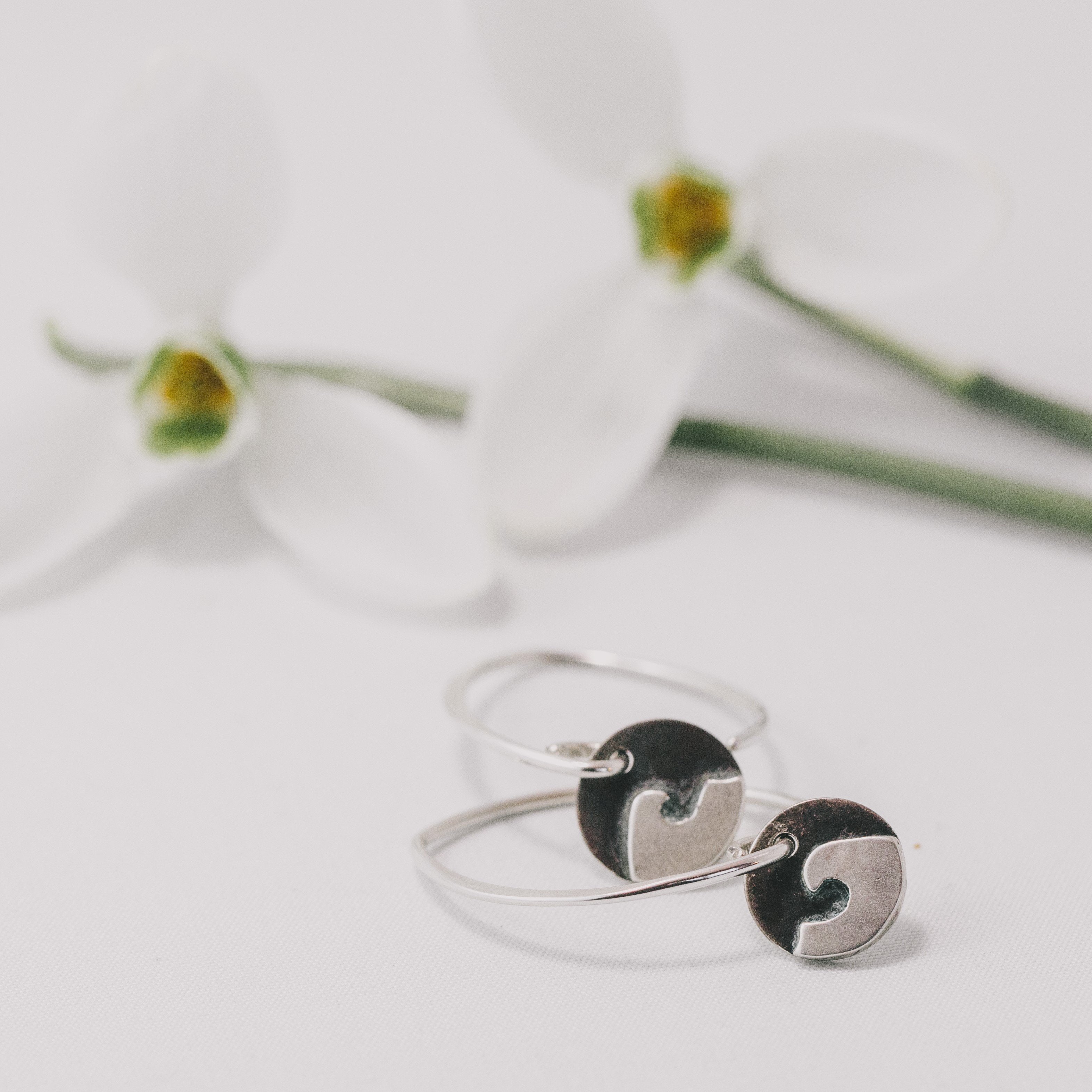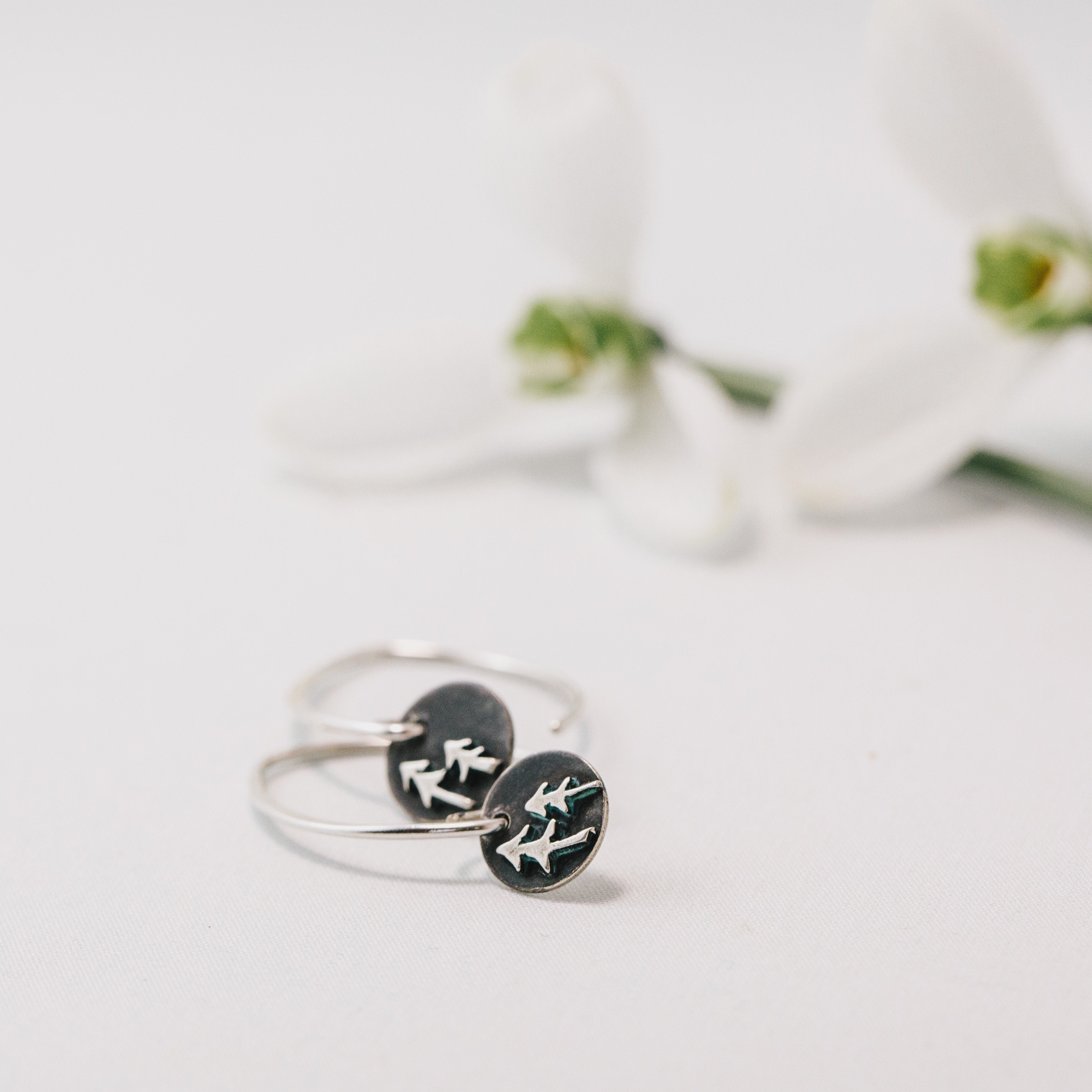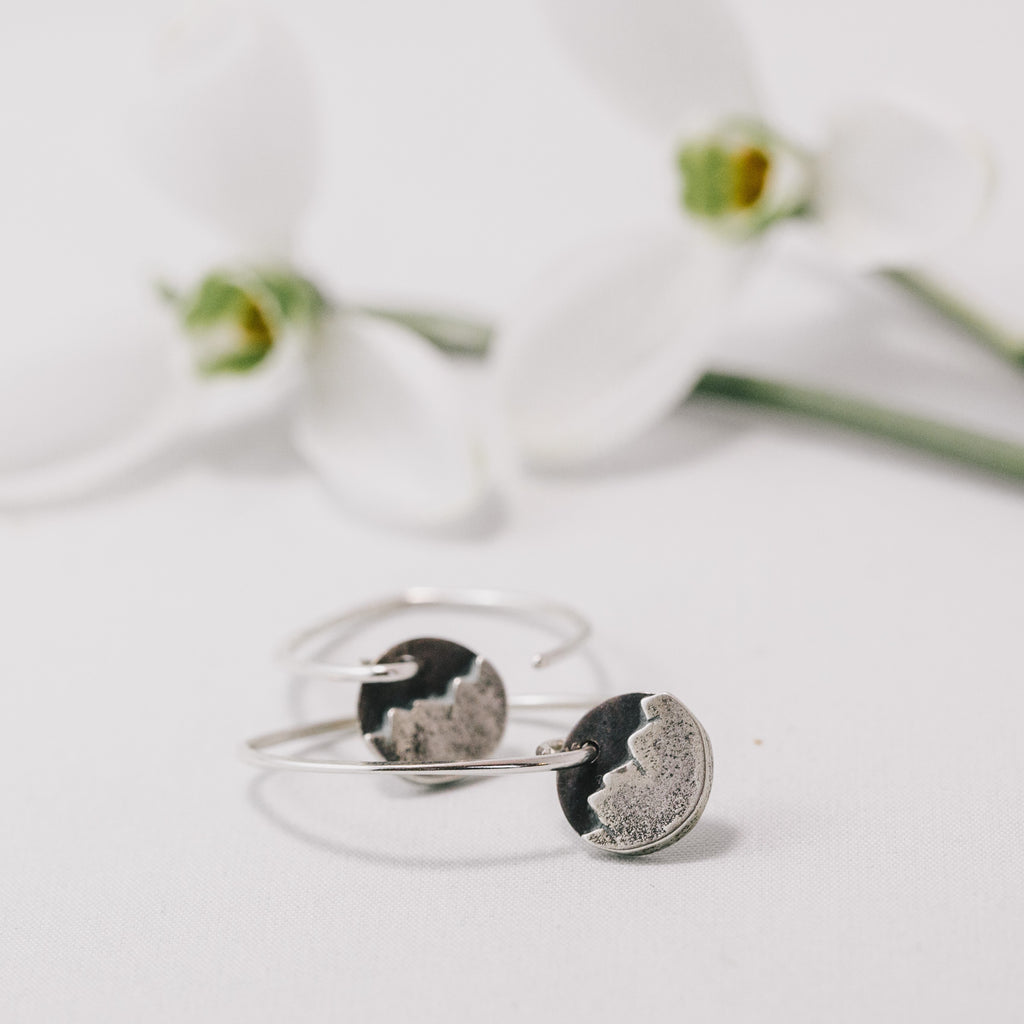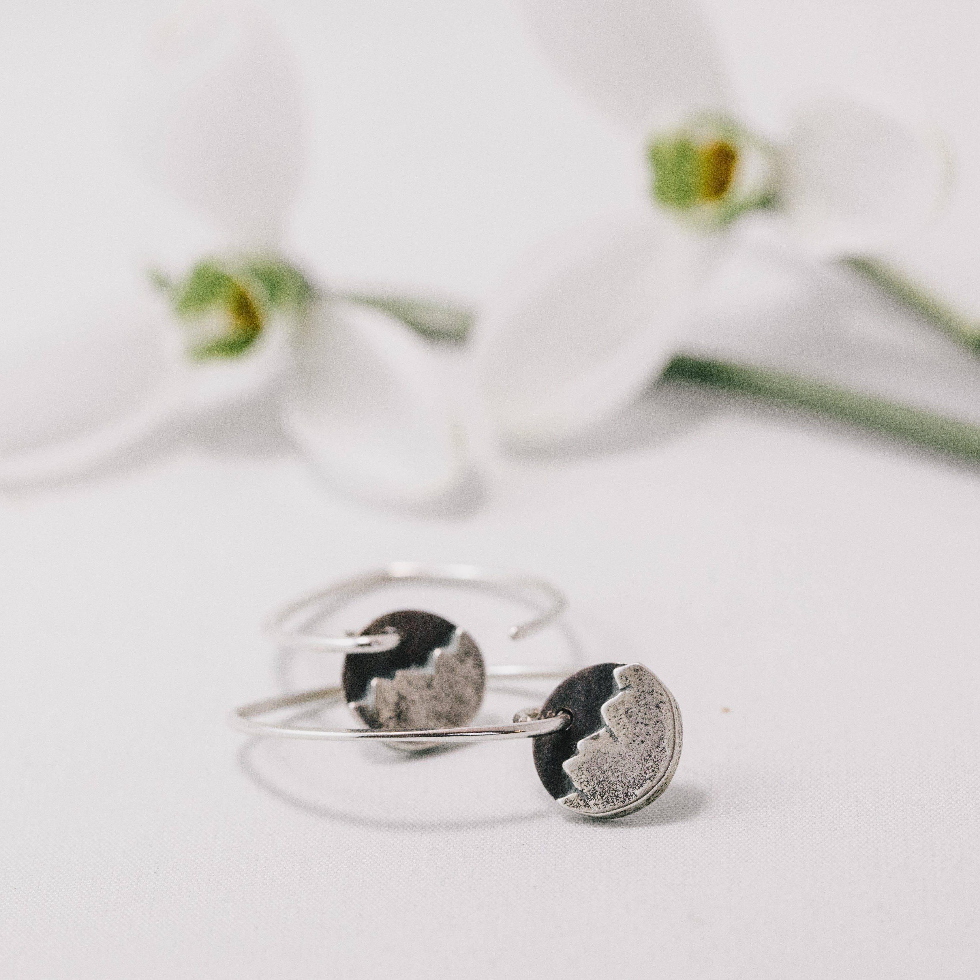 The silver discs on these hanging earrings has been oxidized with a mountain, tree or wave raised west coast design that mimics the view you would have looking out the porthole of a ship while at sea.