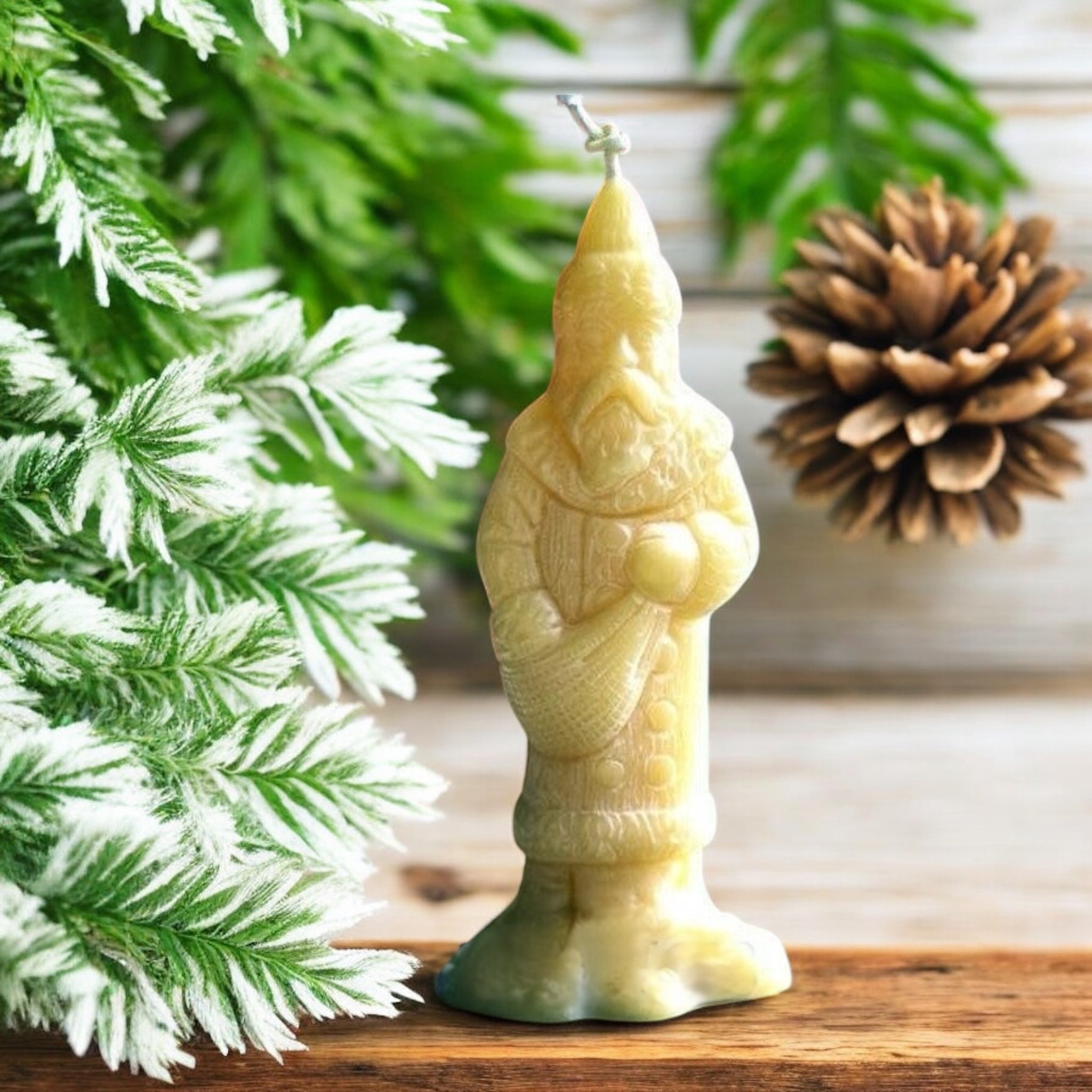 Pure Beeswax Victorian Santa. A traditional Saint Nicholas in jolly splendour; a natural addition to holiday decorating. Cotton Wick, Approx. Burn Time 14-16 hour,(Dimensions 16cm x 7cm x 5cm)
