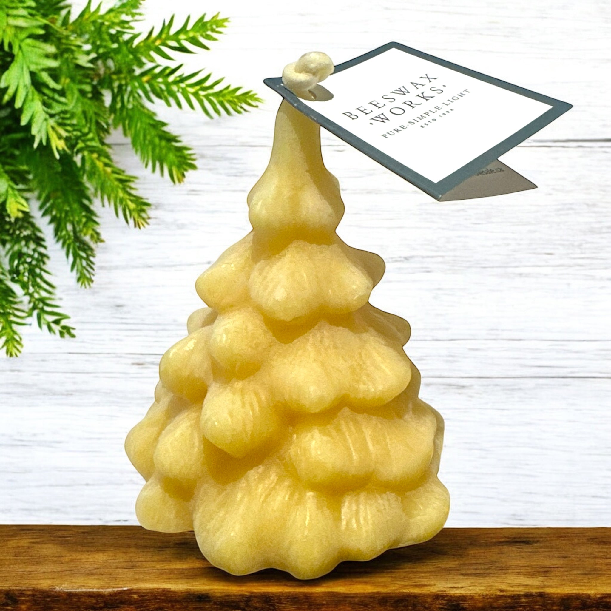 Pure Beeswax Spruce Tree. Evergreen trees have been used in winter celebrations for centuries; another natural holiday decorating basic. Cotton Wick Approx. burning time 16-18 hours (Dimensions 10cm x 9cm x 9cm)