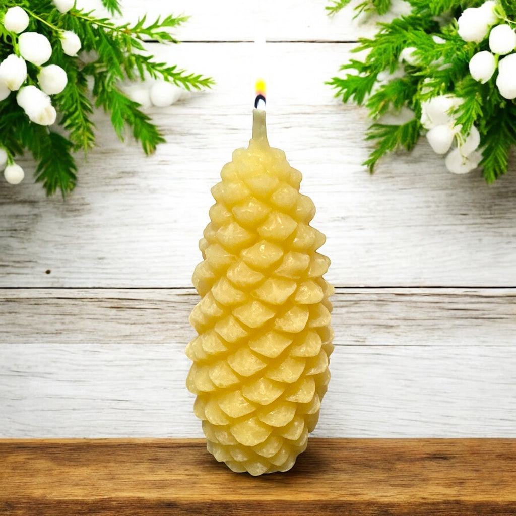 Pure Beeswax Fir Cone. A delicate seed cone is the inspiration for this candle in our Nature Inspired Collection. Cotton Wick, Approx. Burn Time 4-5 hours, (Dimensions 9cm x 4cm x 4cm)
