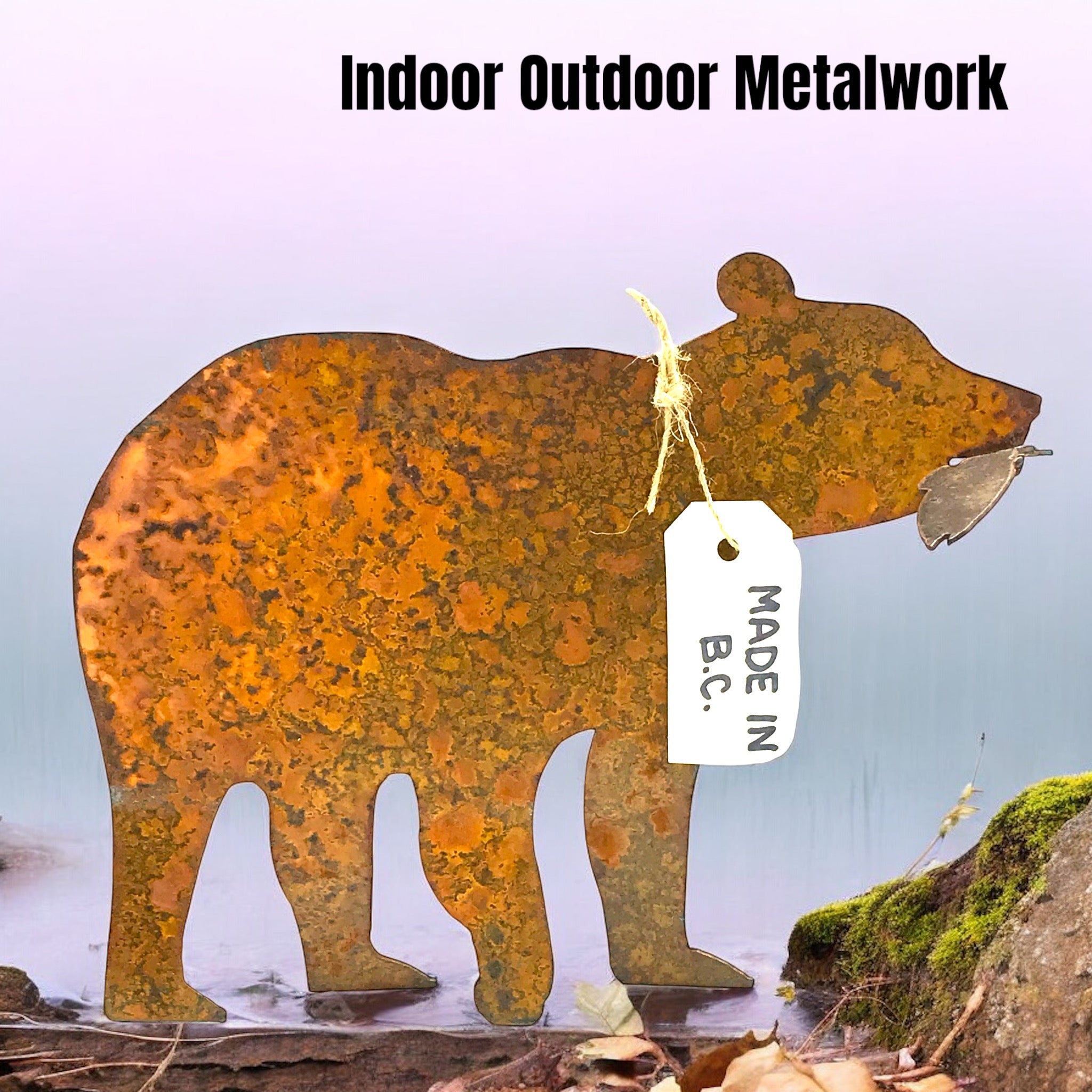 Rusted steel free standing bear. Makes for a beautiful piece that can displayed indoor or outdoor.