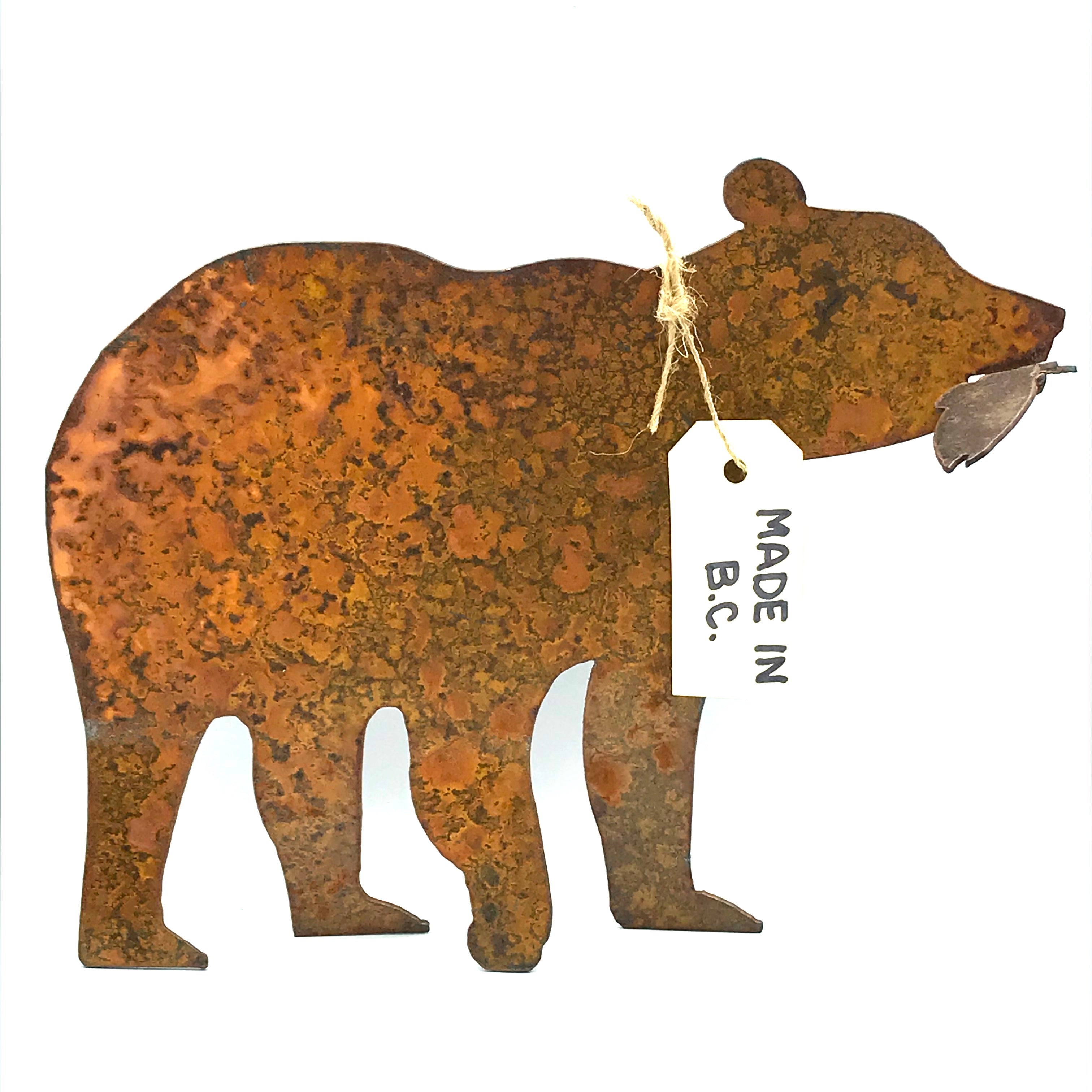 Each piece is hand made. Rosalyn Stanton is from Pemberton, B.C. who does all the cutting of the metal. Renae Lehmann is from Victoria, B.C. and finishes the raw pieces to create the rust and painted designs.