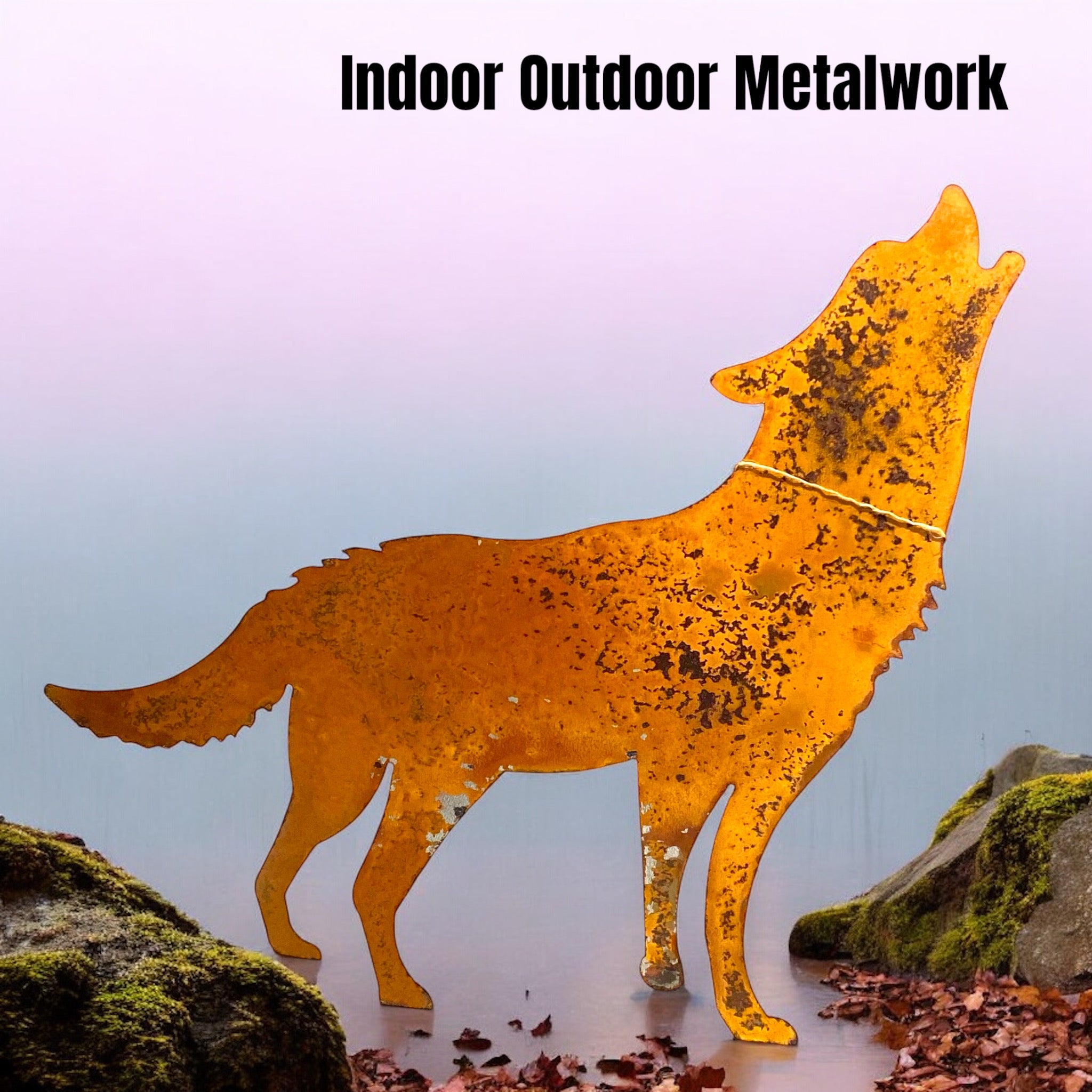 Decorative rusted steel standing wolf. Makes for a beautiful piece that can displayed indoor or outdoor.