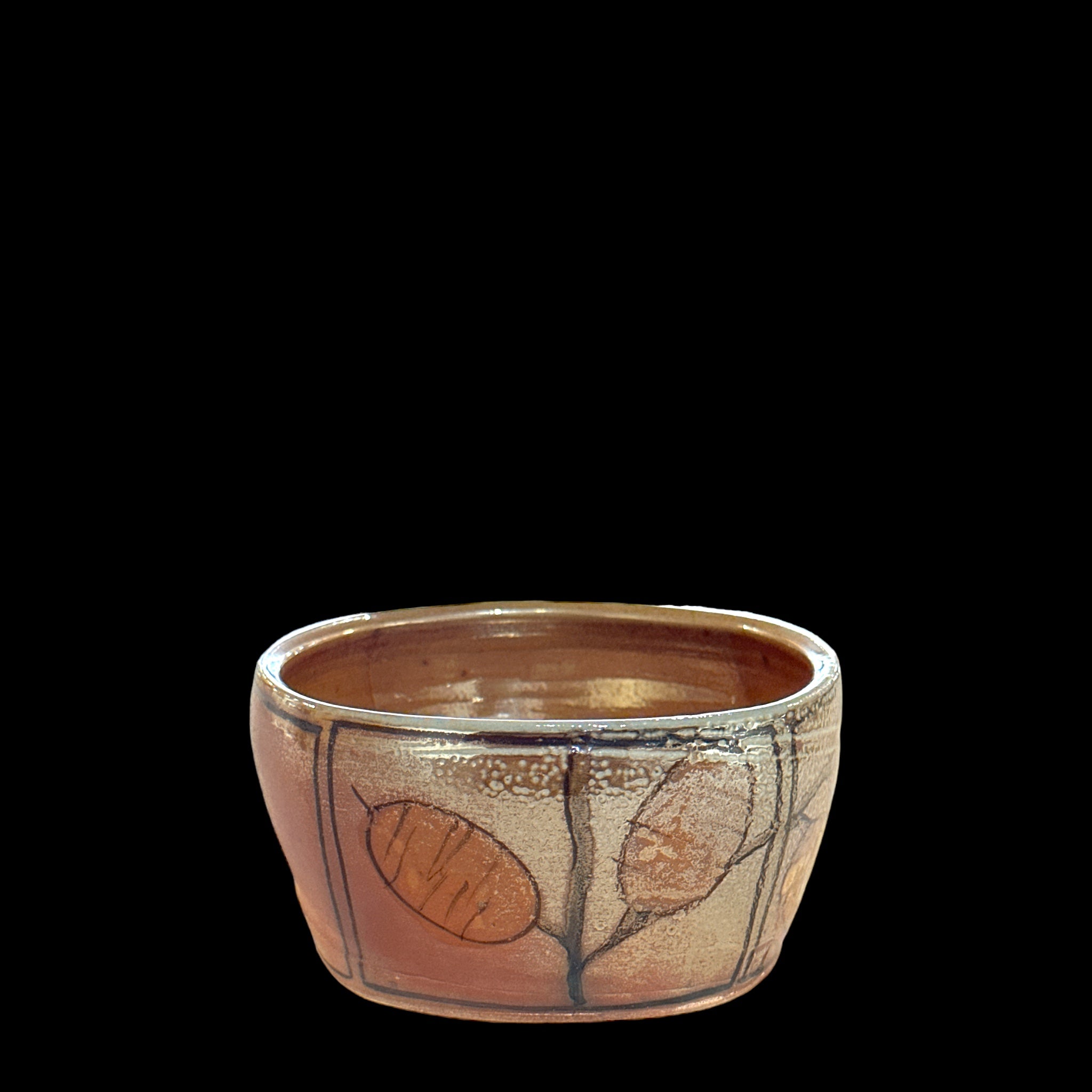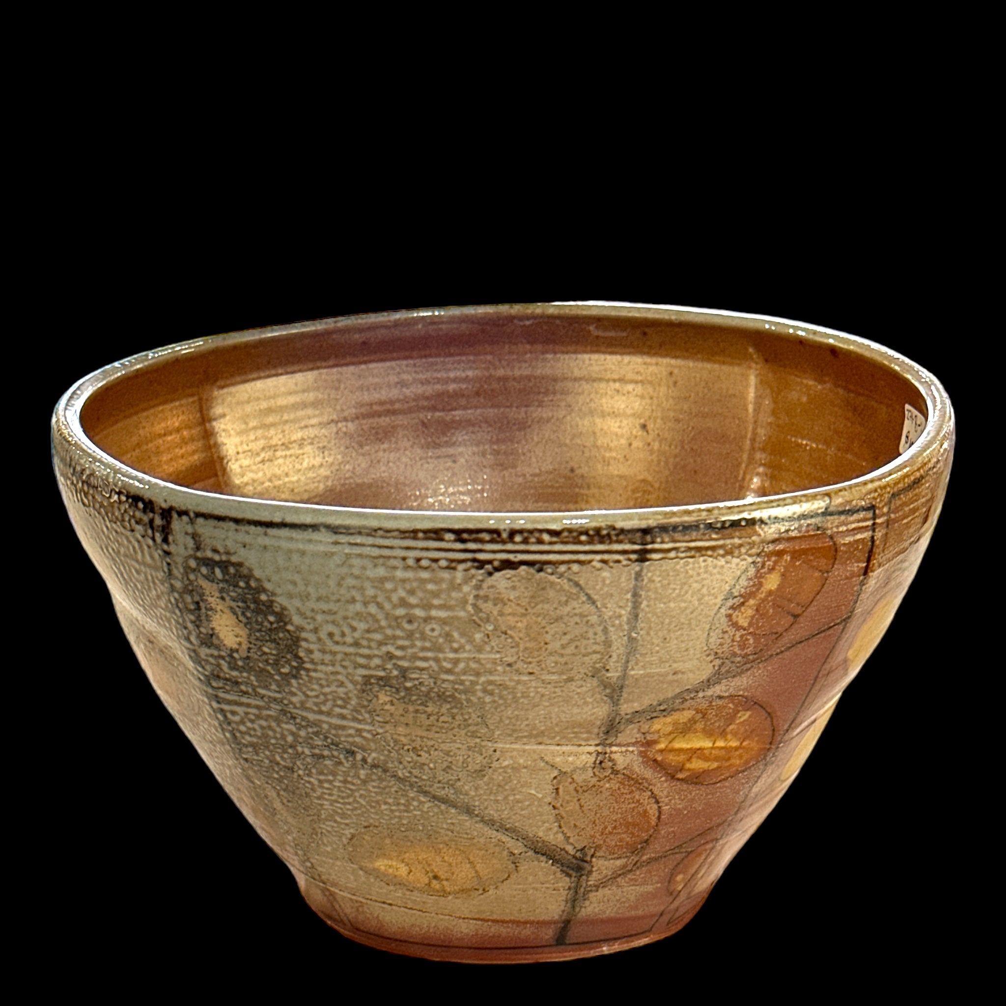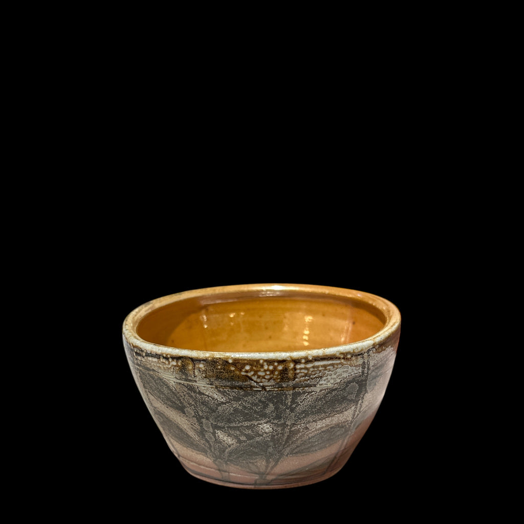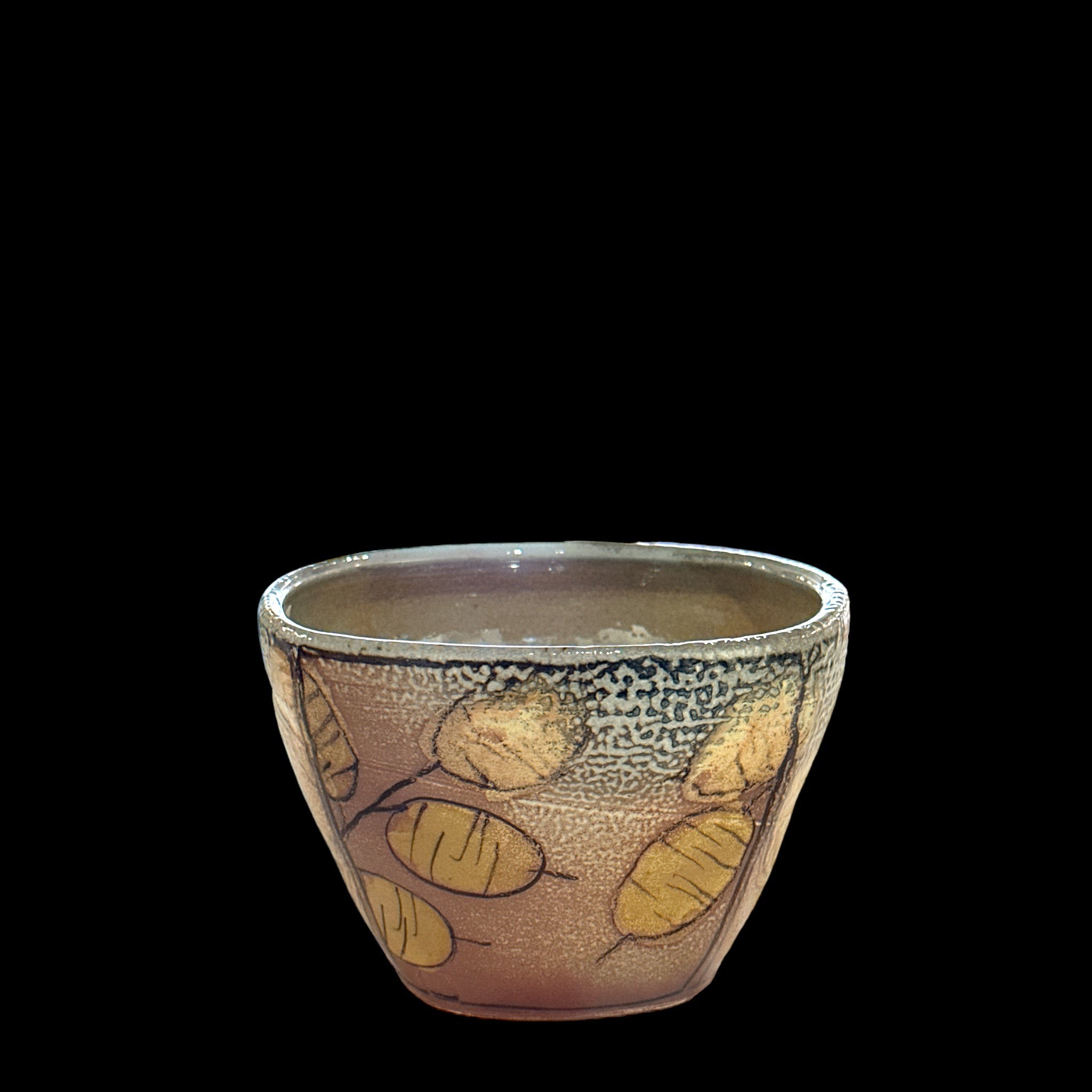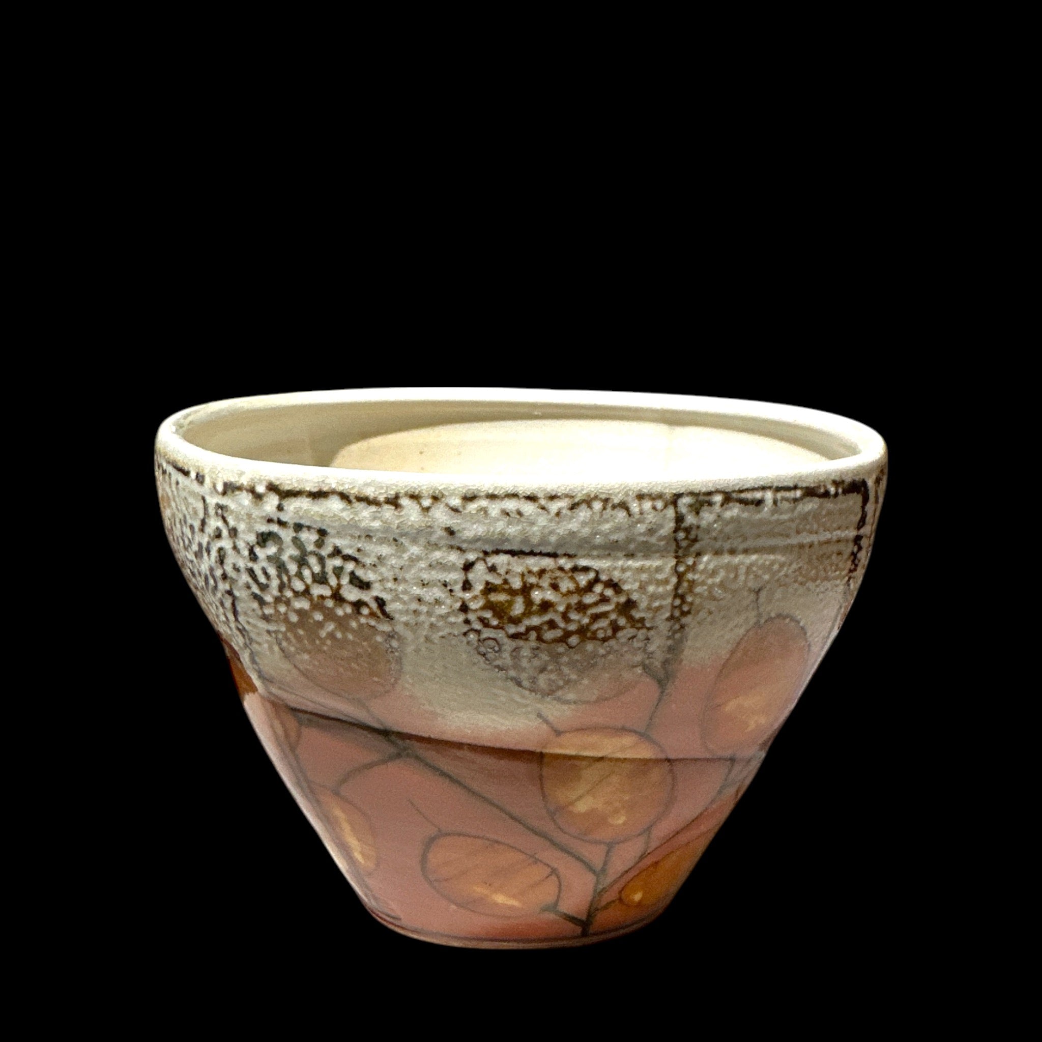 Prior to firing, each piece is dipped with a watery slip then most of the interiors are glazed by dipping with a variety of individually made glazes (usually a Shino glaze). Some pieces have the watery slip or glaze sprayed on the inside and/or outer surfaces. The exterior surfaces have a variety of metal oxides and terra sigillatas (no glazes) that produces a colour range in the hues of nature. The crispness in colours and varying surface textures are produced by the salt-firing.