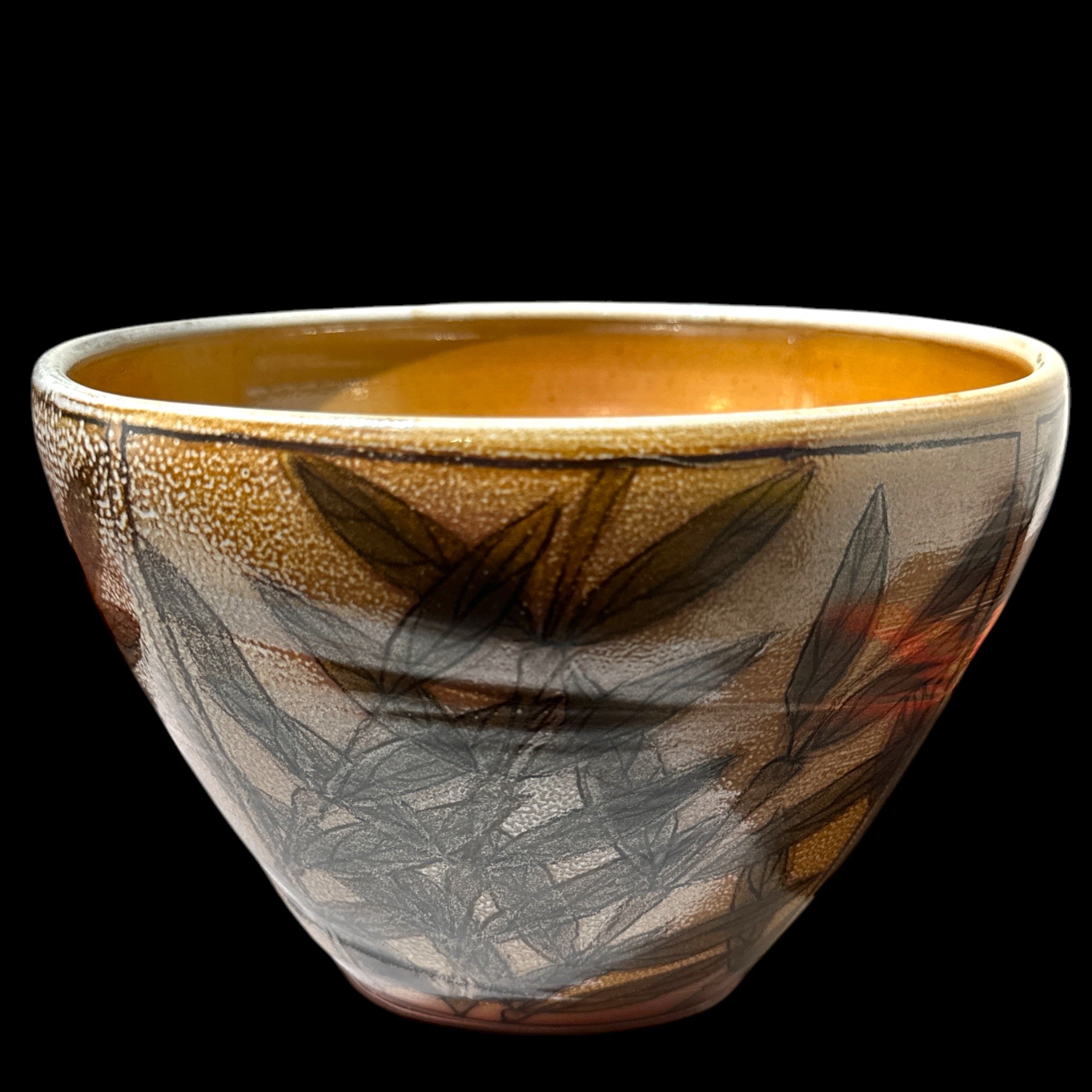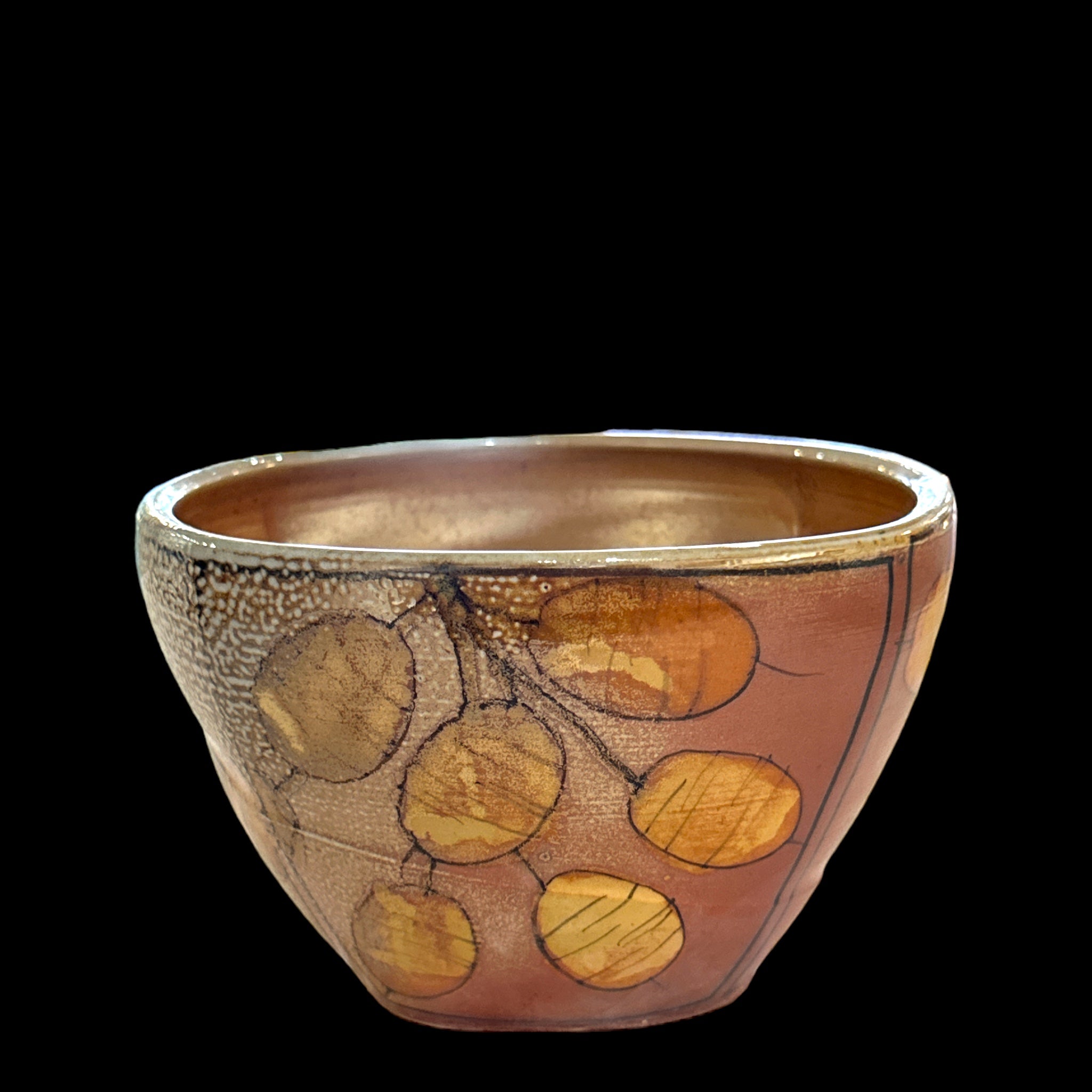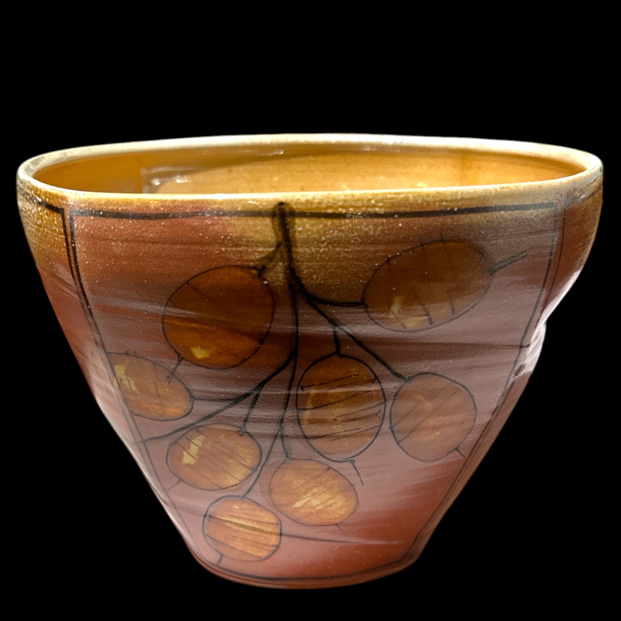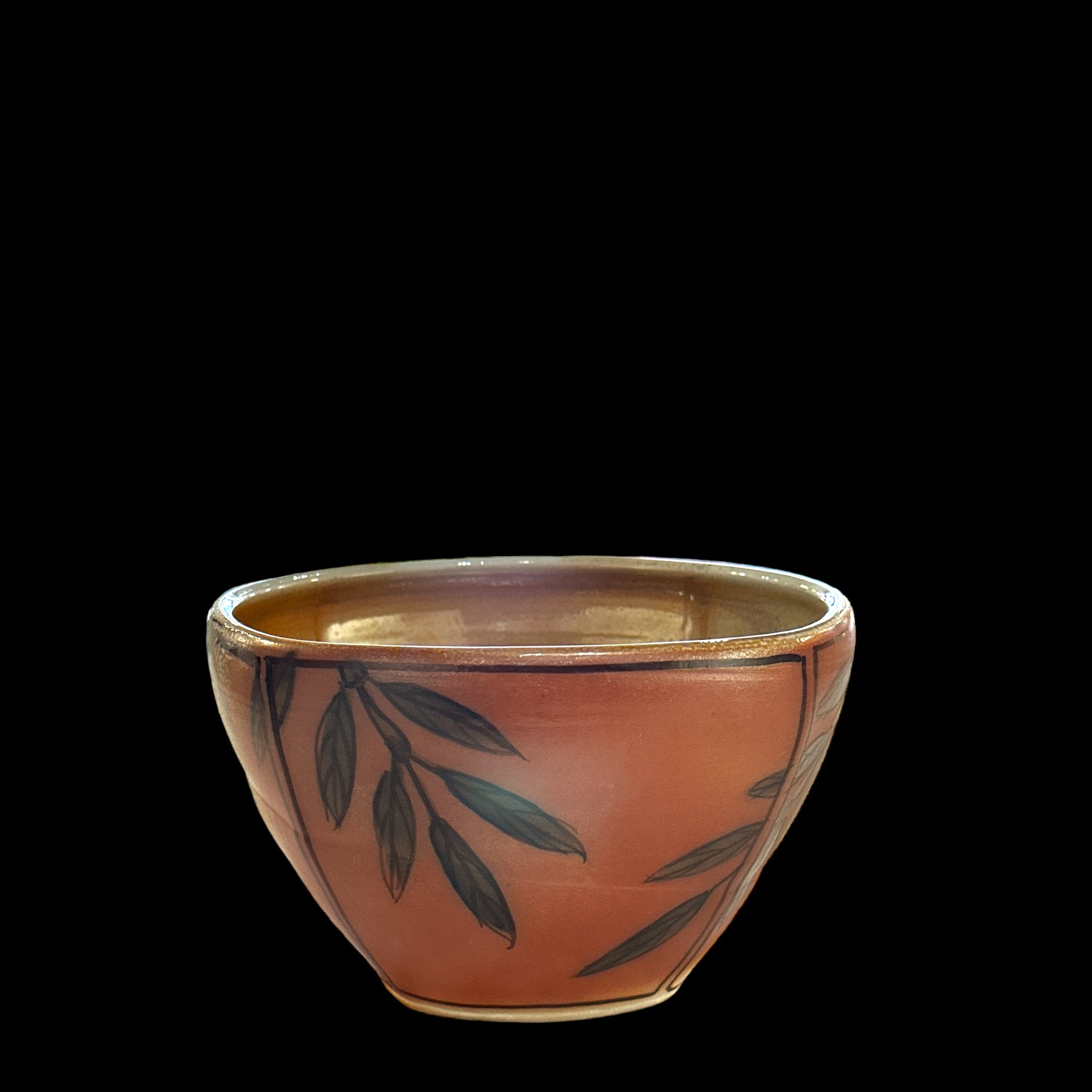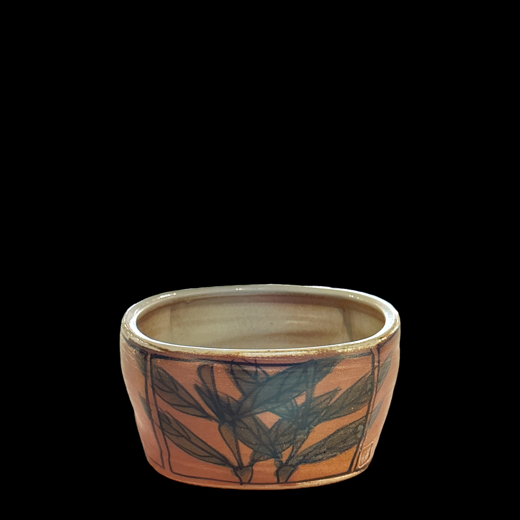 Prior to firing, each piece is dipped with a watery slip then most of the interiors are glazed by dipping with a variety of individually made glazes (usually a Shino glaze). Some pieces have the watery slip or glaze sprayed on the inside and/or outer surfaces. The exterior surfaces have a variety of metal oxides and terra sigillatas (no glazes) that produces a colour range in the hues of nature. The crispness in colours and varying surface textures are produced by the salt-firing.
