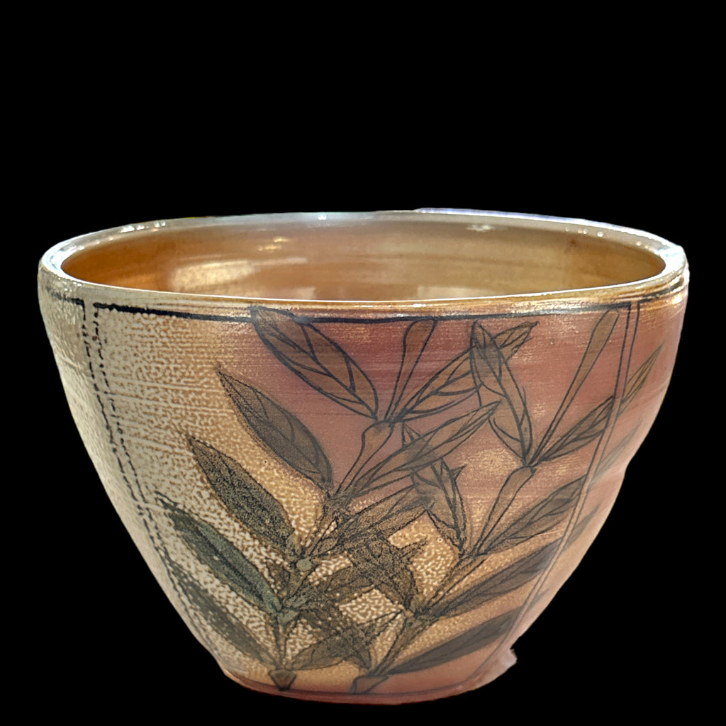 Late in the gas firing, I roll up "burritoes" made of salt and baking soda and wood shavings and put them in to the kiln by dropping them in to the kiln on a piece of angle iron. Once in the kiln, they volitize sending salt vapour moving with the gas flame among the pieces of pottery. The resulting outside surfaces vary from side to side due to the direction of the flame with the salt vapour interacting with the pieces as the flame weaves through the kiln.