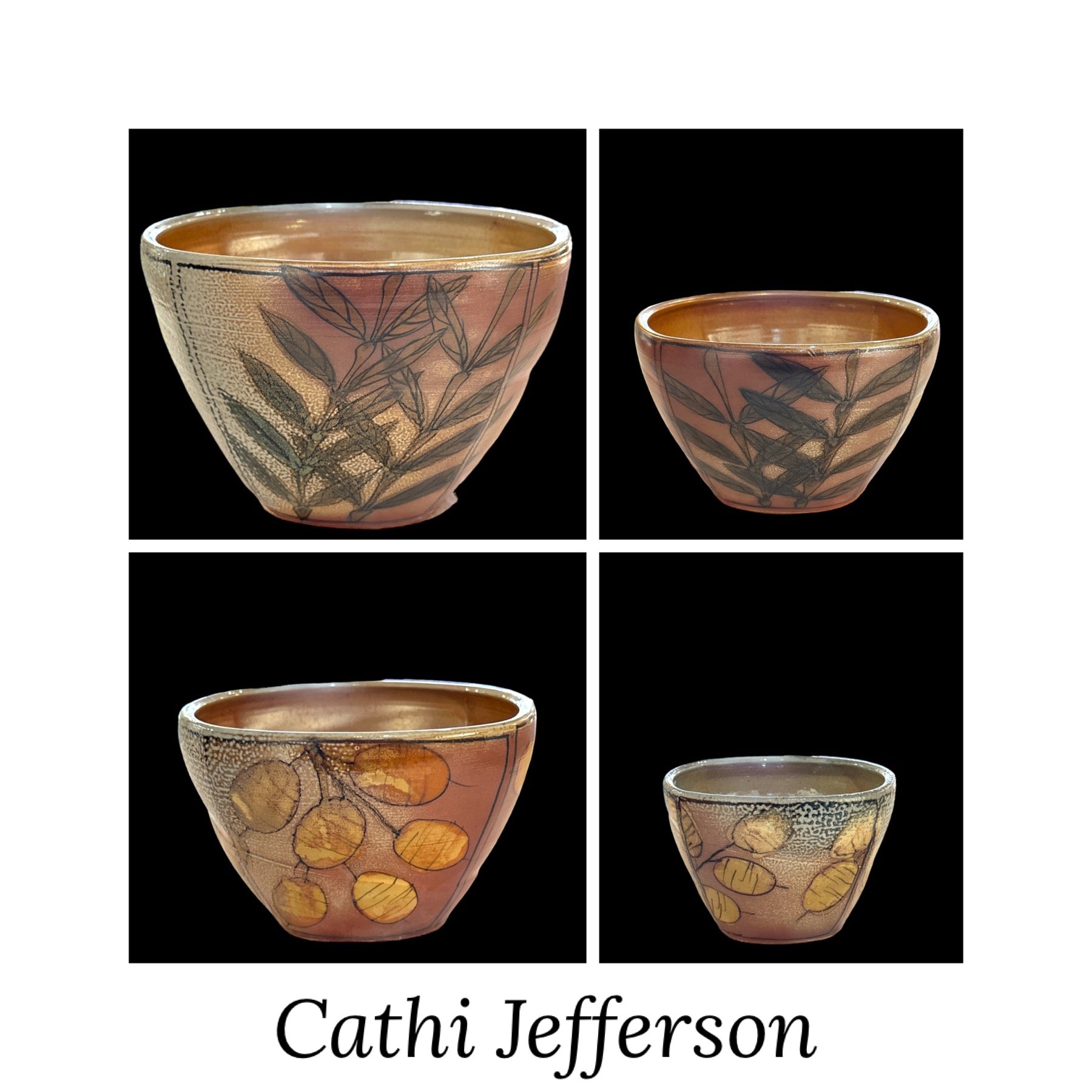 Cathi Jefferson wrote "Salt-Firing Each piece of my pottery is fired to high - temperature stoneware (cone 10 / 2400 degrees F or 1300 degrees Celcius in a 40 cubic foot gas car kiln.