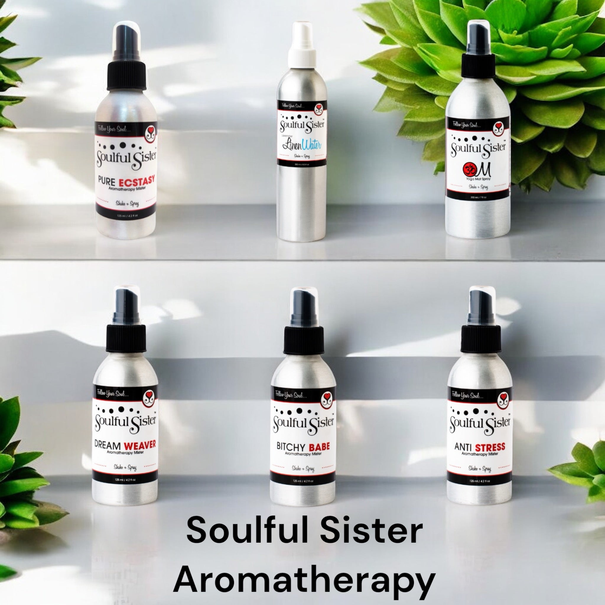 Soulful Sister aromatherapy provides you with amazing products using essential oils. We make Aromatherapy misters, body lotion bars, roll-ons, linen water and more. We use only the best, most natural ingredients in our products. All of our products are free of chemicals, synthetic fragrances, toxic preservatives, mineral oils, and anything petroleum based. We have everything you need for feeling your best. Whether it is 'Bitchy Babe', 'Anti-Stress', 'Pure Ecstasy' or 'Dream Weaver', Soulful Sister has your product.