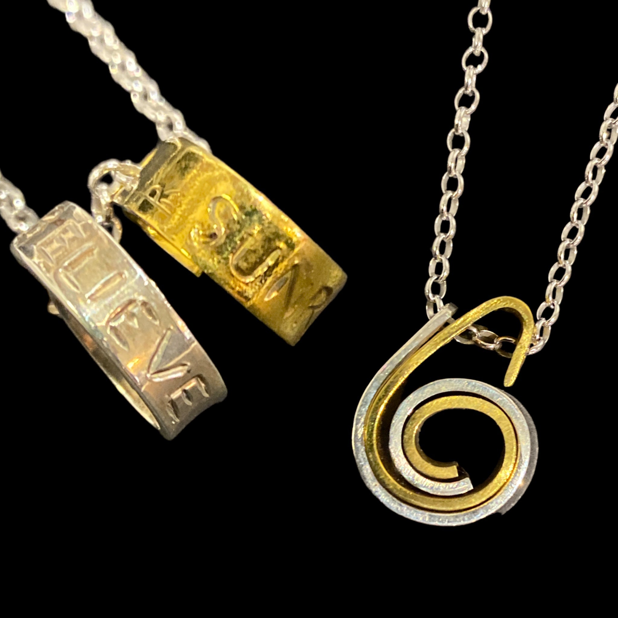 Often his designs are a fusion of natural shapes with semi precious stones and he enjoys experimenting with mixed metals.