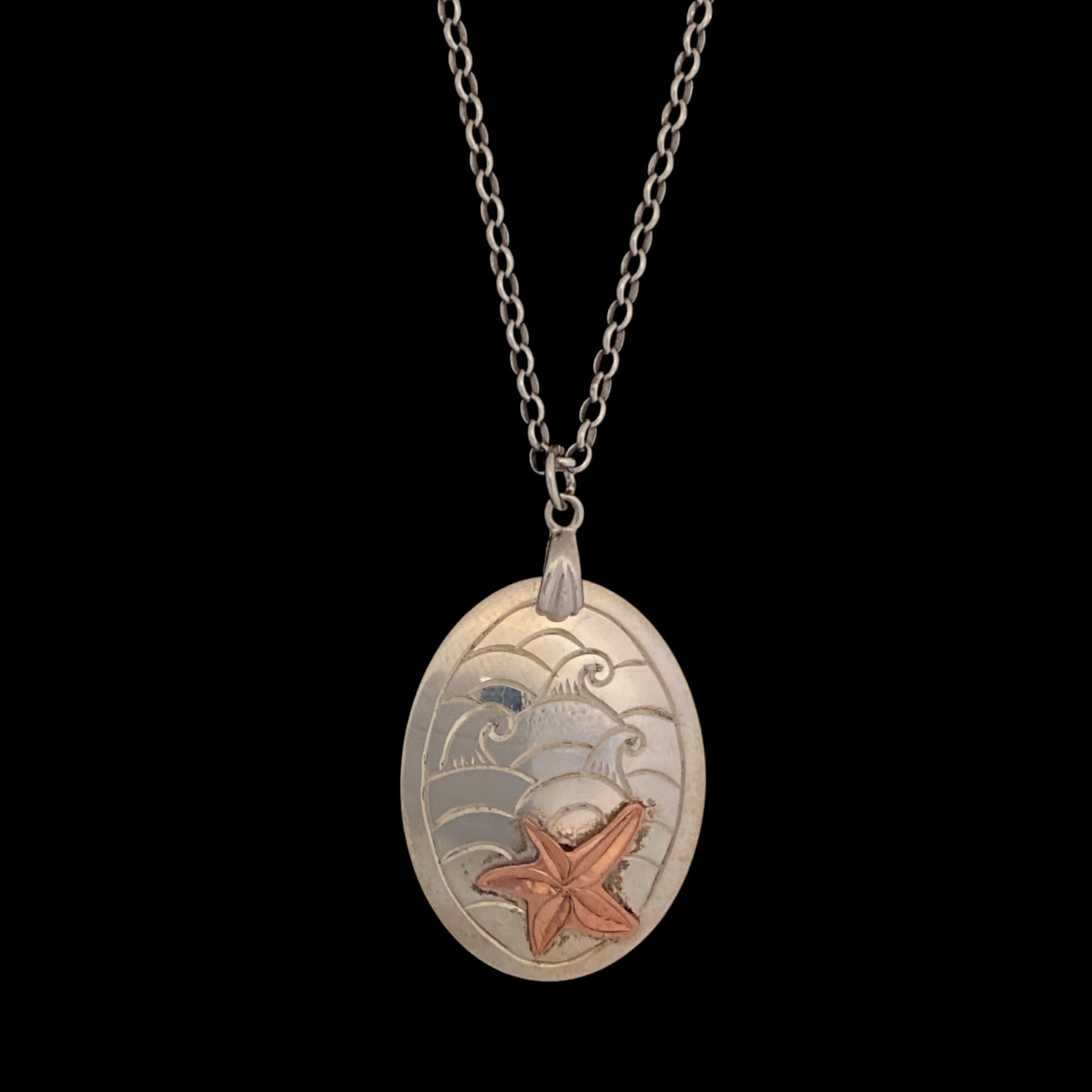 A recent line of jewelry includes the use of copper sand dollars, starfish and orcas with several wave pattern engravings. These delicate hand engravings are inspired by the beauty of our coast.