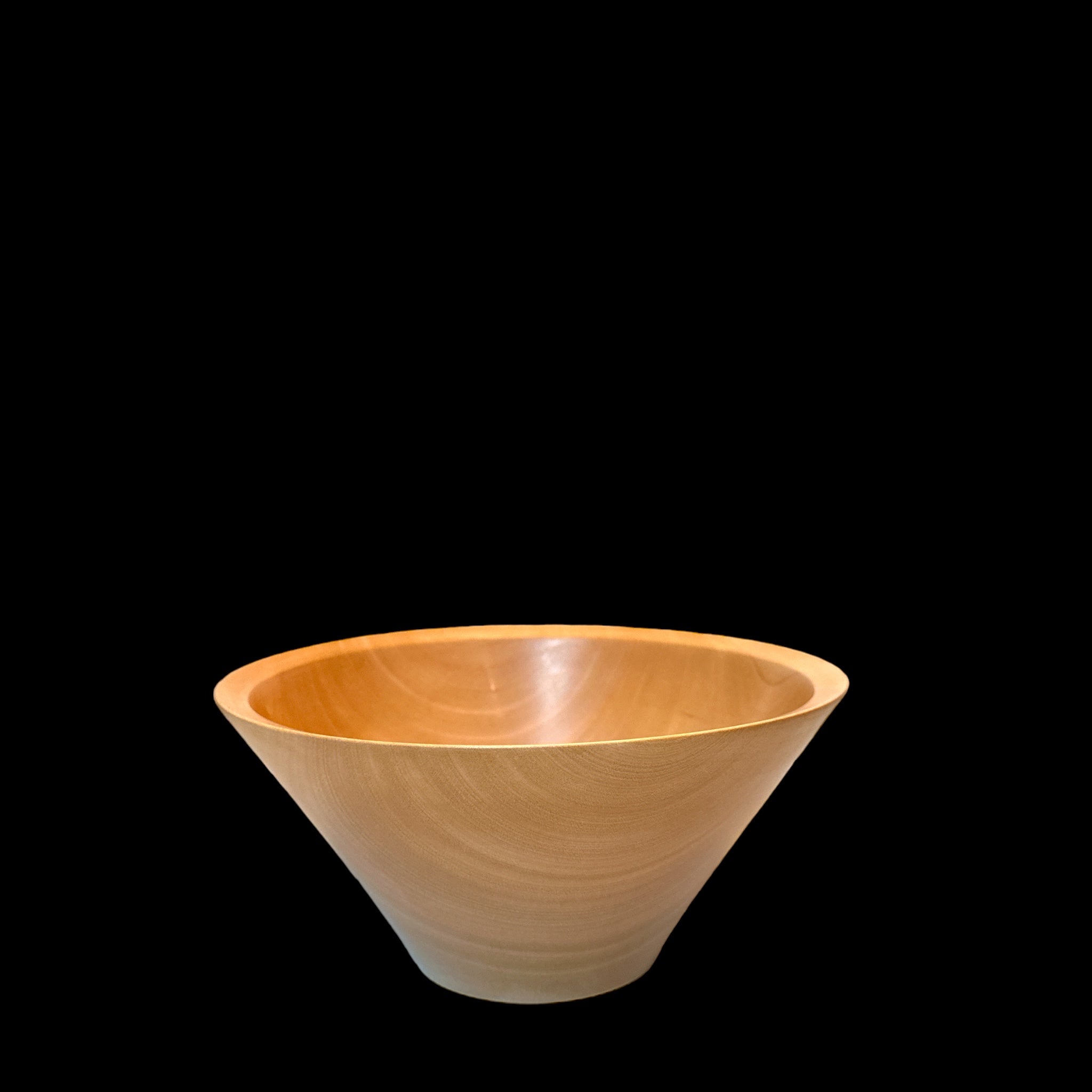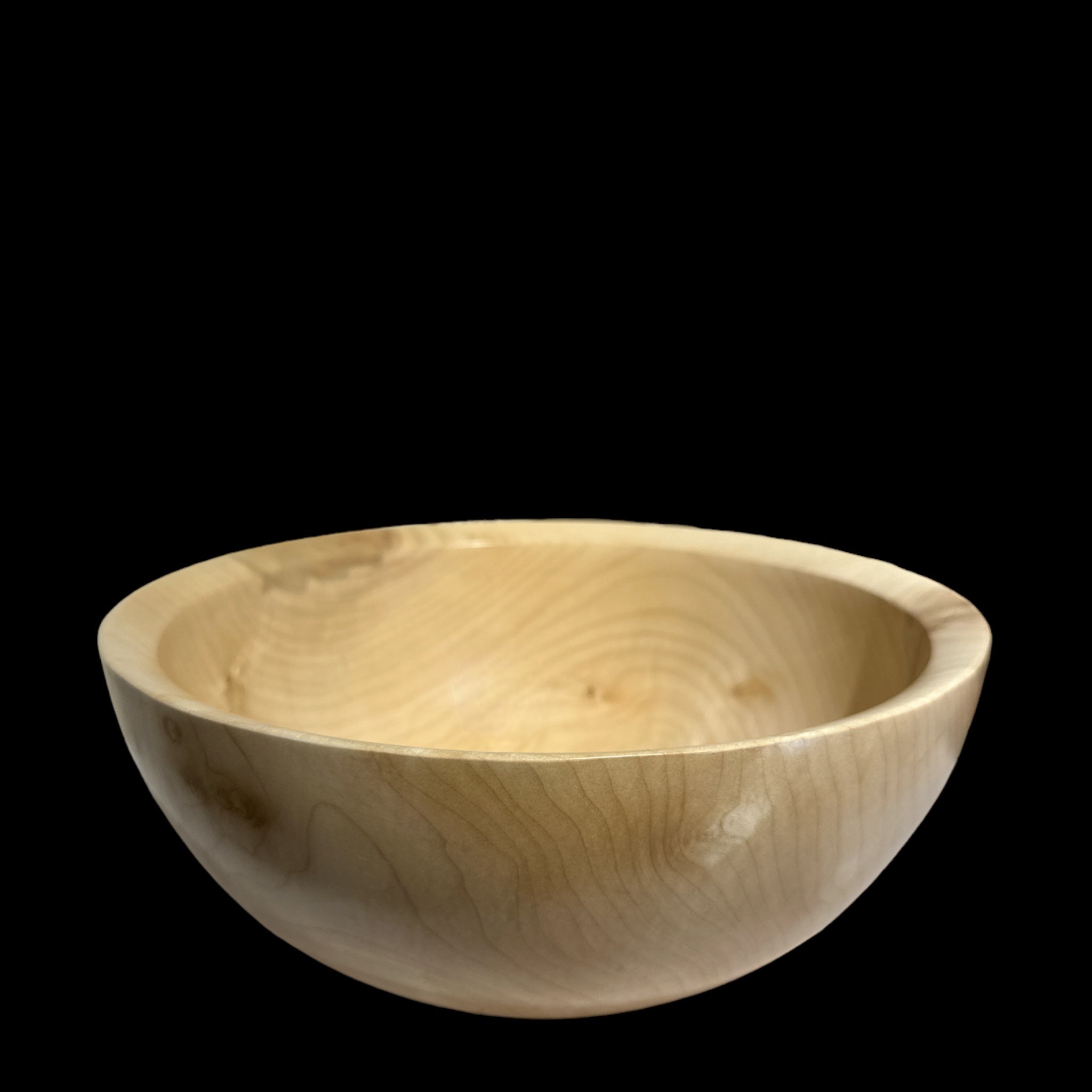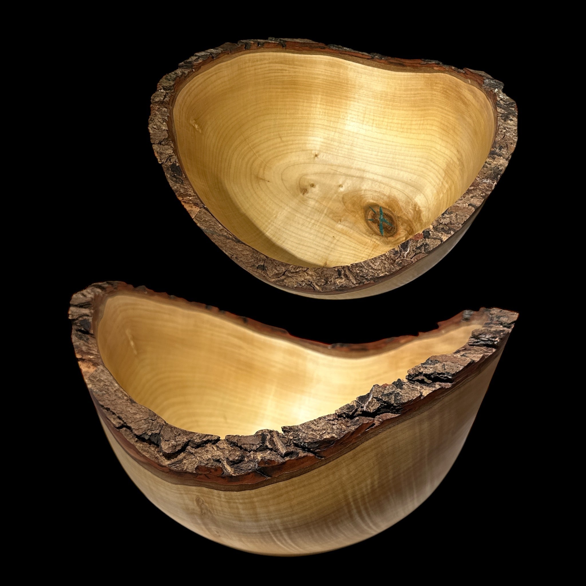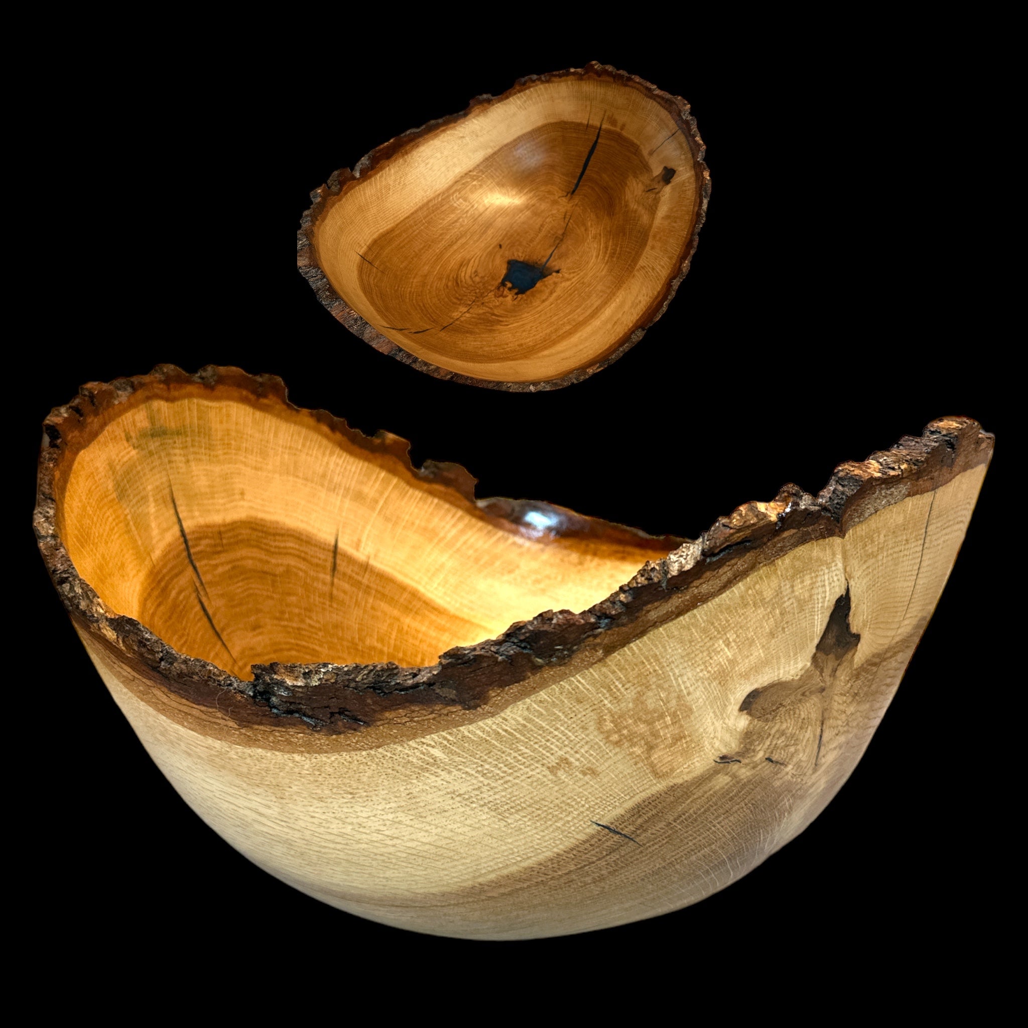 He works with all natural wood from the island such as oak, maple, locust,Arbutus, cherry,etc. Someone has a downed tree or wants their apple tree removed, Harvey is there to pick it up and turn it on his lathe. Before he can turn it he has to run it through a bandsaw and carve out something to work with. Then the wood goes into a drying room for up to one year.